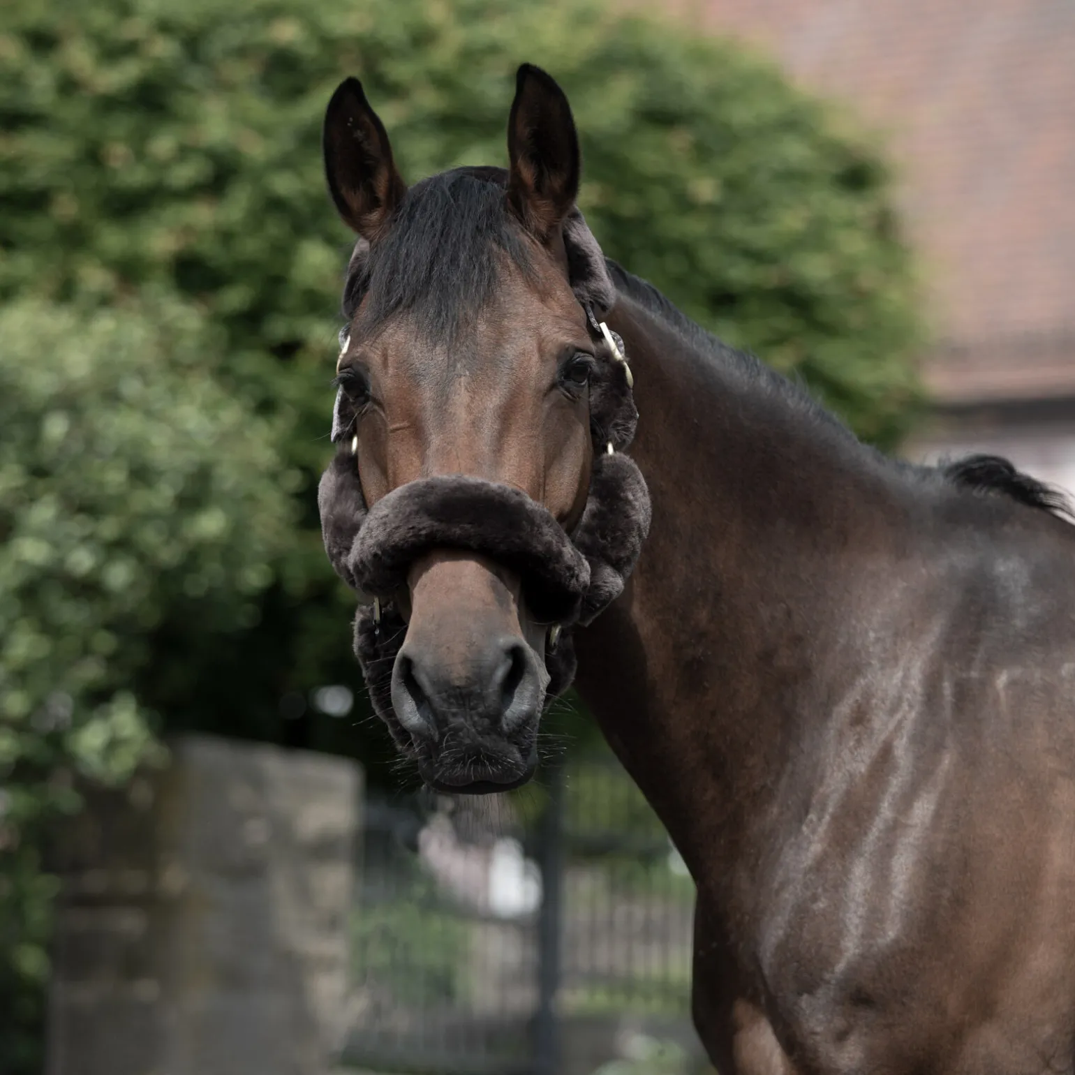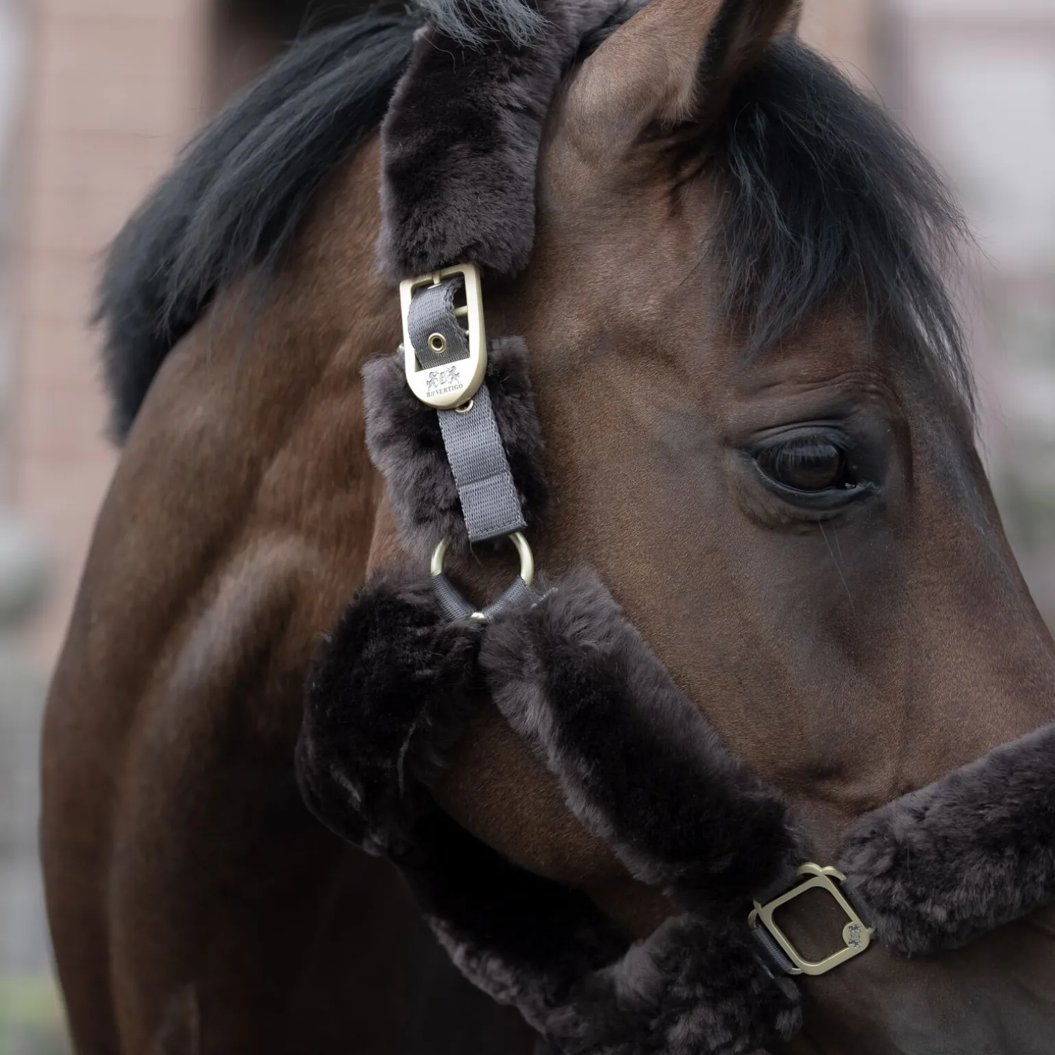 B Vertigo Tremblant grime er heldekket med luksuriøs, ekte saueskinn for å svøpe hestens hode i komfort, og gi det ultimate klassiske utseendet.Spenner ved nakken justeres for ideell passform, og klips-krok som gjør den enkel å ta på.Messingspenner matcher pelsen perfekt og gjør utseendet komplett.