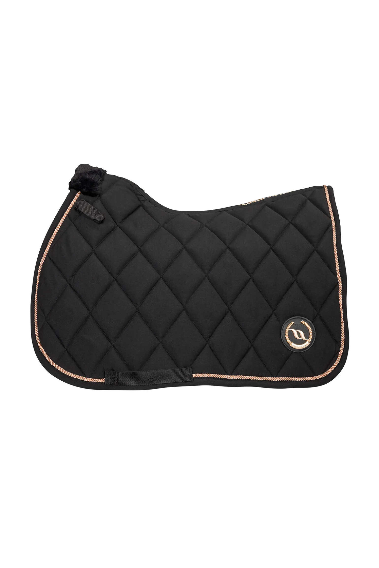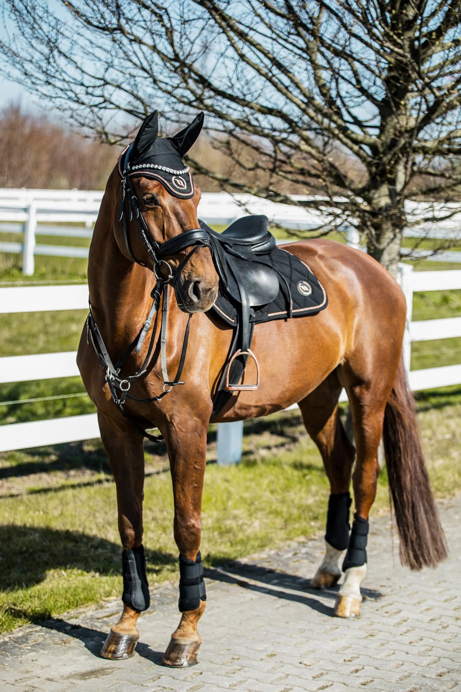 Den nye sjabraken i nydelig, melange-stoff er tilgjengelig i både brun og grå.Tvinnet snor langs kanten og stilig uekte lær, samt metallskilt på venstre side.Dekorert med vår vinge-logo i børstet metall. Fuskepels over manken, og feste til D-ringer.Gode pusteegenskaper og god fukthåndtering.Fyll laget av høykvalitets polyfyll og støtabsorberende skum.