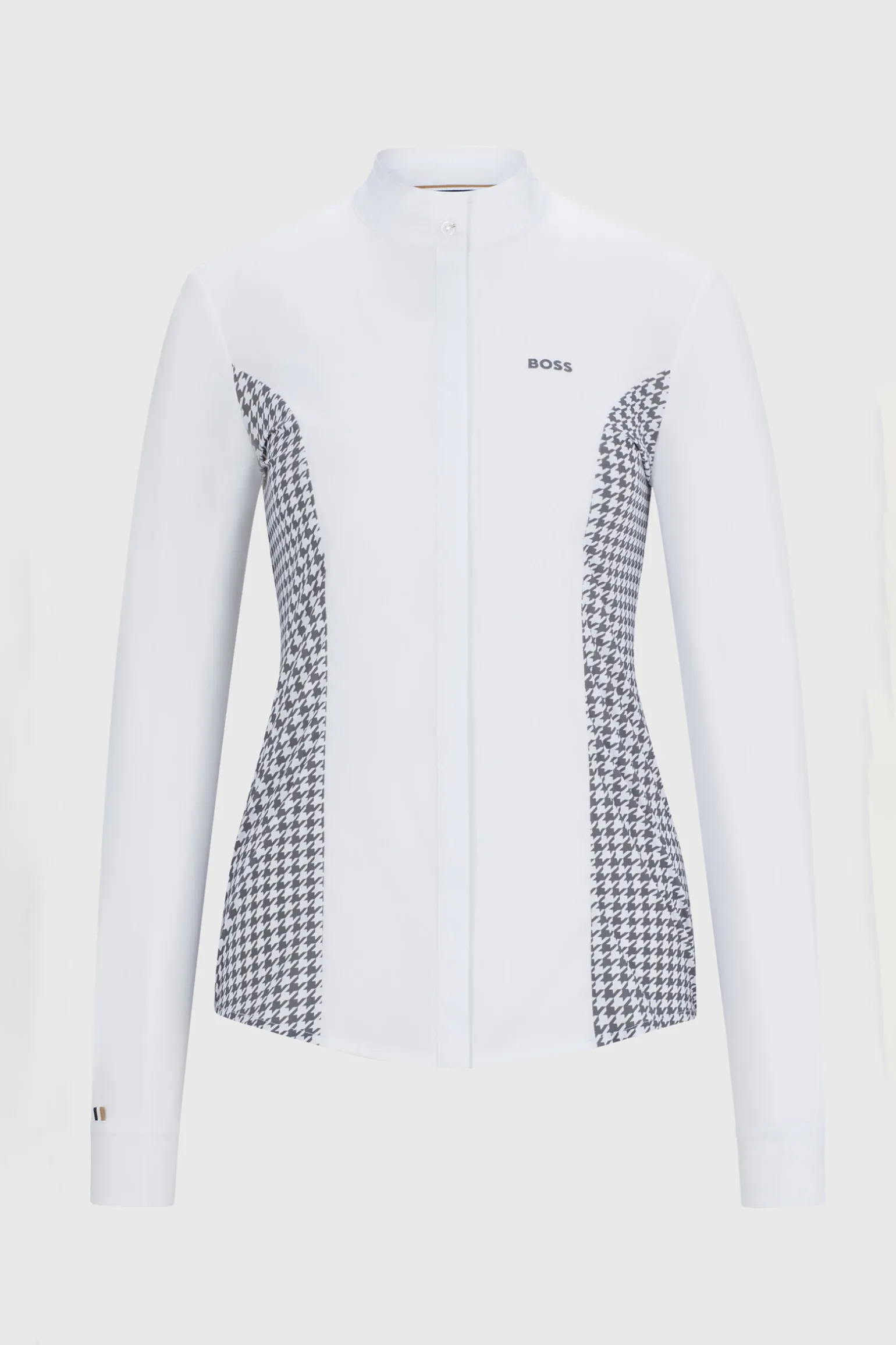 Sporty, elegant showskjorte i BOSS-stil med signaturknappdetalj på kragen, lite signaturstripeflagg på høyre arm over mansjetten og BOSS-logo på venstre bryst. Kragen er laget som et dobbelt lag, og skjorten har en sideinnsats i grå Houndstooth. Midtdelen av blusen er laget av bomullstretch. Resten er laget av svært elastisk funksjonelt jerseystoff.