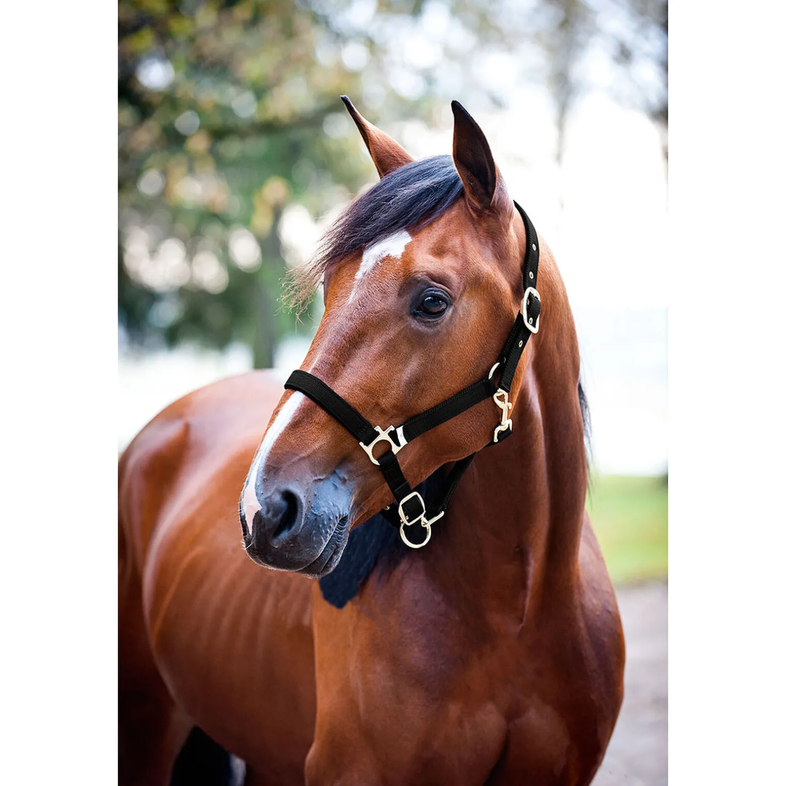 Nylongrime med justering på hakereimen. Karabinkrok ved kjeven for enkel åpning. Nese- og nakkereimer fôret med semsket kunstskinn.