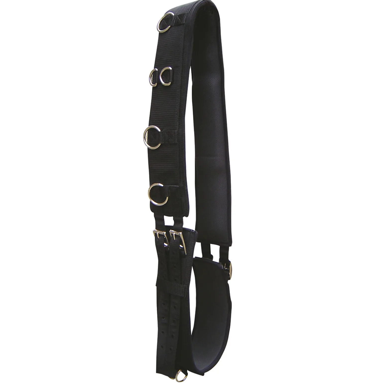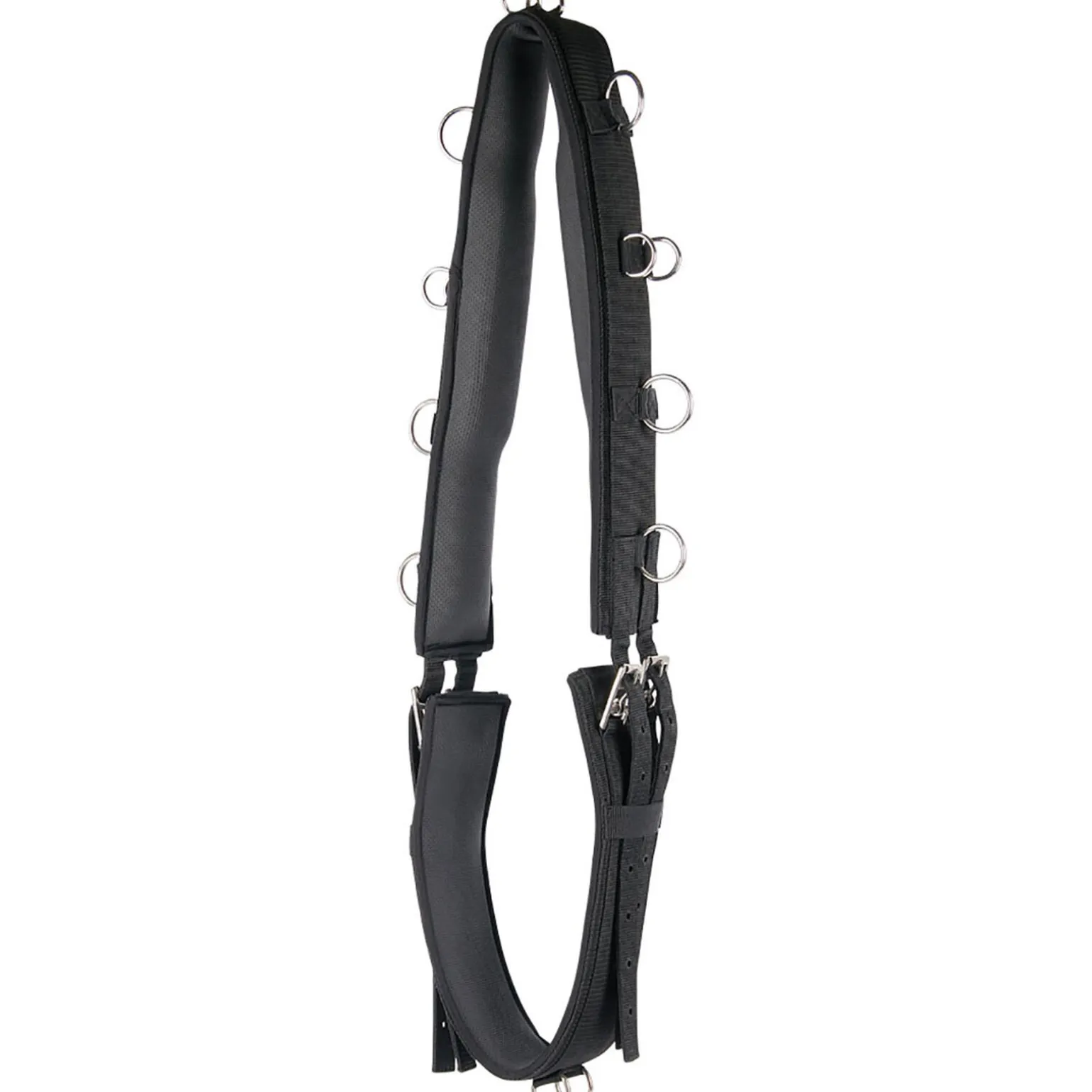 Luksuriøs longegjord med neoprenfôr. Gjorden har 12 ringer, 2 av dem er på undersiden. Justerbar på begge sider av gjorden med rullespenner.
