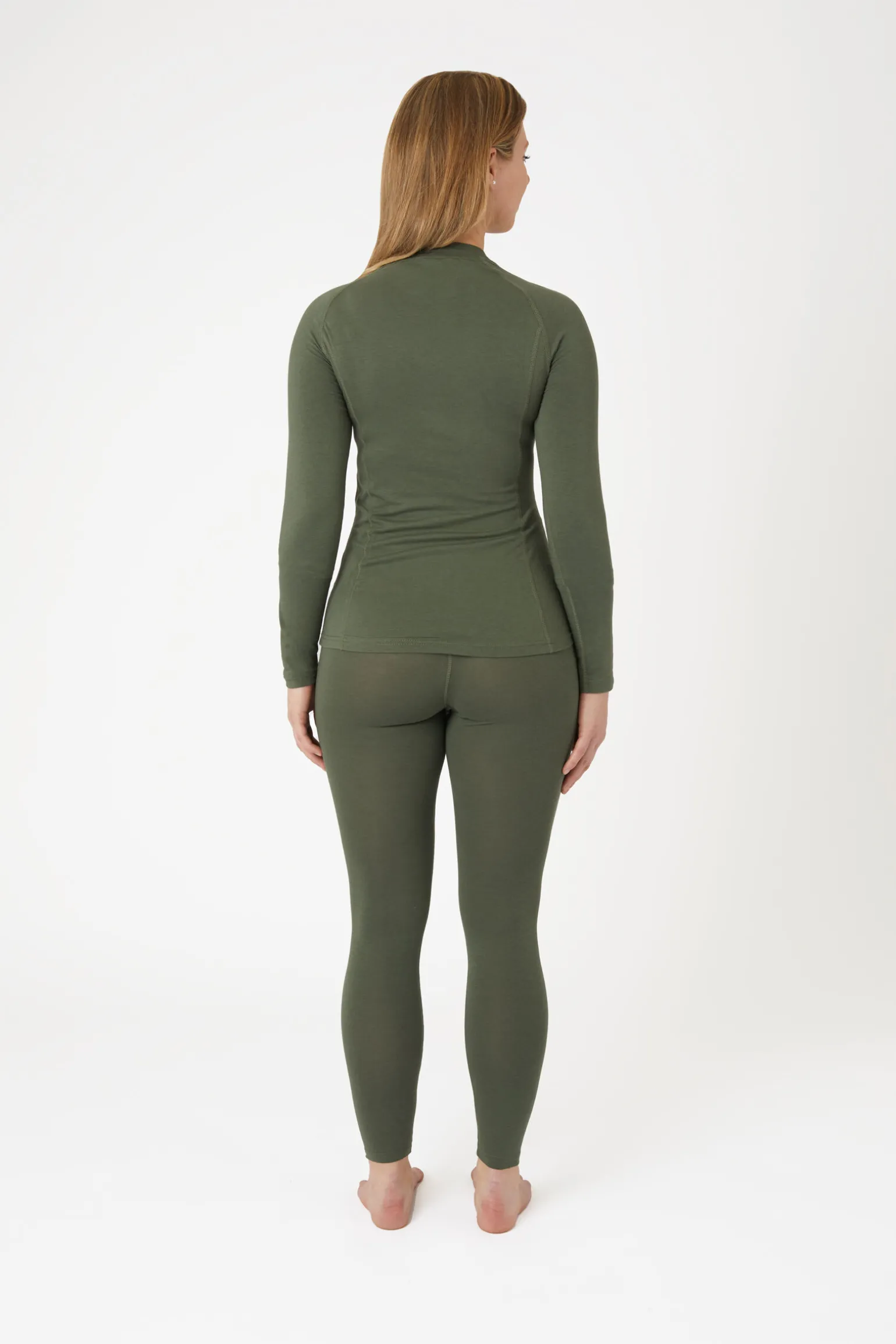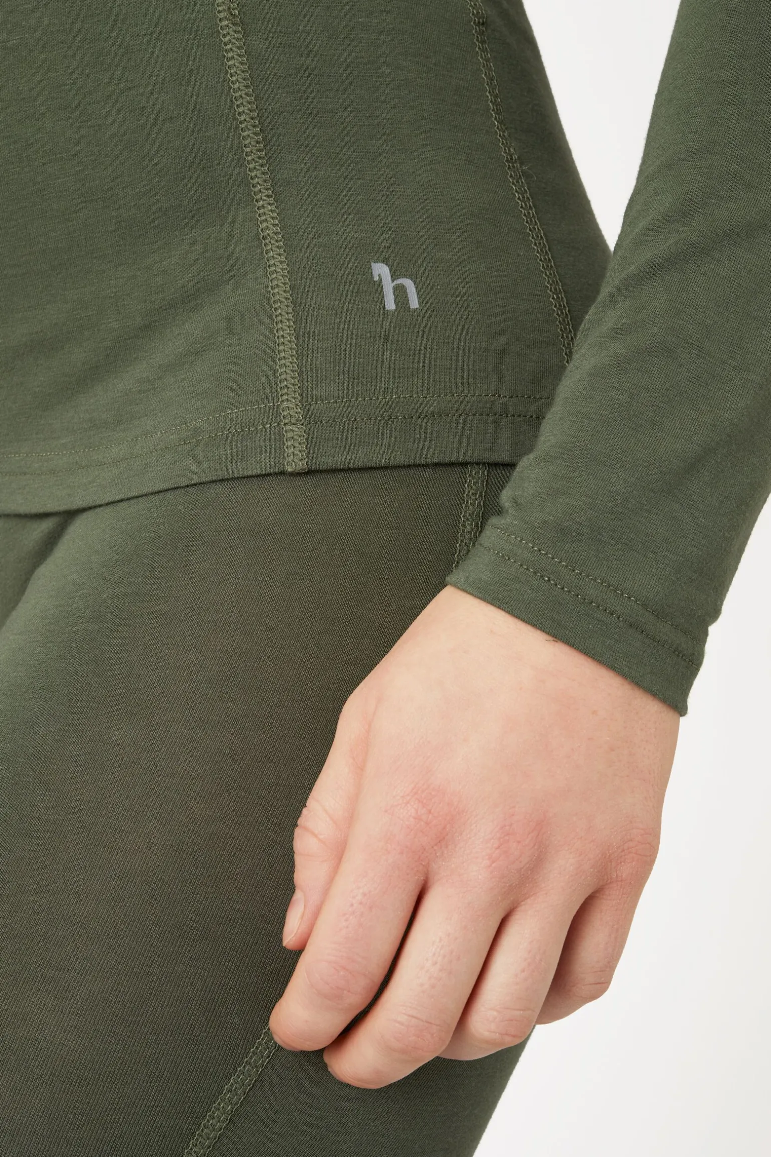 Horze Bamboo undertøy-sett er mykt, komfortabelt og delvis laget av bærekraftig materiale.Den langermede skjorten med høy hals gir ekstra varme, og tightsen med høyt liv holder den på plass.Bruk dette settet under dine beste ridebukser og genser for å holde deg varm på kalde vinterturer eller stalldager.