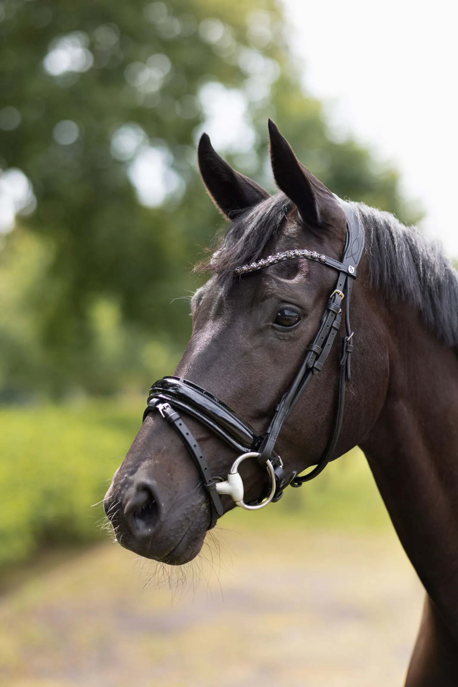 Det nydelige Horze Clermont hodelaget kommer med et iøyenfallende pannebånd med en rad av store krystaller i en myk U-form som fremhever den naturlige, fine formen på hestens hode.