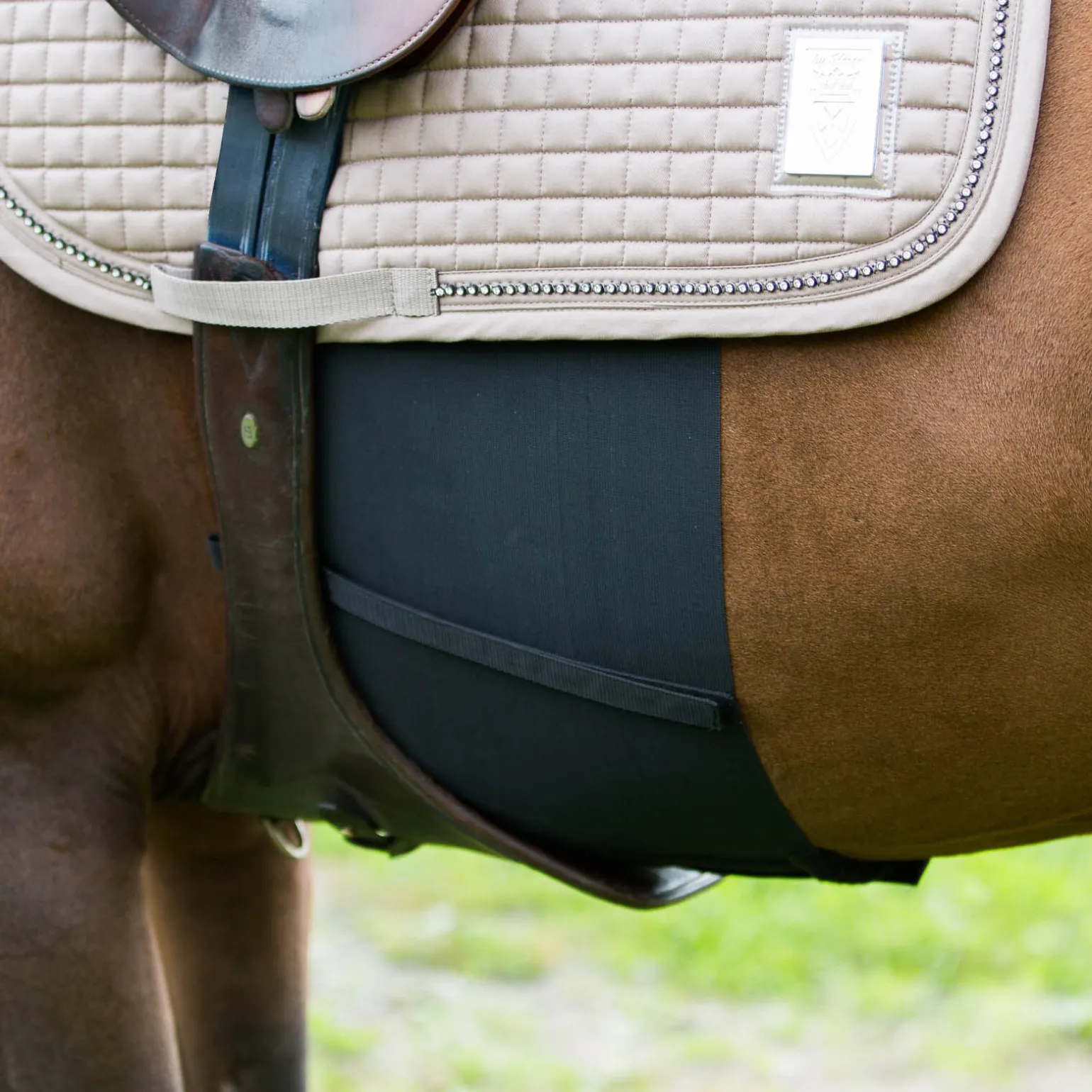 En komfortabel beskyttelse i lycra polyester som festes rundt magen til hesten, og beskytter og forebygger mot skader og irritasjoner fra sporene. Det myke stoffet gnager ikke, og gir ekstra beskyttelse når man hopper eller rir på tur. Borrelås og en enkel plastklips gjør den enkel å feste. Svart, elastisk materiale som beveger seg enkelt og komfortabelt med hesten.