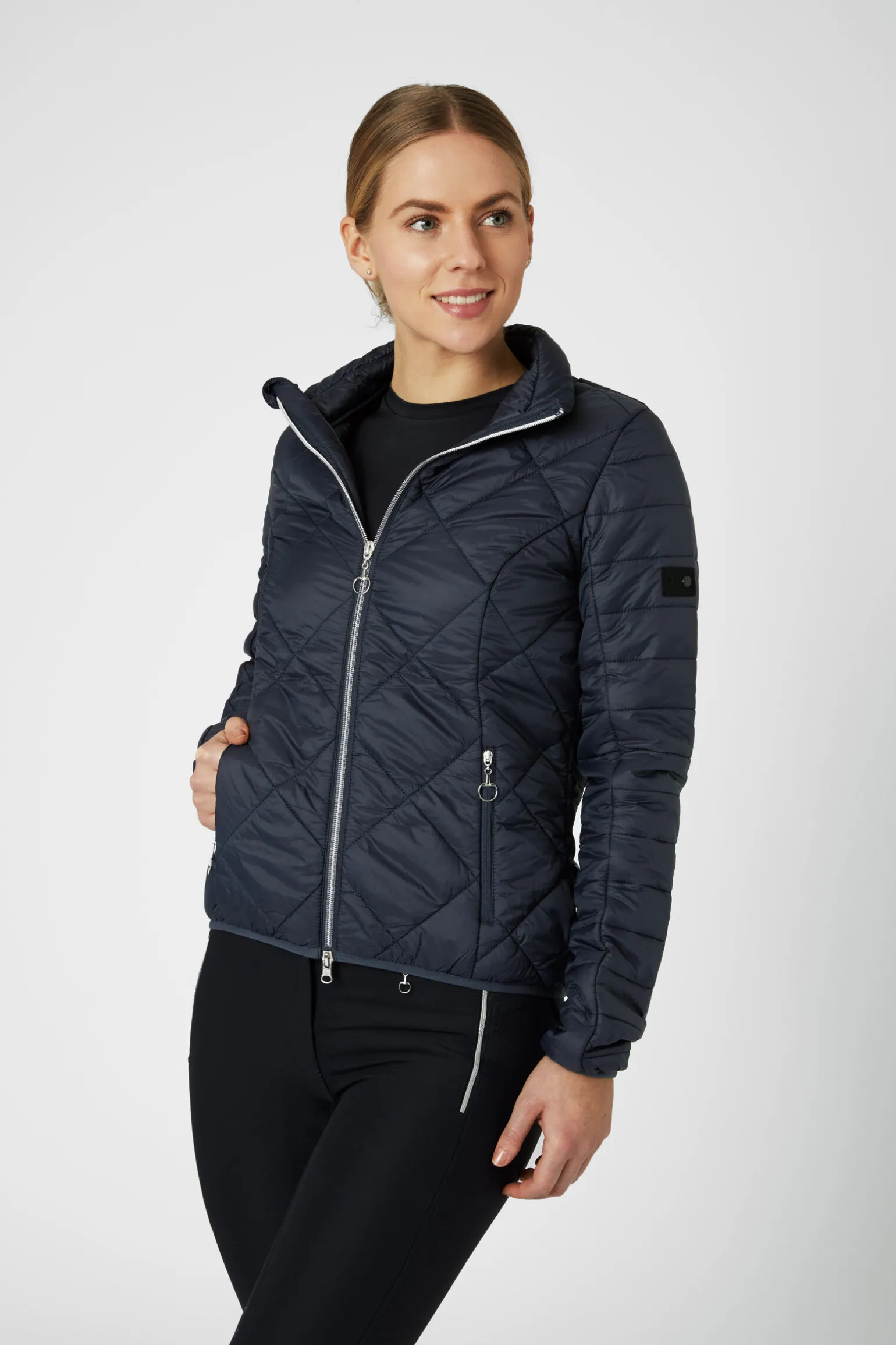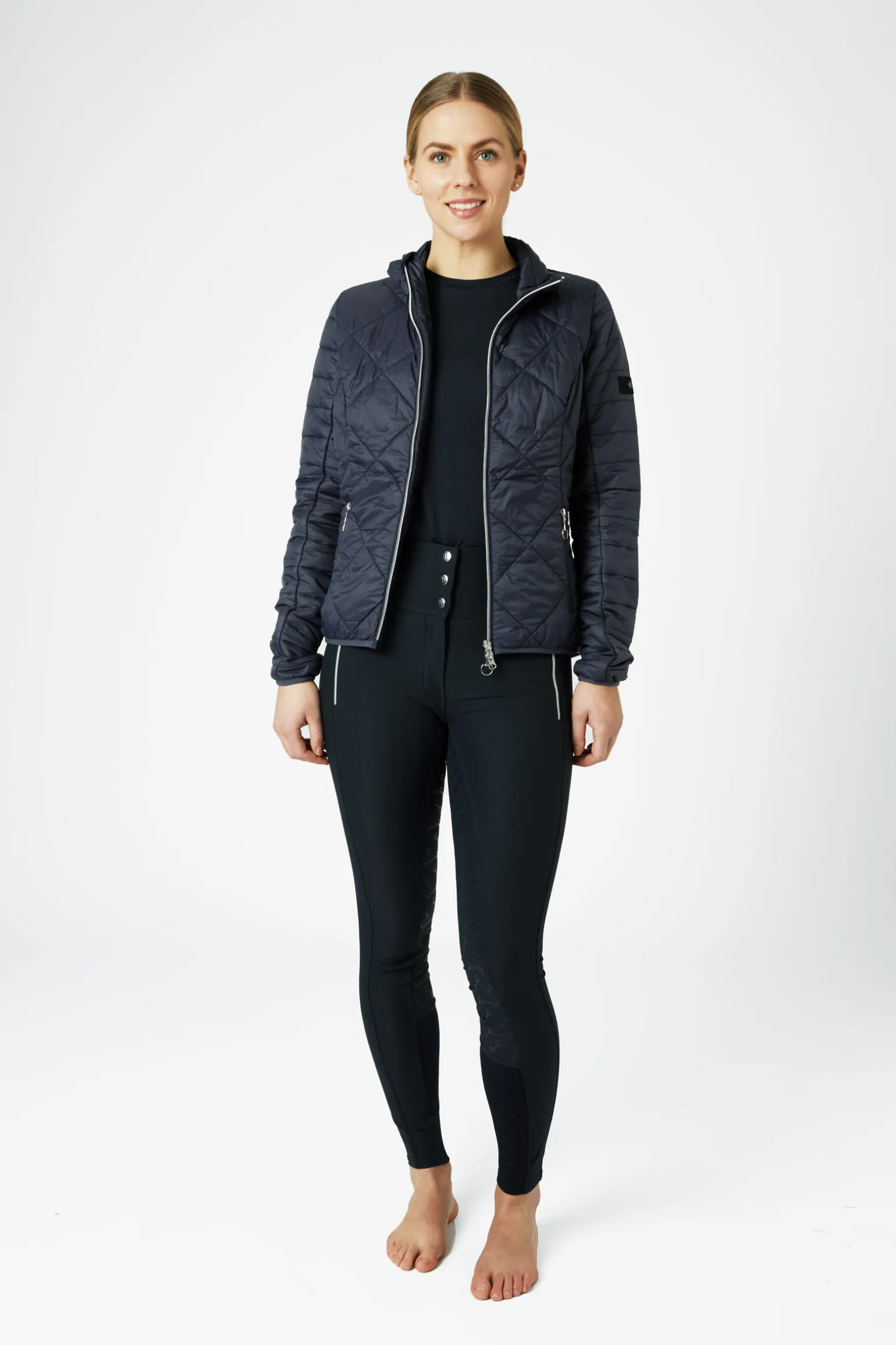 Tynn polstring med pustende stretch-paneler på ryggen og bak på ermene gir en perfekt passform på denne nydelige, lette jakken. Perfekt å bruke mellom årstider og på kjølige morgenritt, da denne jakken har lett fôr som varmer komfortabelt, uten å gjøre det for varmt. Den stilige vatterte stilen har et nydelig, smalt liv.
