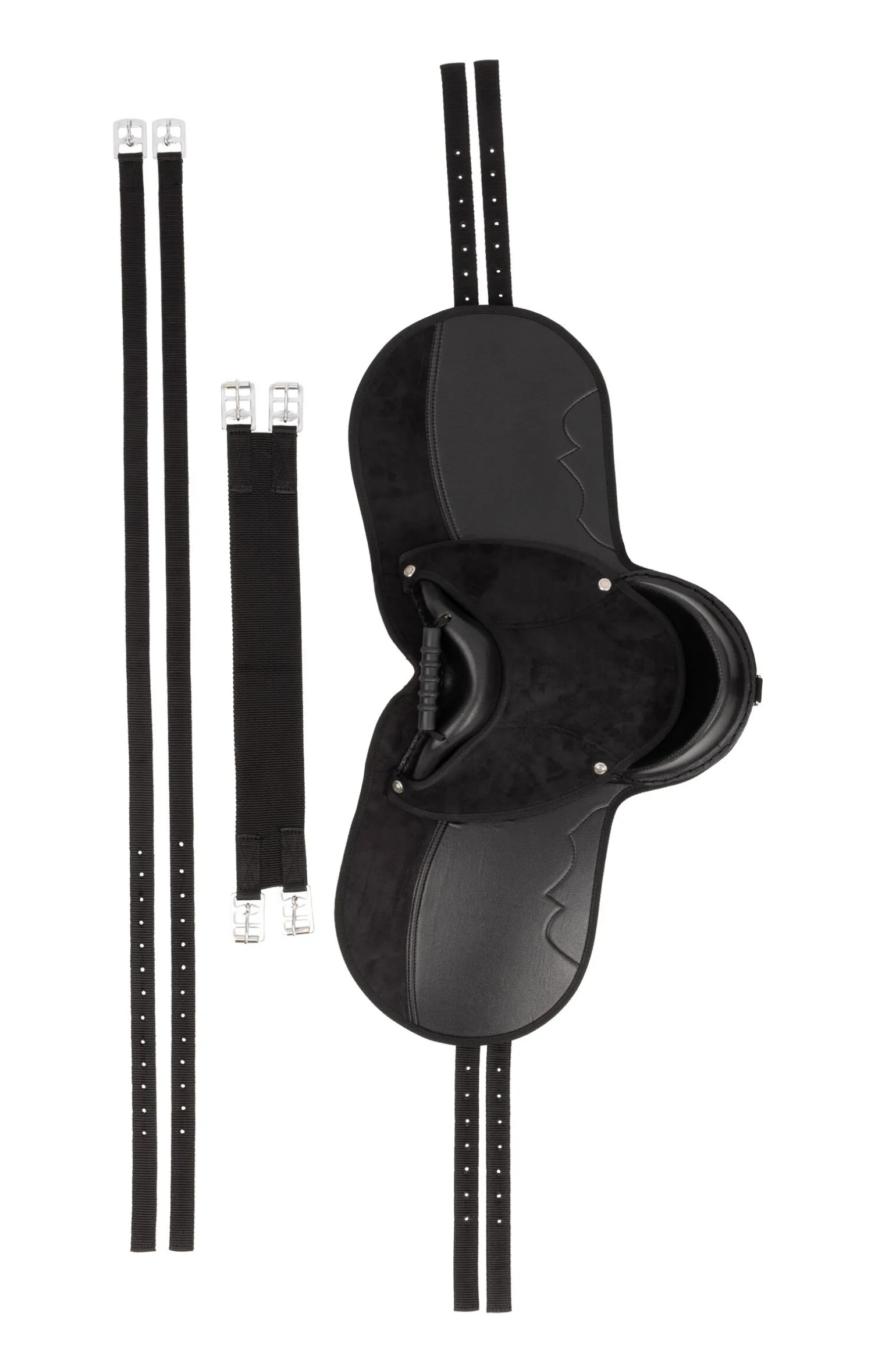 Denne komfortable salen er laget med et hjelpende håndtak foran for å gi ekstra trygghet.Flyttbare paneler med borrelåsfester gjør at salen kan justeres perfekt til din ponni.Semsket innside forhindrer gnag og holder salen på plass.Mesh-materiale på utsiden er også ekstra pustende og forhindrer at fukt samles.