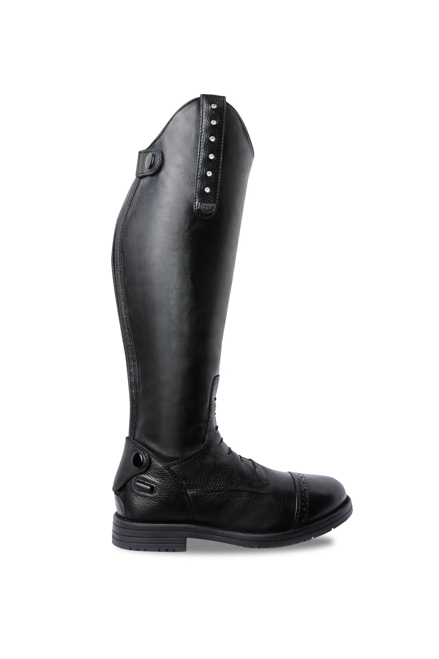Denne nydelige ridestøvelen til barn kommer med to utskiftbare kanter.På dager du vil føle deg litt ekstra kan du gå for krystallkanten.Den enkle er et perfekt hverdagsvalg.Stilige punkt-dekorasjoner på tåhetten og elastiske lisser foran gir et stilig, men samtidig elegant utseende.Baksiden kommer med elastiske paneler langs den robuste YKK-glidelåsen, for å sikre god brukskomfort.Glidelåsbeskyttelse i topp og bunn lukkes med knapper.Støvlene kommer også med sporestøtte for en sikker støtte av sporene når det trengs.