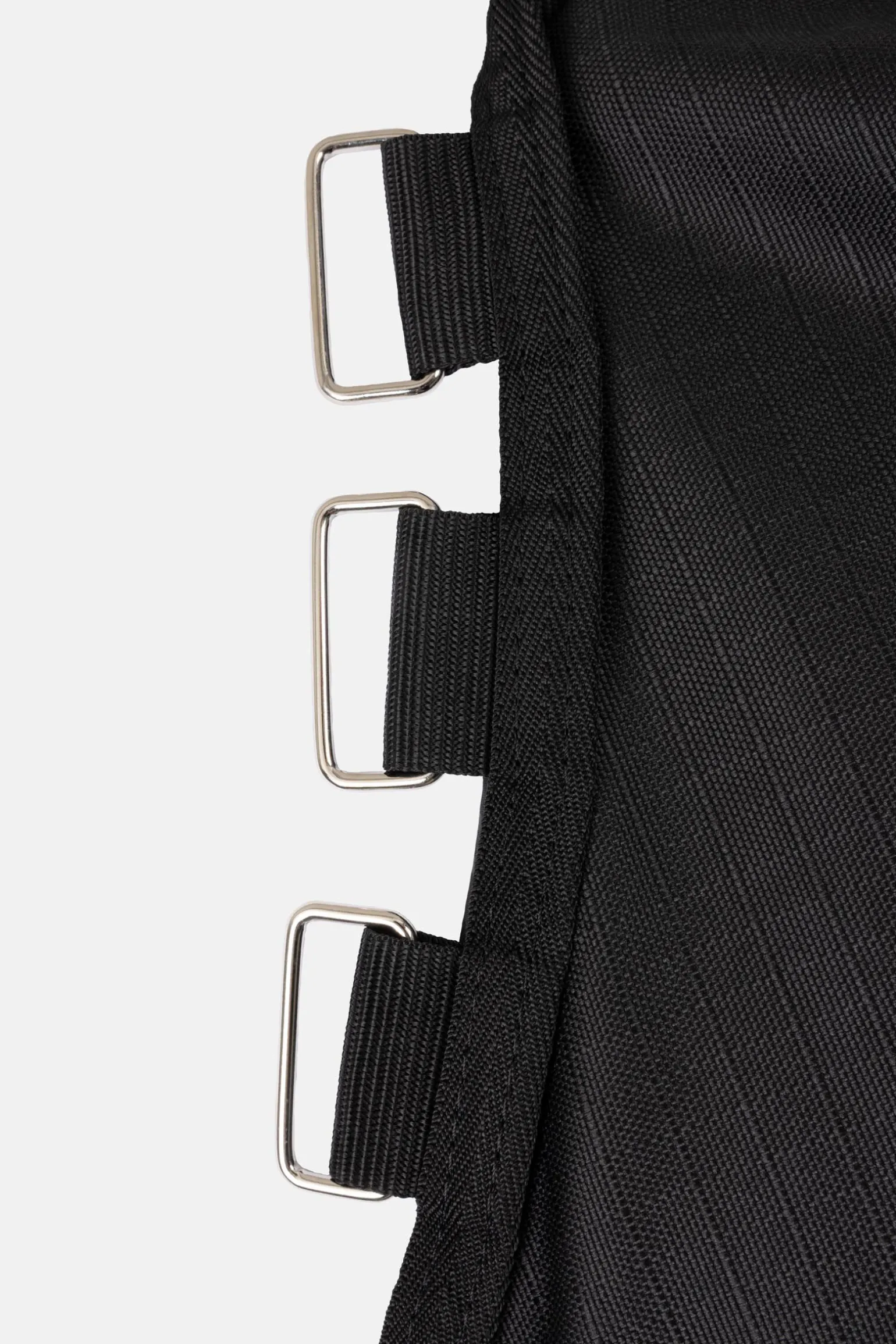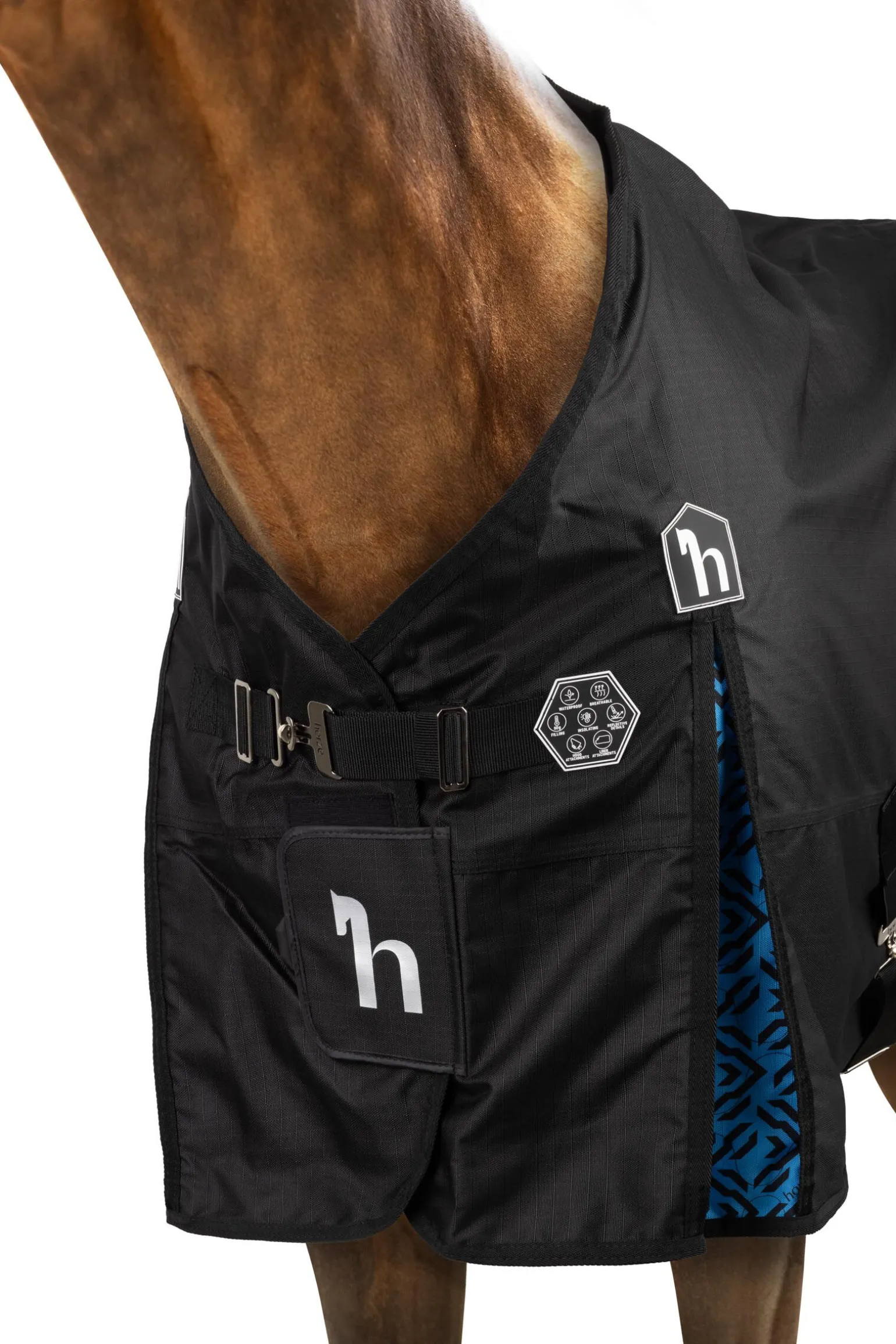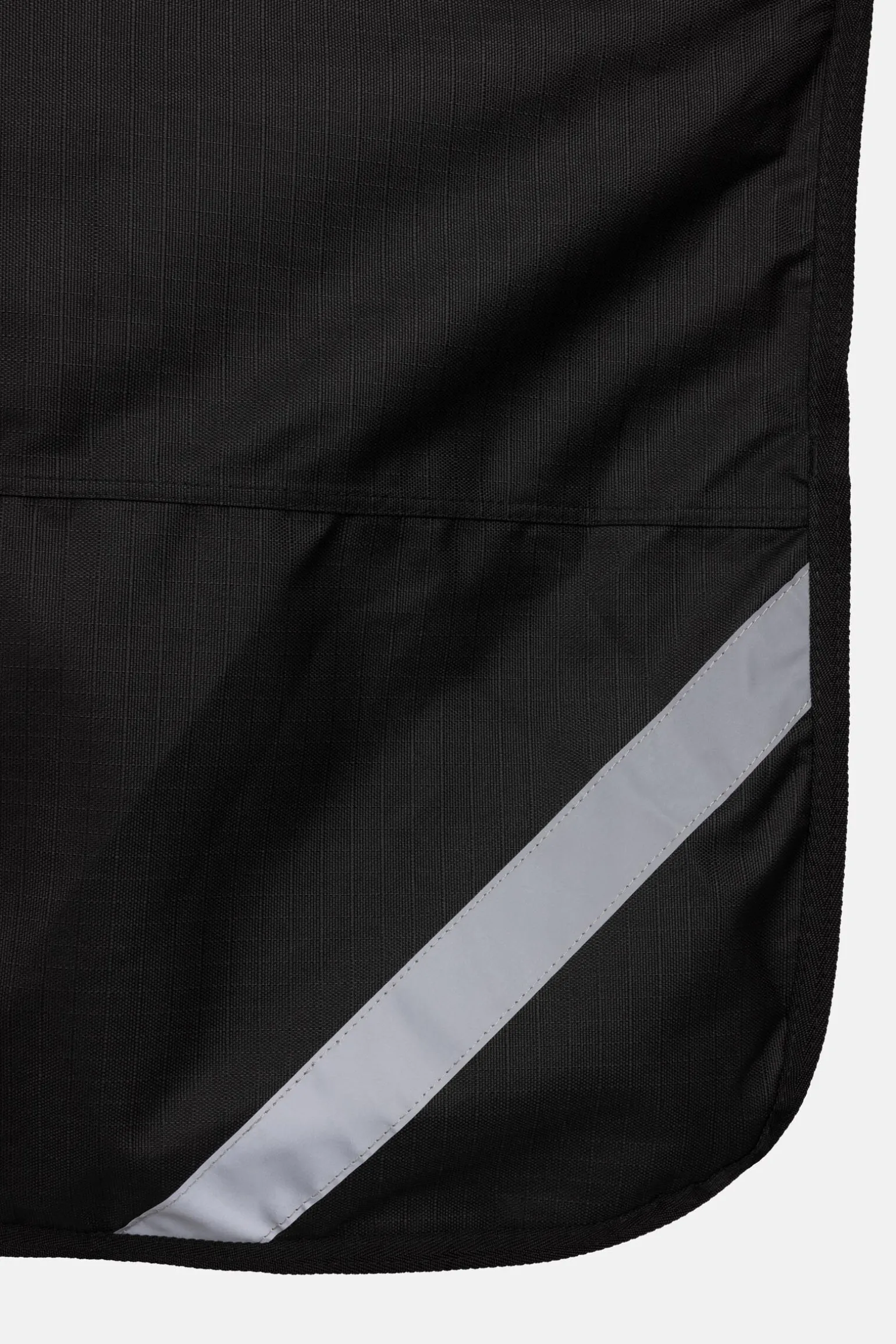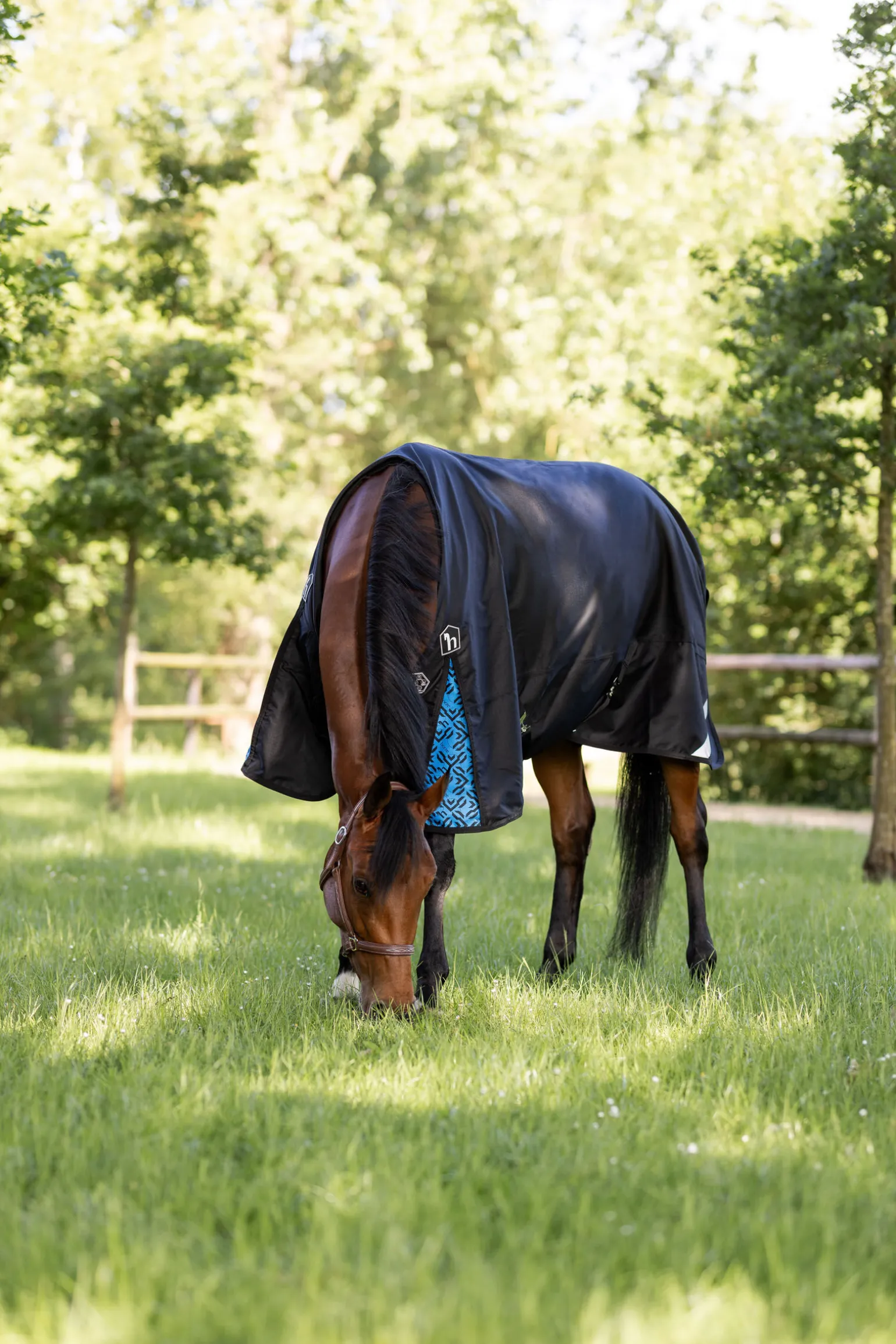Dette utedekkenet er svært sterkt og holdbart takket være utsiden i 1200D polyester. Det er designet for å brukes med de matchende 50 gram og 100 gram fleece-linere (#24049 + #24398), noe som gir deg muligheten til å justere hvor varm hesten din skal være. Dekkenet kommer med fester til hals og liner på halsen, noe som gir ekstra allsidighet. Med en stor haleflapp og reflekterende striper bak sikrer det maksimal beskyttelse og synlighet. Kryssgjordene med T-spenner og strikk sammen med beinsnorer med klips får du en trygg og justerbar passform. Bogsplittene gir bevegelsesfrihet, og sikrer hestens komfort. Det nye, justerbare lukkesystemet foran med 1 T-spenne er lettvint og praktisk.