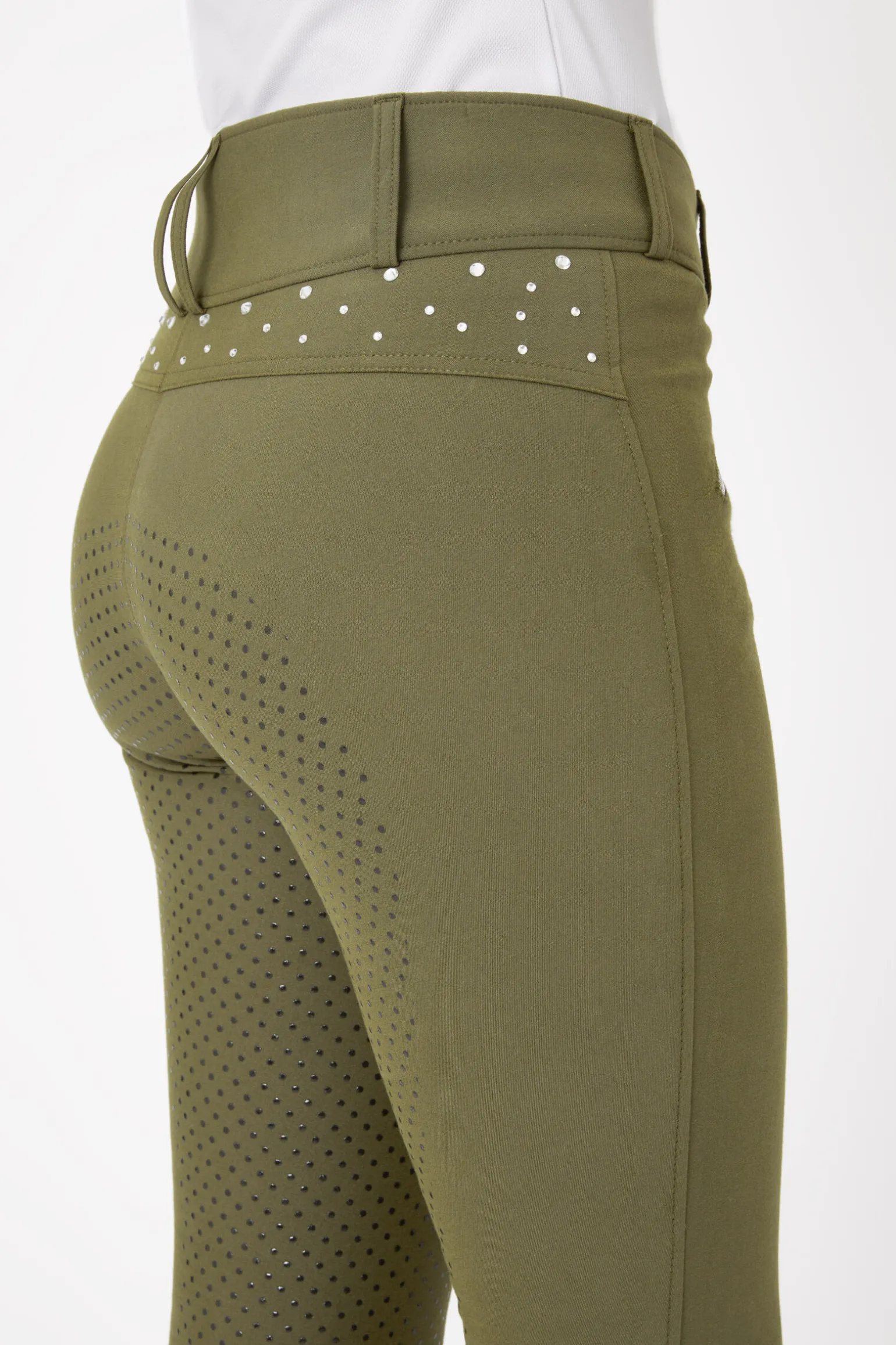 Disse rimelige ridebuksene er laget med et høyt liv som er flatterende og holder dem på plass.Helforsterket med silikon slik at du holder deg trygt i salen.Elastiske ben nederst passer perfekt i dine favoritt-ridestøvler.Nydelige pyntesteiner langs baksiden er en diskret, glitrende detalj.