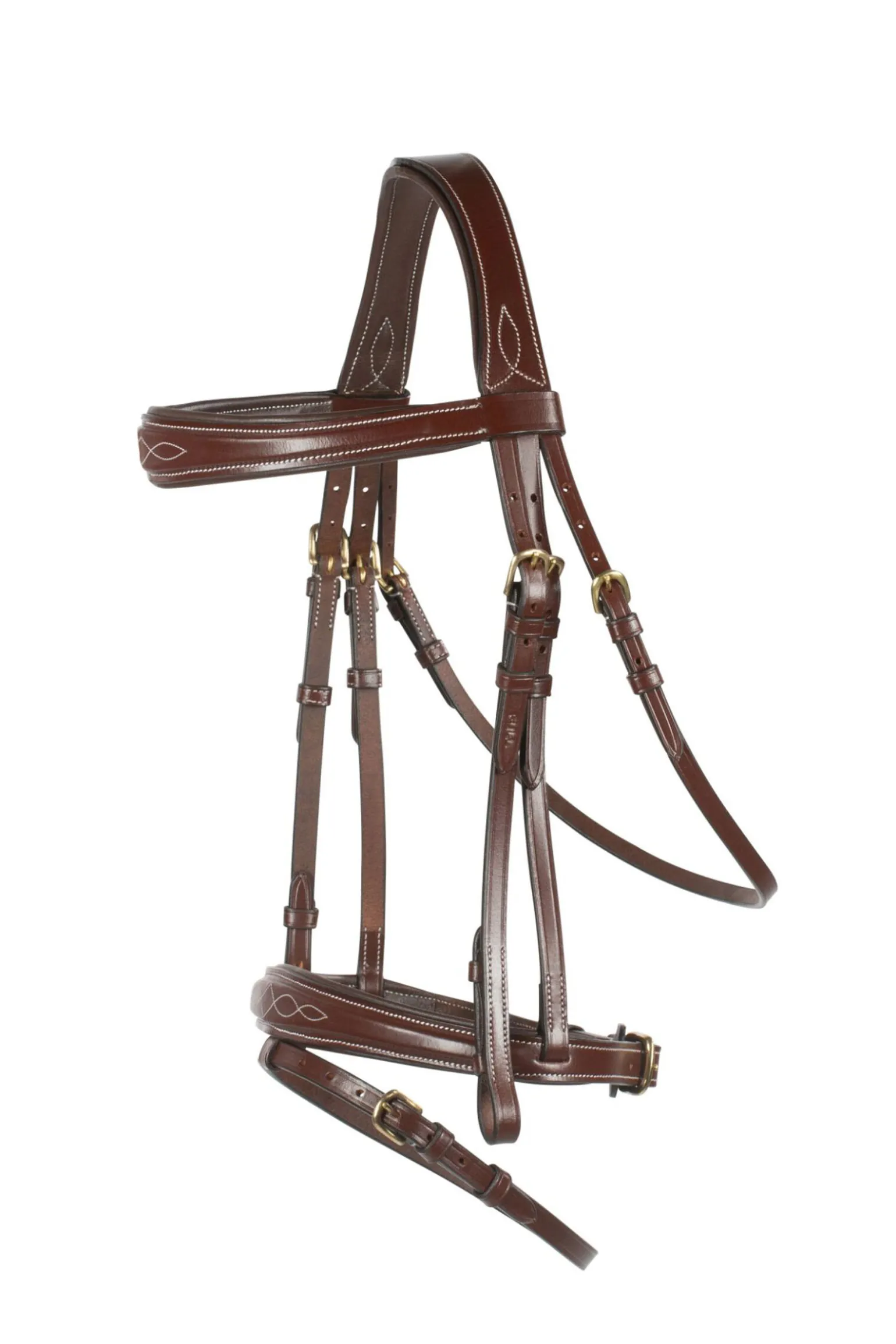 Dette elegante hodelaget kommer med dekorativ søm på nesereim og pannebånd.Den myke heldekkende polstringen gjør det komfortabelt på hestens hode.Gummidekte tøyker sikrer at du ikke mister grepet.Messingspenner gir dette hodelaget det perfekte preget.