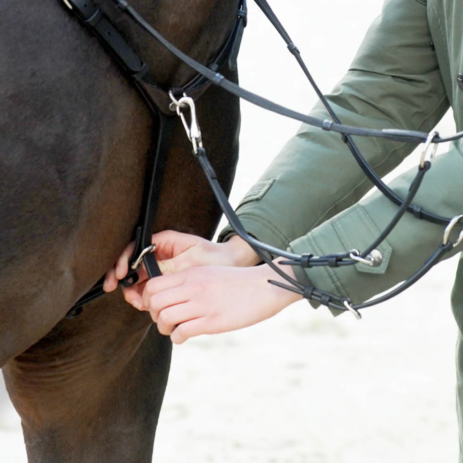 Dette «EveryDay» fortøyet i oljet lær er et trepunktsfortøy med sidefester til salen.Mykt fôr over manken for å forhindre gnag.Doble elastiske innlegg langs skulderen gir nok bevegelsesfrihet for hesten, uten at den lar salen skli bakover.En spesiell egenskap er at brystgjordstroppen kan justeres foran på brystet, slik at du ikke trenger å holde på under magen på hesten.Festes i gjorden med en lærløkke eller en avtakbar karabin.På denne måten har du færre løkker og spenner, noe som reduserer risikoen for skader.Spennene har myke lærbeskyttere.Hva er oljet lær?Oljet lær er vegetabilsk garvet og har sin naturlige overflate.Det er behandlet med oljer av høy kvalitet i garveprosessen, noe som gjør det svært mykt samtidig som det er avvisende mot vann og smuss.Dette holdet læret mykt, robust og lettstelt over lengre tid.