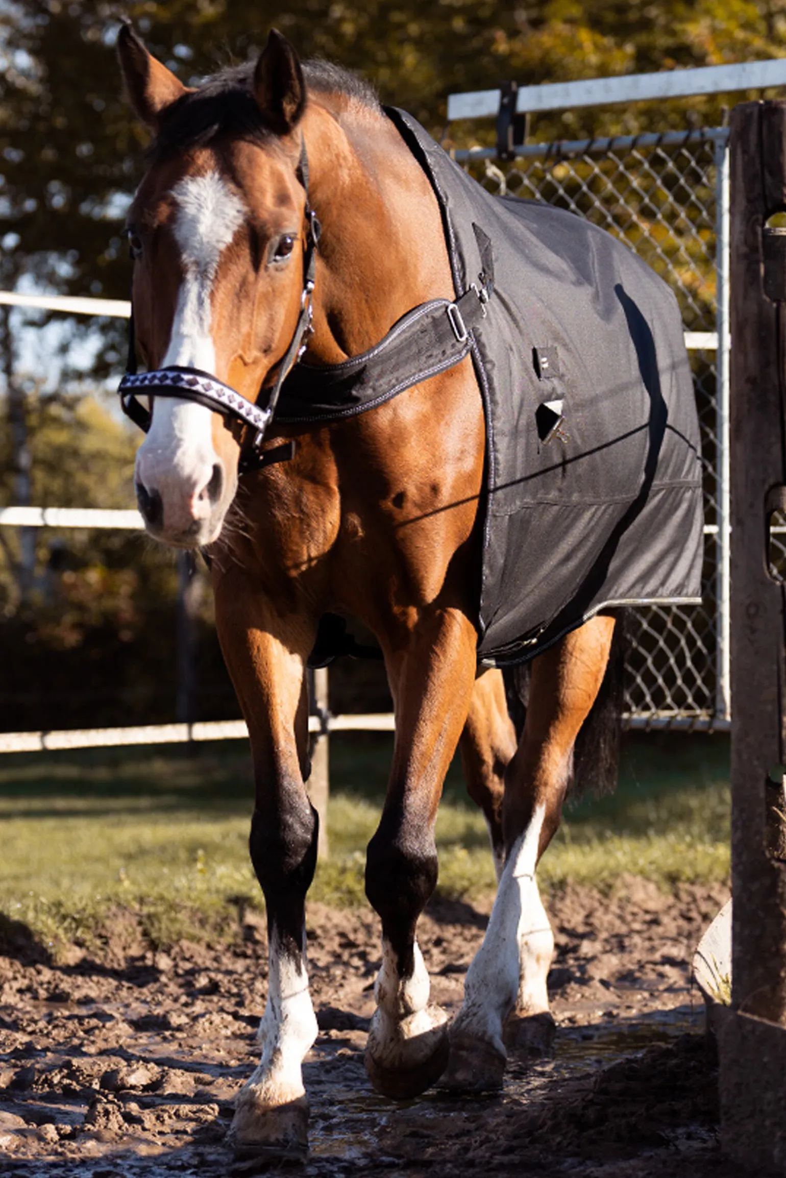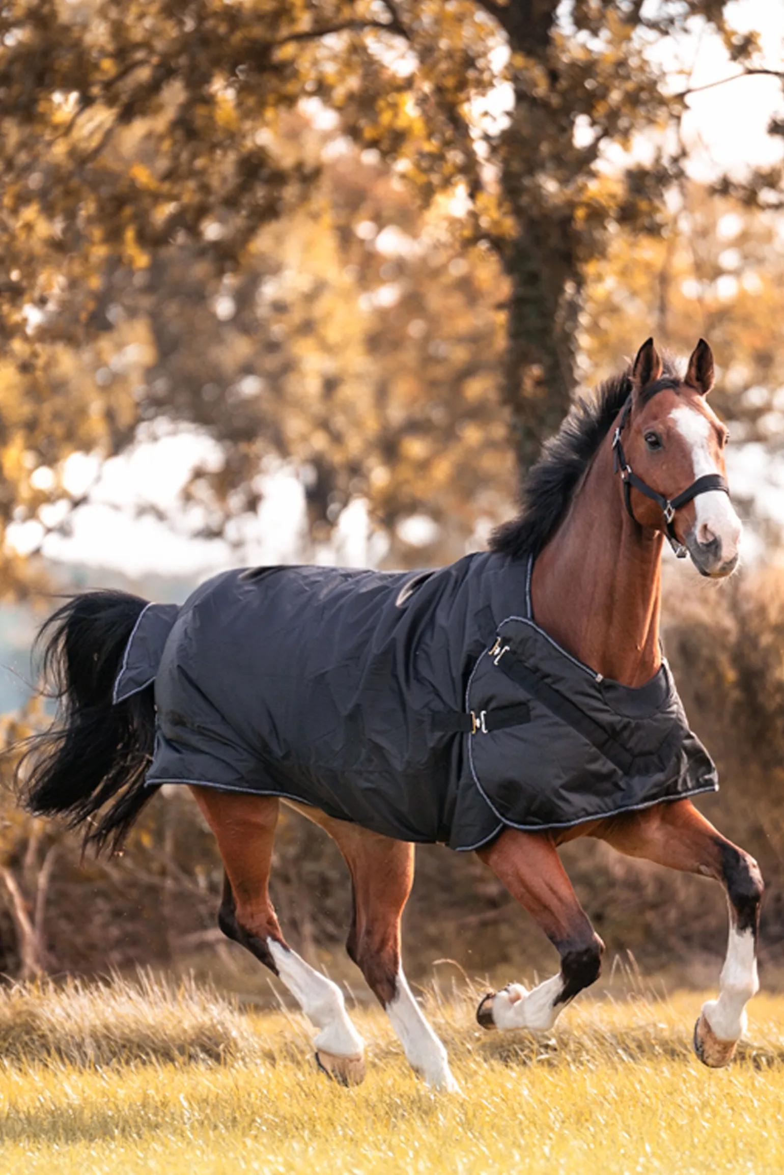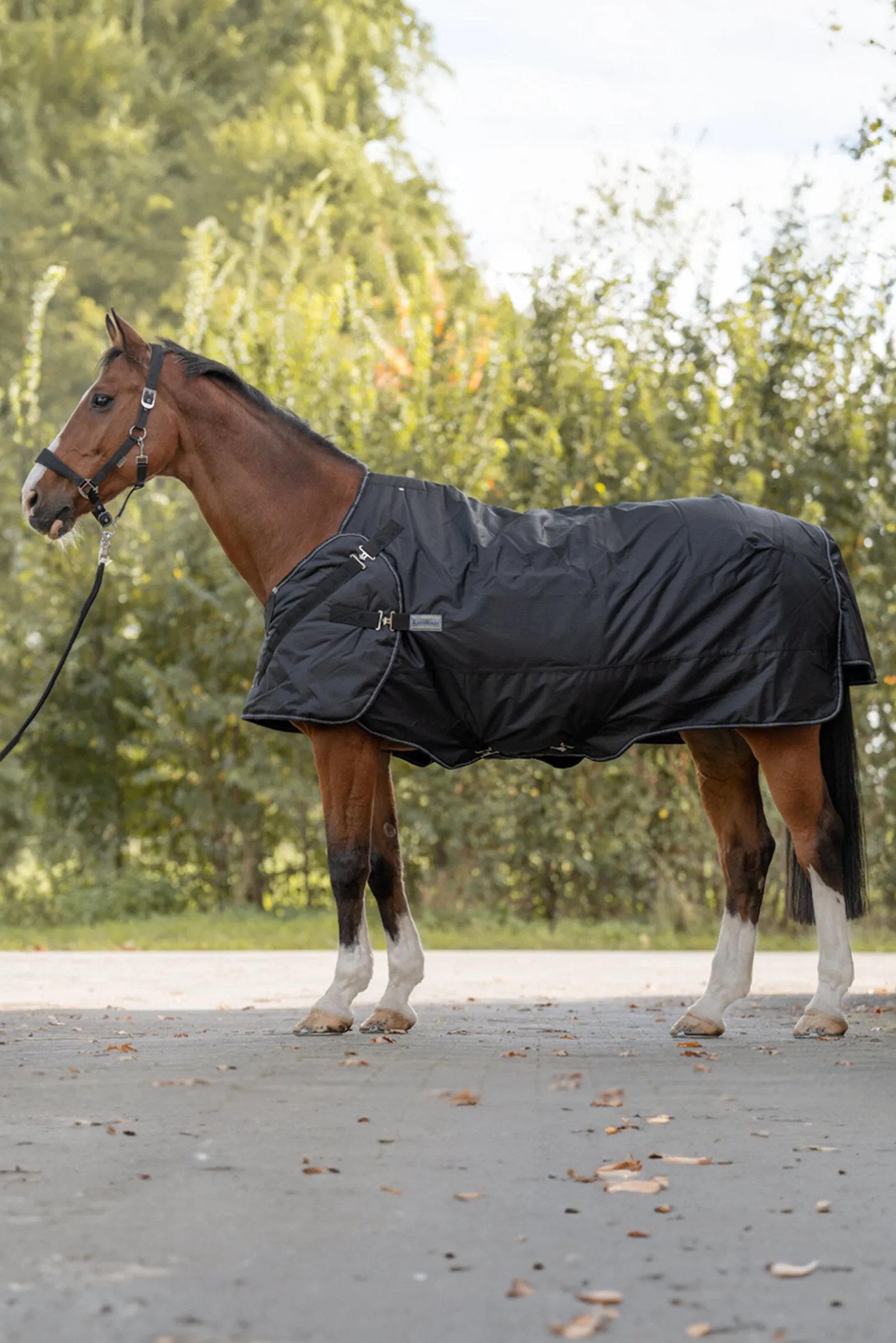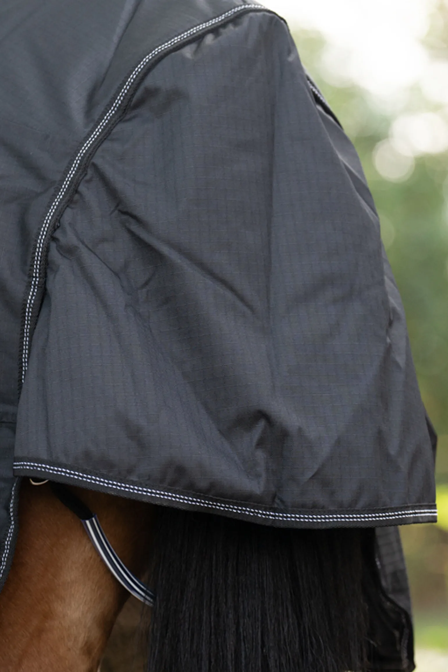 Takket være den raske og enkle utskiftingen av bryststroppen kan teppet Halifax brukes både som utedekken og som walker-dekken (utendørs). Det er to festemuligheter for bryststroppen: Den nedre festingen er spesielt egnet for smalere hester. Teppet Halifax 2-i-1 gir hesten din den bevegelsesfriheten den trenger