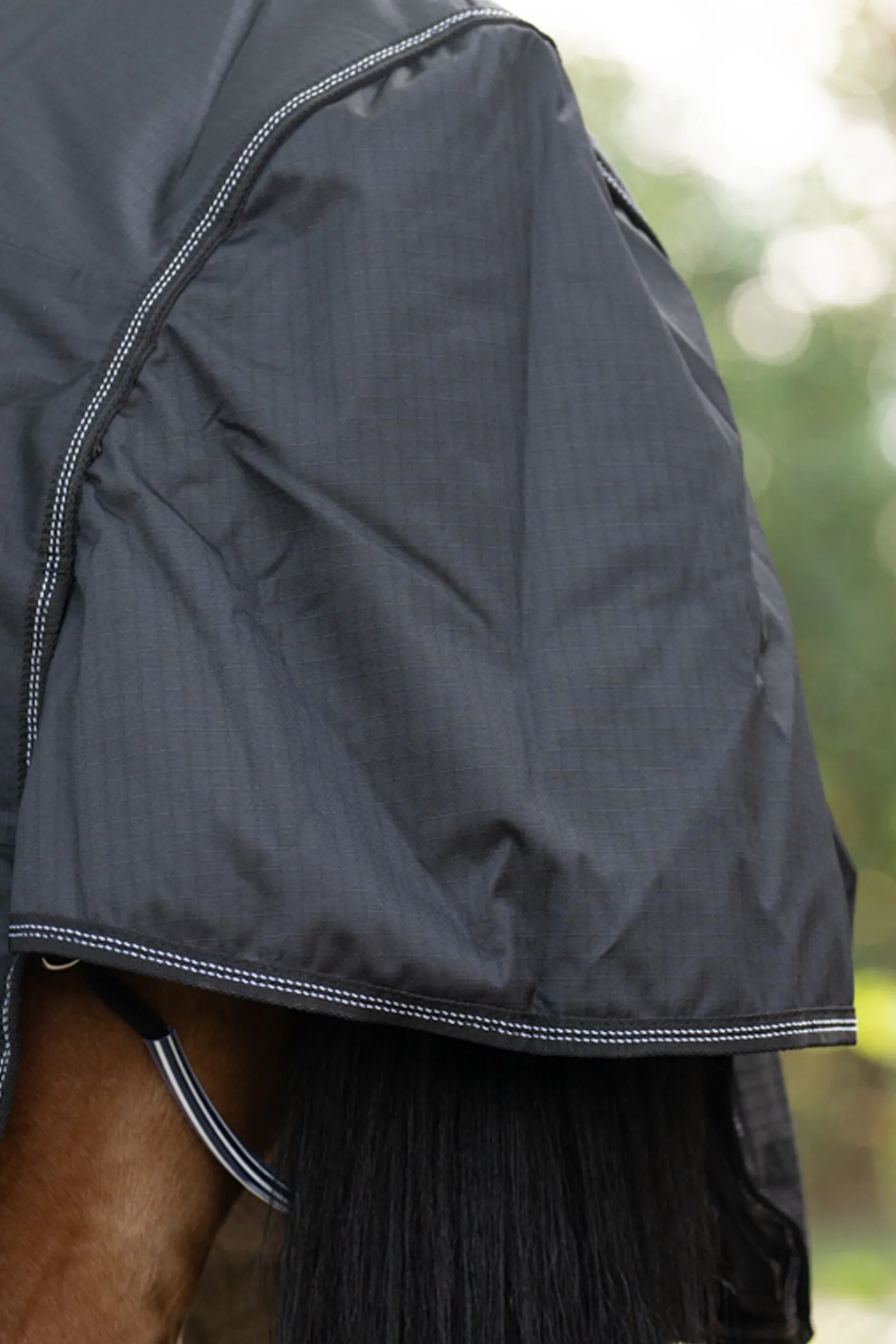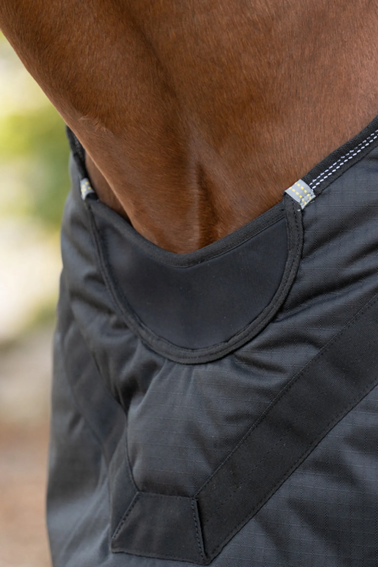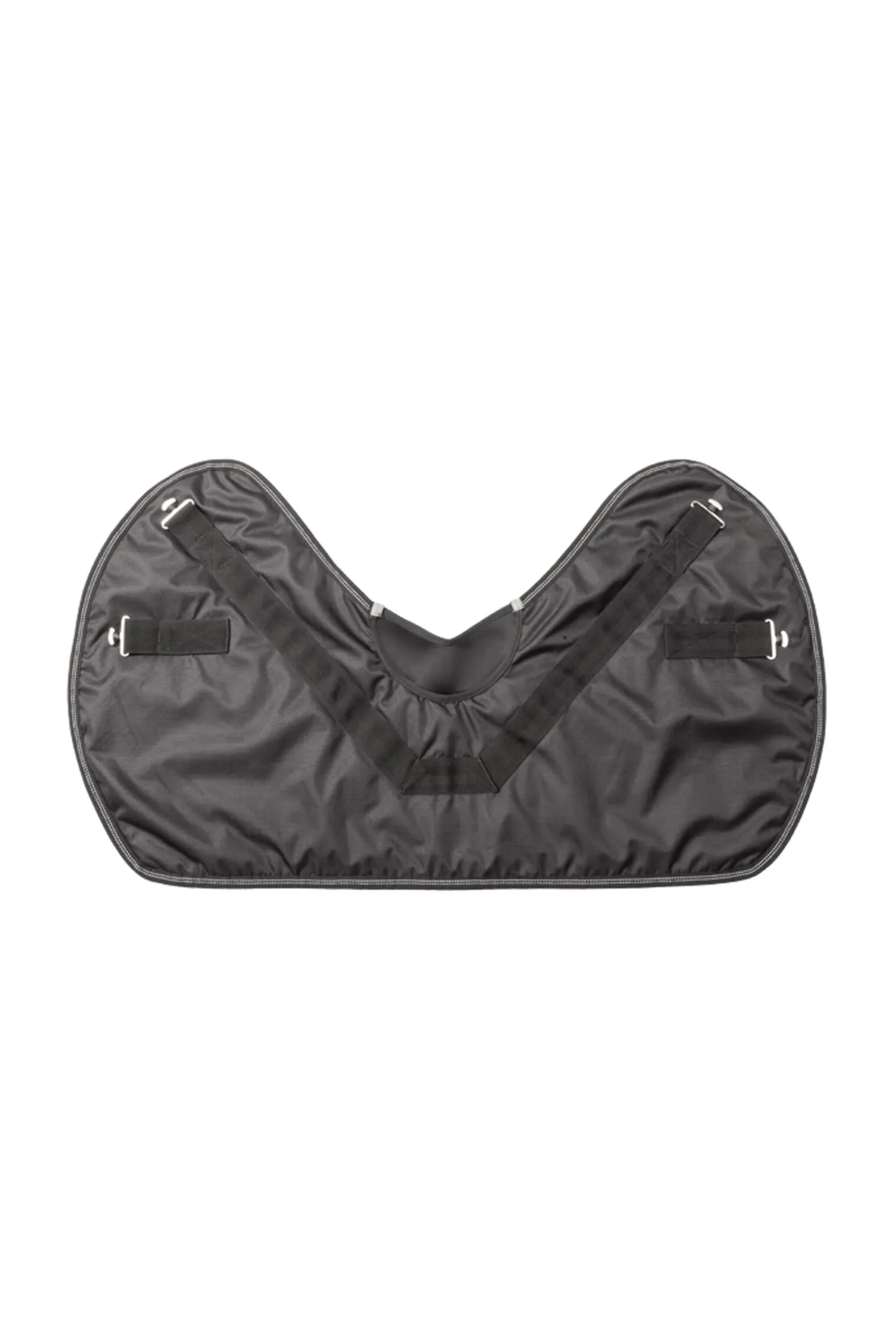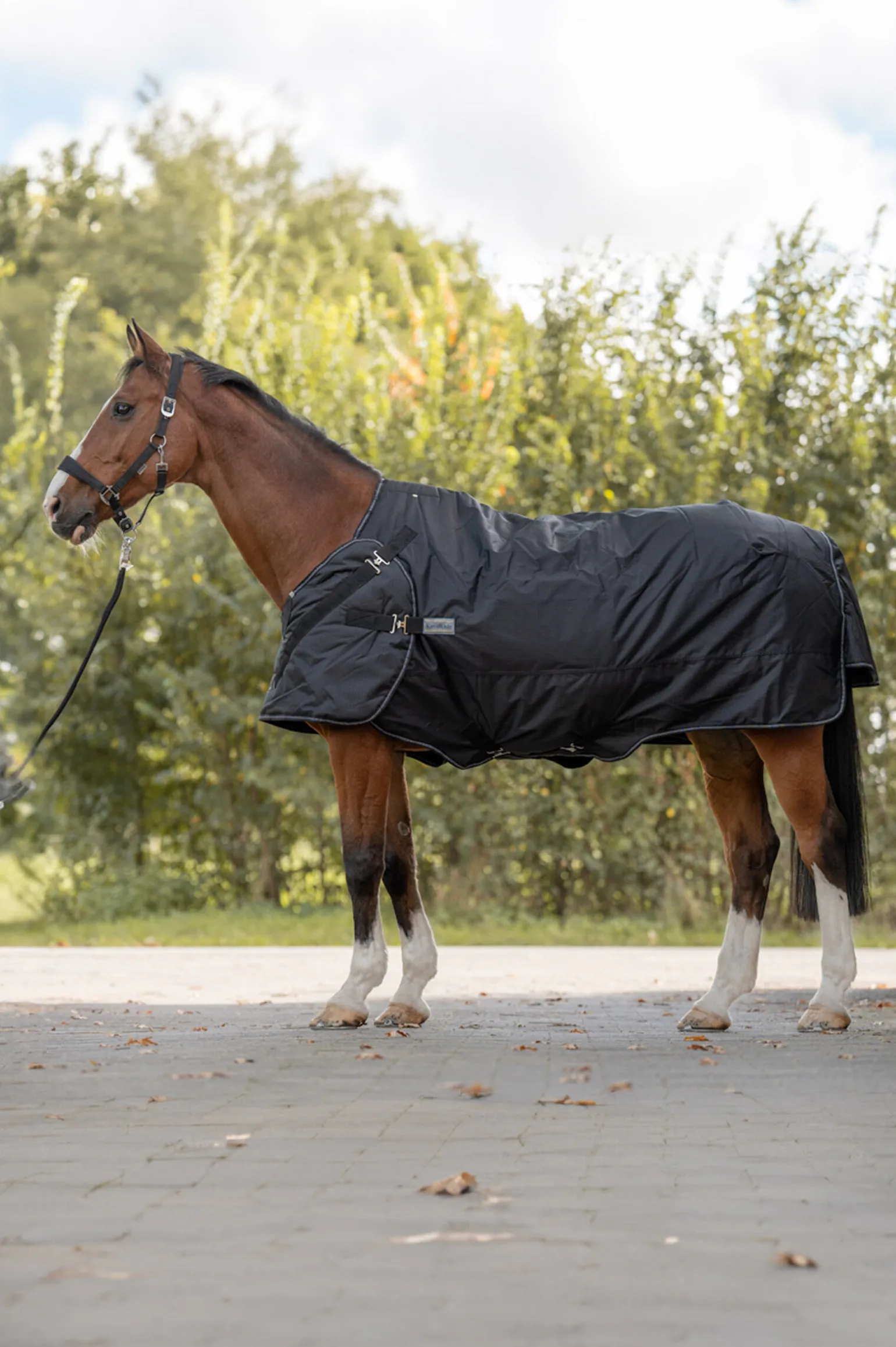 Takket være den raske og enkle utskiftingen av bryststroppen kan teppet Halifax brukes både som utedekken og som walker-dekken (utendørs). Det er to festemuligheter for bryststroppen: Den nedre festingen er spesielt egnet for smalere hester. Teppet Halifax 2-i-1 gir hesten din den bevegelsesfriheten den trenger i walker eller på løpebånd. Utedekkenet tilbyr også denne komforten: Fordi teppet ikke er lukket ved skuldrene, som det er tilfelle med vanlige utedekken, har hesten din tilstrekkelig frihet i ben og skuldre uten at teppet strekker seg ved skuldrene. Den anatomisk utformede rygglinjen med fremtredende manke, samt halefliken og den dype haleremmen, sikrer en ideell passform uten å skli. De dypere sidene på teppet Halifax 2-i-1 beskytter også det følsomme magområdet mot kulde. Polstringen ved manken og det glatte innerstoffet gir hesten din den komforten den trenger.