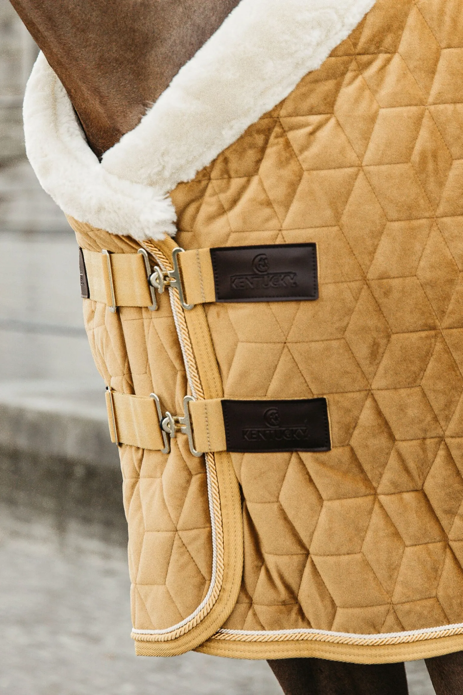 Hva er spesieltKentucky stevnedekken er deres signaturdekken og er ekstremt populært rundt om i verden.Ettersom Kentucky står for innovasjon har de utviklet et stevnedekken med sitt berømte fløyels-stoff.Dette dekkenet er et skikkelig blikkfang takket være fløyels-stilen og det elegante, kunstige saueskinnet på kragen!Stoff og materialeMed Velvet stevnedekken vil du utvilsomt skille deg ut i stallen.Dekkenet har 160 gram fyll og er perfekt å bruke om vinteren som et stalldekken hjemme eller på stevner.Utsiden av dekkenet har et mykt og elegant stoff og et sofistikert vattert lag.Kubevatteringen gjør det mye mer vanskelig for hestene å slite i stykker dekkenet.Innsiden av dekkenet har en innside i kunstig kaninskinn, noe som unngår gnagemerker.Det kunstige kaninskinnet skaper også små luftlommer som gir et isolerende lag rundt hesten din og holder den ekstra varm.Form og størrelseTakket være det kunstige kaninskinnet på innsiden av dekkenet vil Velvet stevnedekken holde seg på plass etter hesten har rullet eller ligget.Dekkenet kan festes med do doble frontspenner og to kryssgjorder som kommer med de kunstige lærlappene som er signaturen til Kentucky.