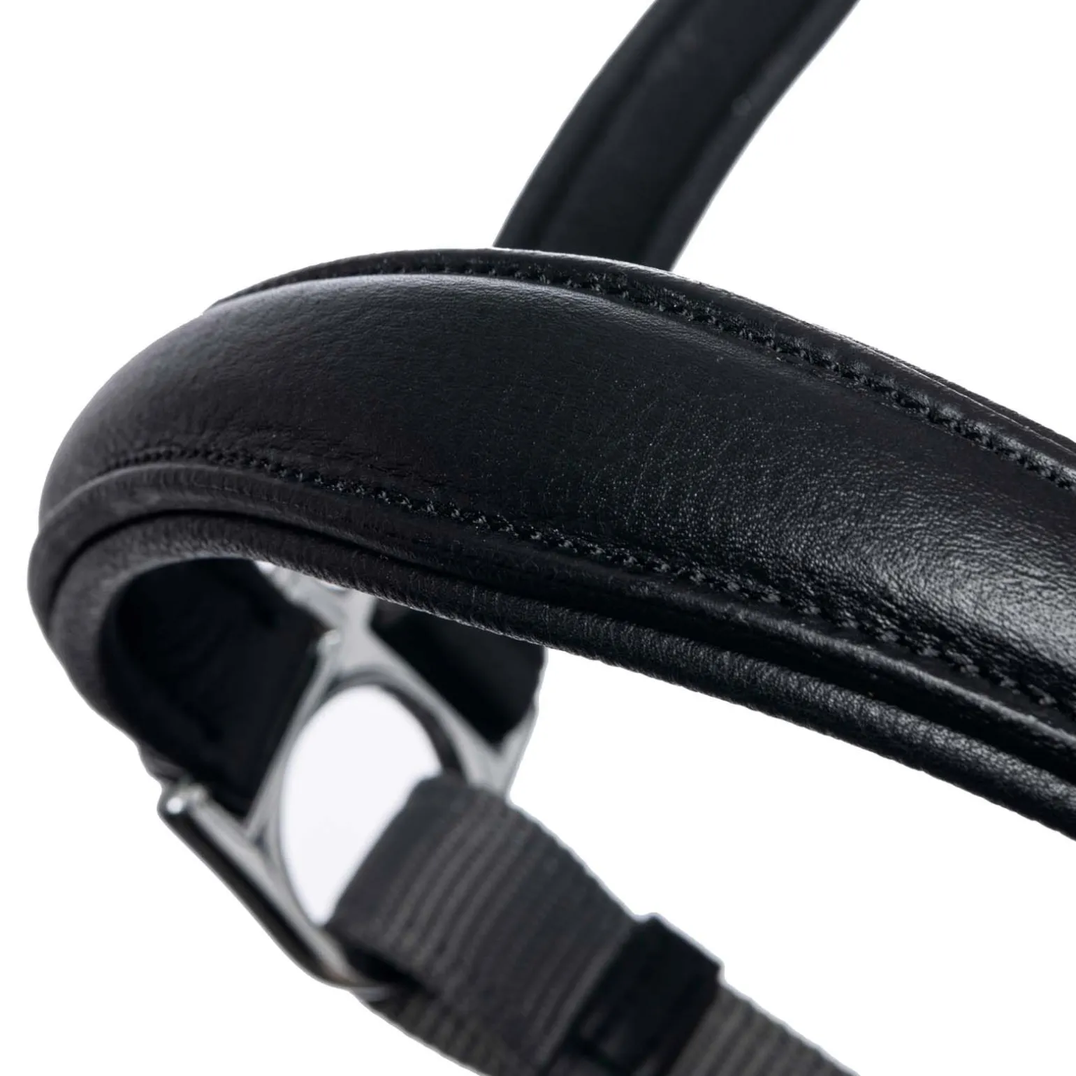 Nydelig laget i mykt lær, sterk nylon og solide metallspenner for en stilig utforming i høy kvalitet.Det brede, formede, trykklindrende nakkestykket gir maksimal komfort.Hakestropp, kinnstropper og nesereim er polstret med lær.