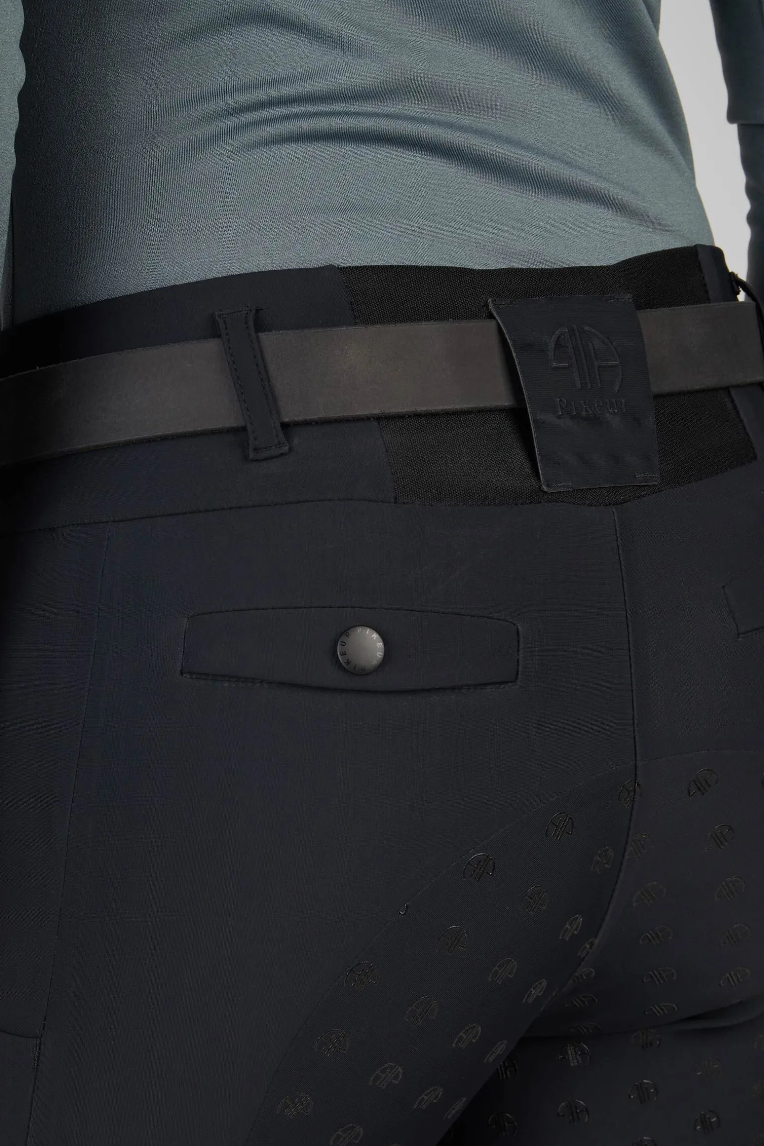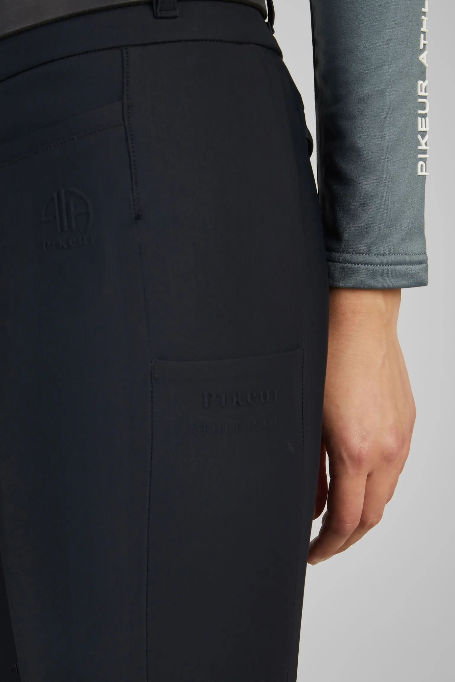 Disse ridebuksene er laget av 4-veis stretchstoff med en modellerende effekt og har versiegelte elastiske sømmer for maksimal komfort og holdbarhet. Designet uten knesøm, har de et linning av ytterstoff med beltestropper og en elastisk innfelt for fleksibel passform. Ytterligere detaljer inkluderer kantet benlukking, skrå lommer og stilige falske lommer med klaff og trykknapper. Med mobiltelefonlommer på begge sider og et screenprint-patch i Athleisure design, kombinerer disse ridebuksene funksjonalitet med en moderne stil.