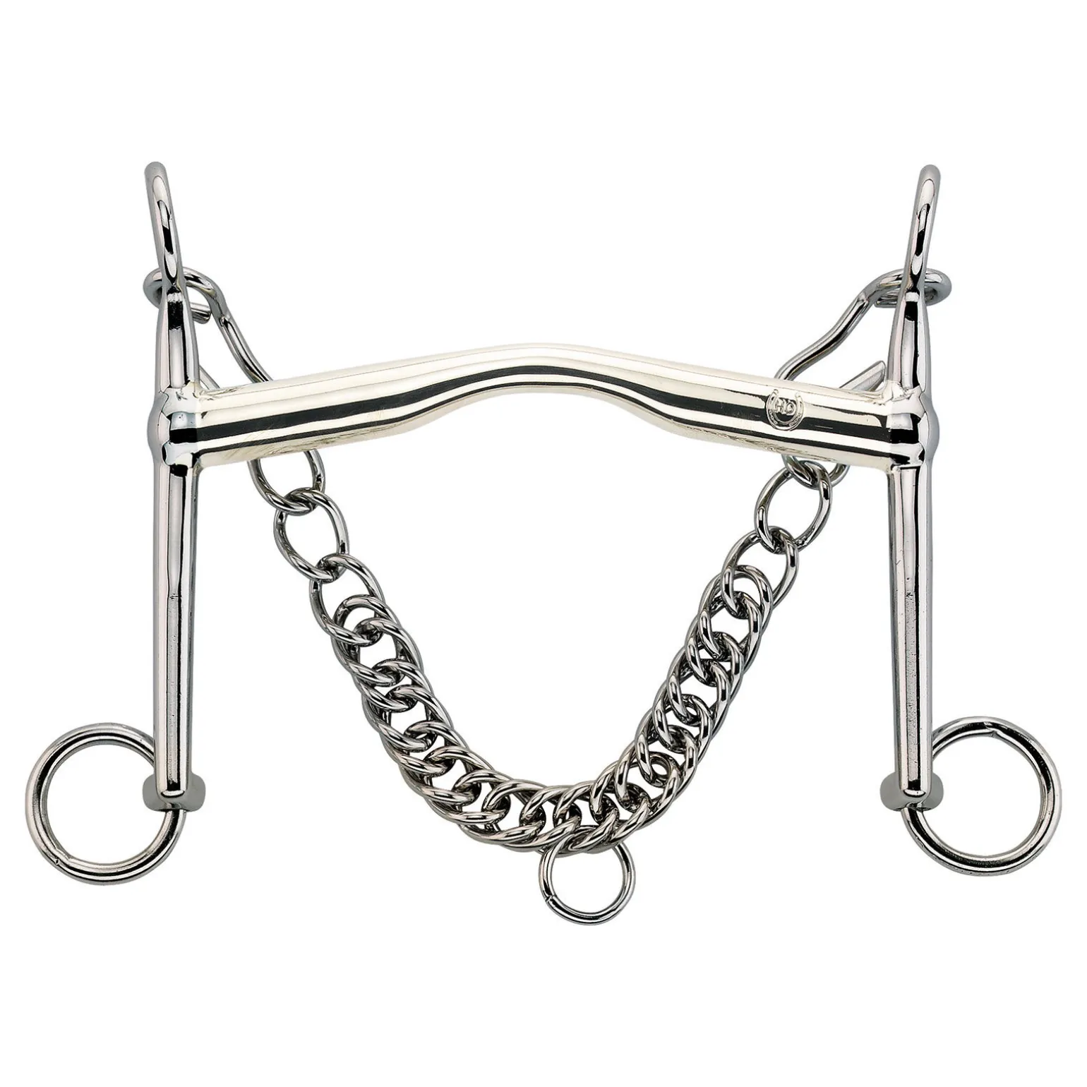 Dette unike kandarbittet med skråstilt munnstykke og en glatt, avrundet port, er vinklet fremover og gir en god trykkfordeling på tungen. Bittet drar fordel av tungens ekstreme følsomhet og sikrer presise instruksjoner. Velegnet til hester som opplever det ubehagelig med trykk mot tungen.Utmerket som en mild introduksjon til kandarbittet. Det skrå munnstykket opmuntrer til harmoni mellom rytters hånd og hestens munn, og gir en avslappet, sikker kontakt med bittet.De korte sidestengene gjør at det er bruk for mindre tøylehjelp. Det er derfor veldig viktig med fintfølende hender.