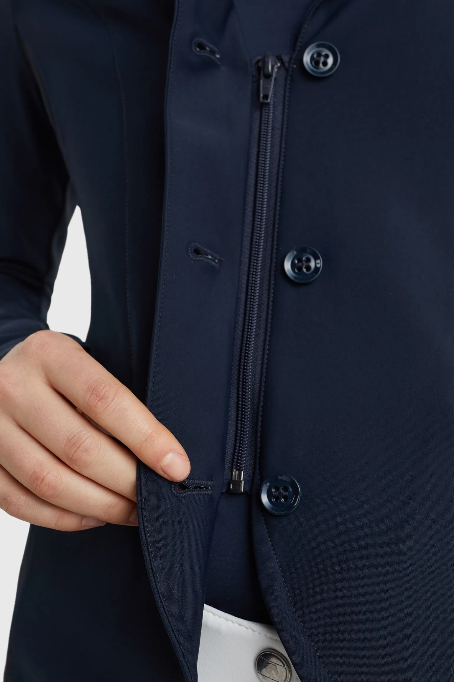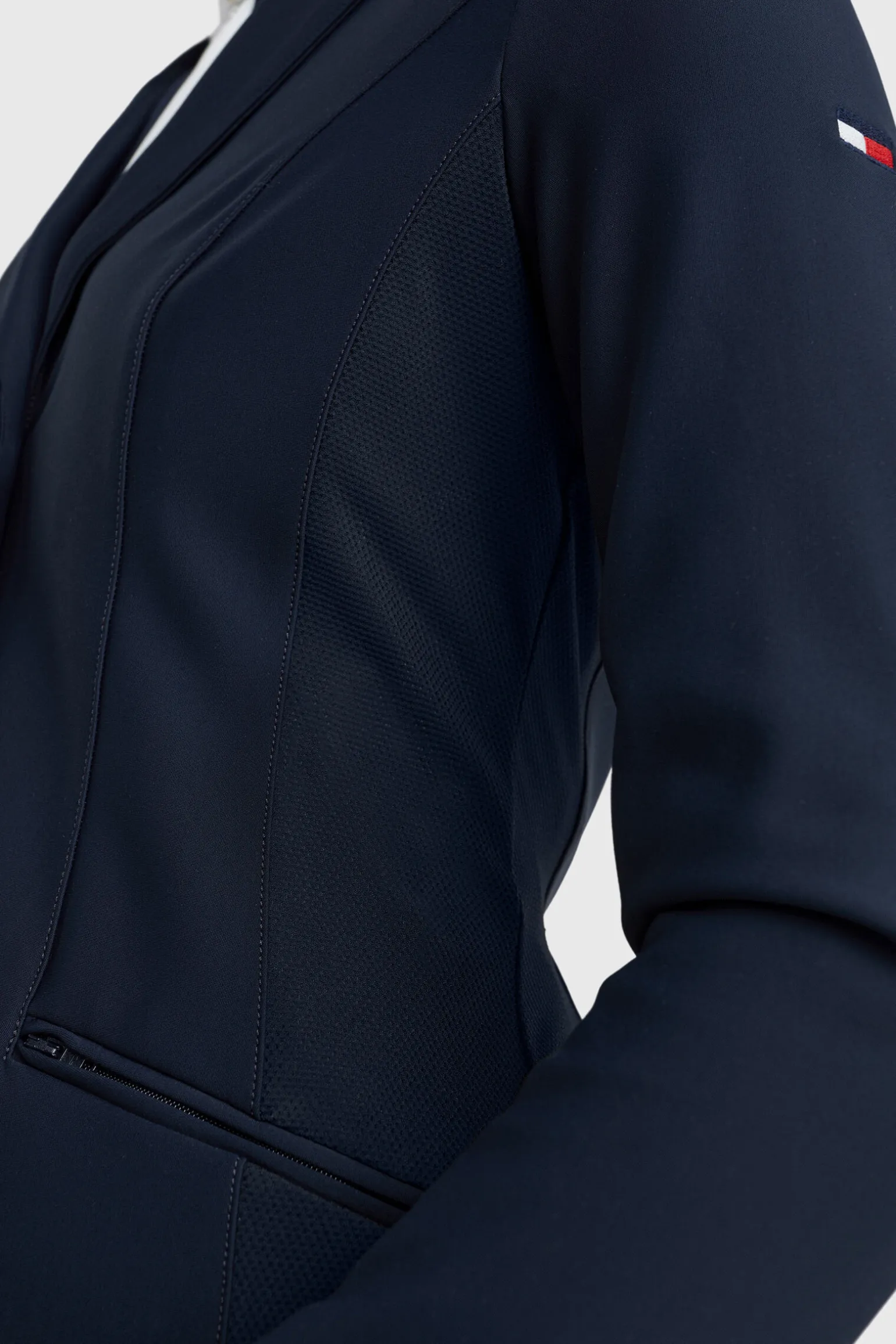 Performance-showjakke laget av et lett, elastisk kraftstretchstoff og elastiske mesh-innlegg på sidene.Har 3 knapper med skjult glidelås foran, 2 glidelåslommer og 2 skjulte ventiler bak.Flaglogobroderiet på venstre overarm, tri-label i Tommy Ithaca Stripe-utseende og kontrastfôr fullfører utseendet.Logoen er FEI-kompatibel.