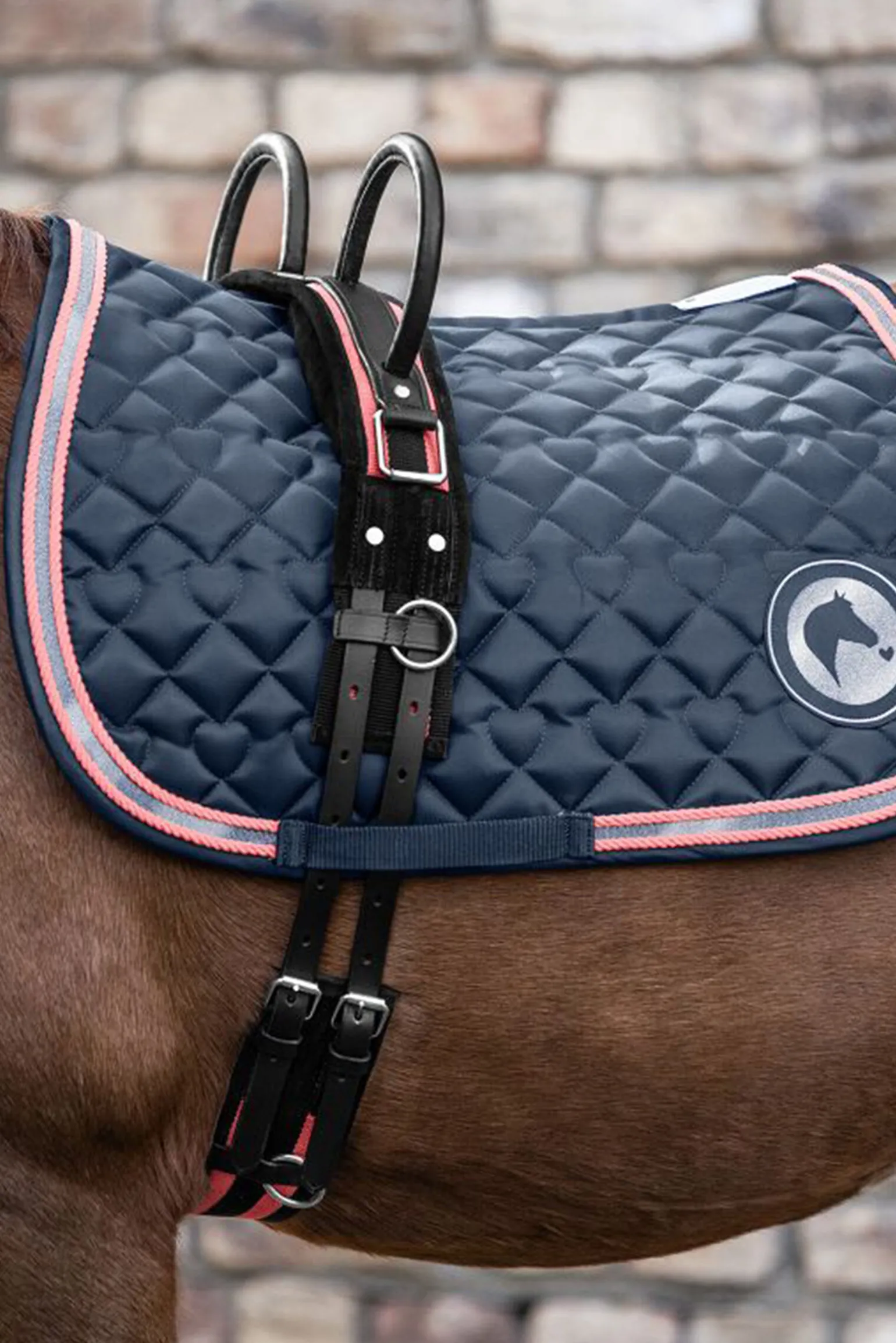Med lærbekledde håndtak for sikker longering med barn eller voksne med optimal kroppskontakt uten sal. Med rektangulære ringer hvor stigbøyler eventuelt kan spennes, 6 ringer for festing av hjelpereimer. Ikke egnet for å stige opp og ned.
