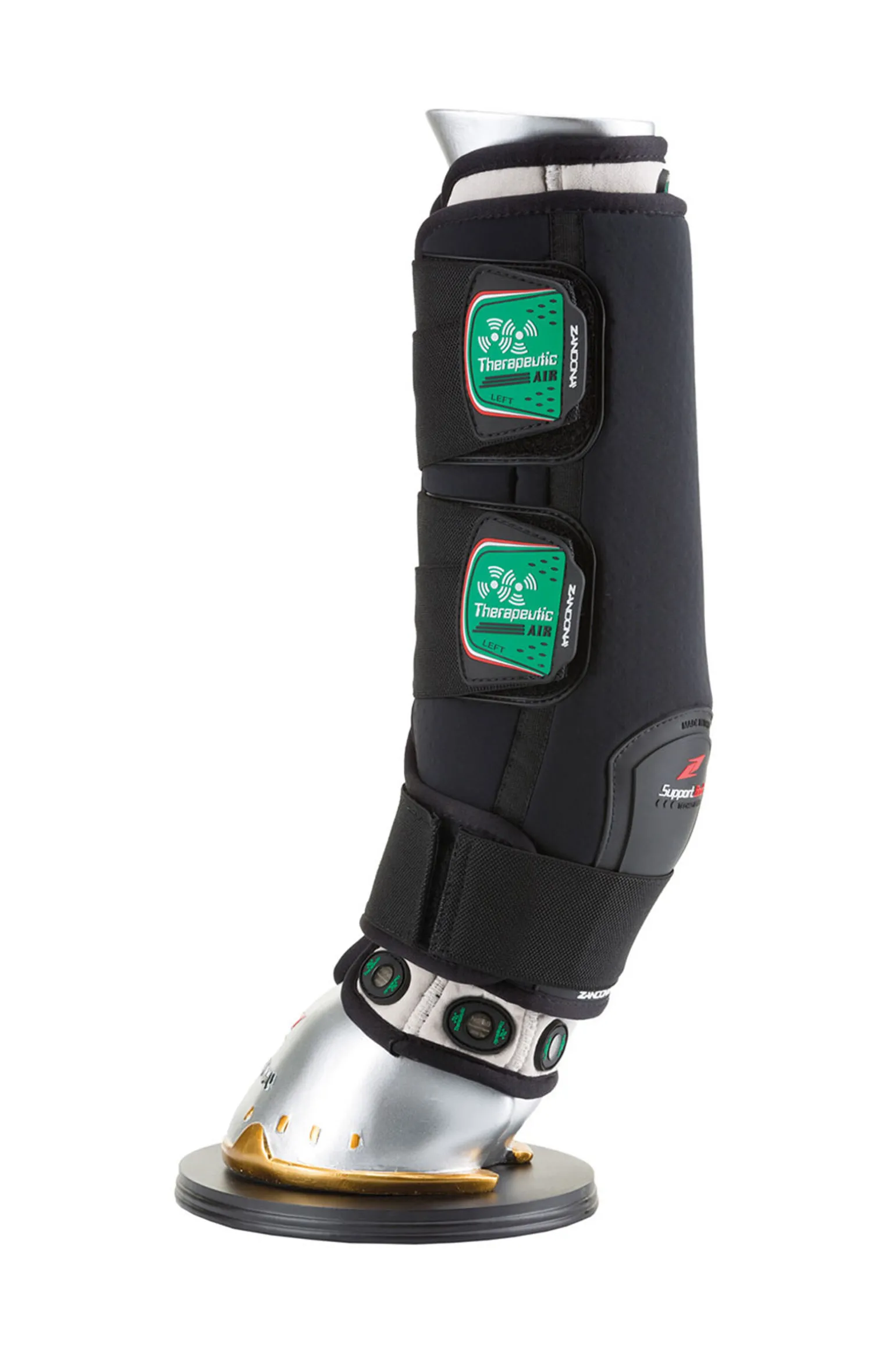 Det terapeutiske støttebelegget har 18 magnetiske enheter som bedrer cellulære funksjoner, de gir en naturlig terapeutisk støtte fra hoven til pipa og gir refleksologi til hele kroppen.Dette er et 2-i-1 produkt som er utviklet for å støtte leddbåndene og seneapparatet under transport, eller for å hindre hevelser etter trening. De er 100% italieske, med utskiftbar innside med COOLMAX (spesielle fibre som transporterer fuktighet mot den ytre overflaten av stoffet slik at huden holdes tørr). På utsiden, i nærheten av koden, er det en ekstra beskyttelse som reduserer slitasje på grunn av friksjon. Elastiske stropper med borrelås er tilpasset for å gi optimal støtte til senene, komfort og grep.Permanentmagneten som anvendes er sammensatt av et sterkt magnetisk legering av neodym, jern og bor med nikkelbelegg, og er i stand til å gi en magnetisk flukstetthet på 2600 Gauss hver.Plasseringen av magnetene, deres flukstetthet, intensitet og polarisering har blitt studert av veterinærer og proffe ryttere for å maksimere lokal økning av vaskulær blodstrøm og lymfatisk sirkulasjon, noe som gir flere fordelaktige effekter:Refleksologi effekter:Ved hjelp av refleksologiprinsipper, som er magnetisk stimulerende reflekspoeng (Ting) plassert på spesifikke meridianer hos hesten (de samme punktene som brukes for akupunktur), blir moderate rebalanseringseffekter oppnådd:Bakbeinsbelegg:Magneten ved Yang meridian LIV (Lever – Ting LIV 1), virker på kodene, på de overfladiske sidemusklene og på muskler i kryss og hofter.Magneten ved Yang meridian KI (Nyre – Ting Ki 1), virker på kodene, på bein og bak-senene.Magneten ved Yang meridian SP (Milt – Ting SP1), virker mot overdreven dannelse av leddvæske og har positive effekter på små og store psoas muskler.Magneten ved Yin meridian BL (blære – Ting BL67), virker på hoven.Magneten ved Yin meridian GB (galleblæren – Ting GB44), virker på hoven og på sidemusklene.Magneten i nærheten av Yin meridian (magen – Ting ST45) ST, virker mot problemer i muskler og kodene.