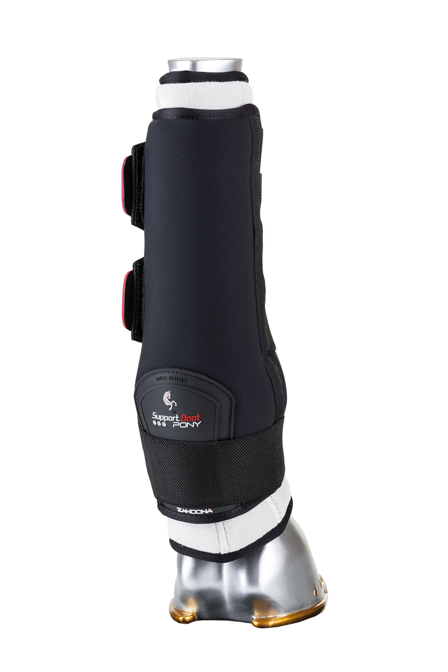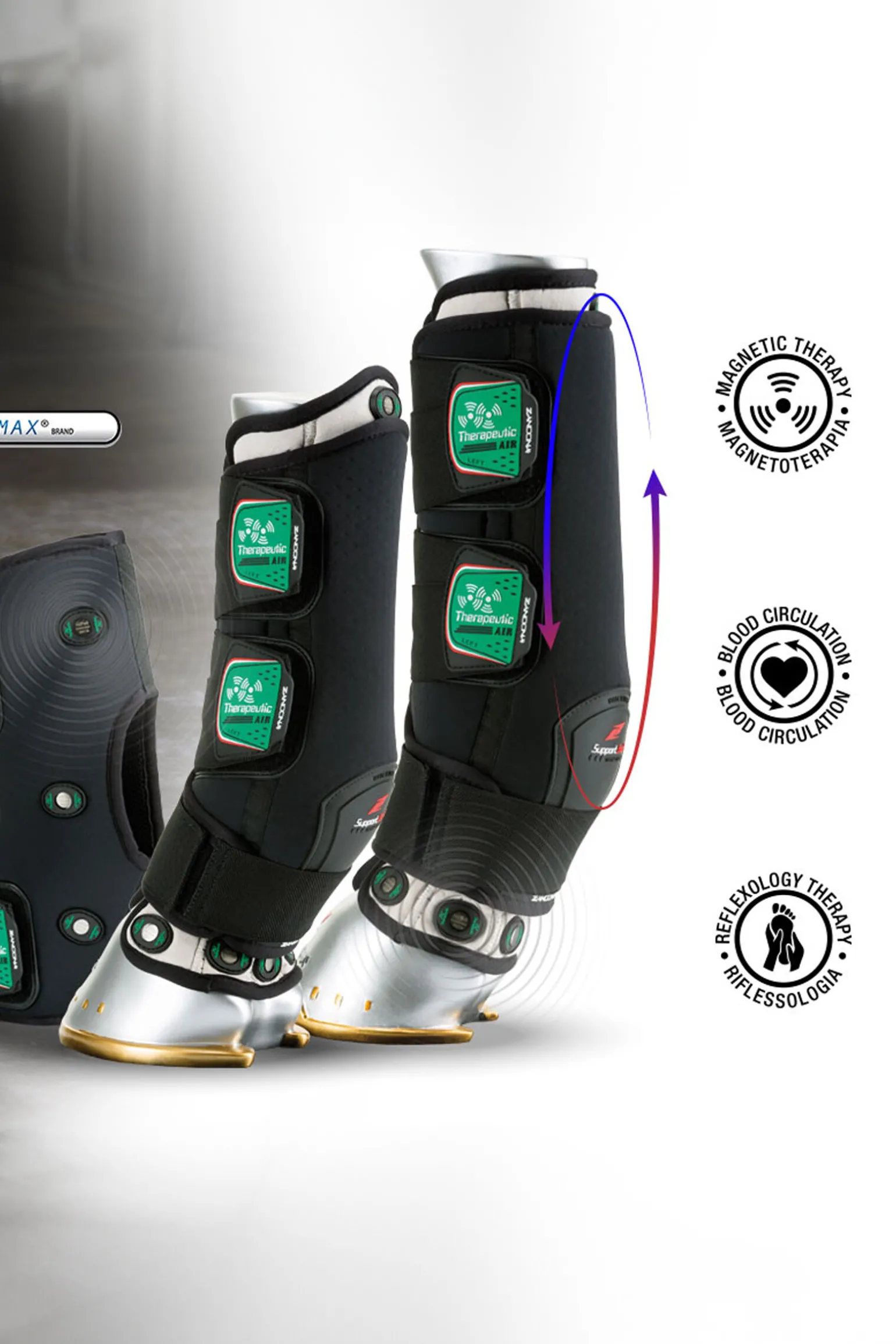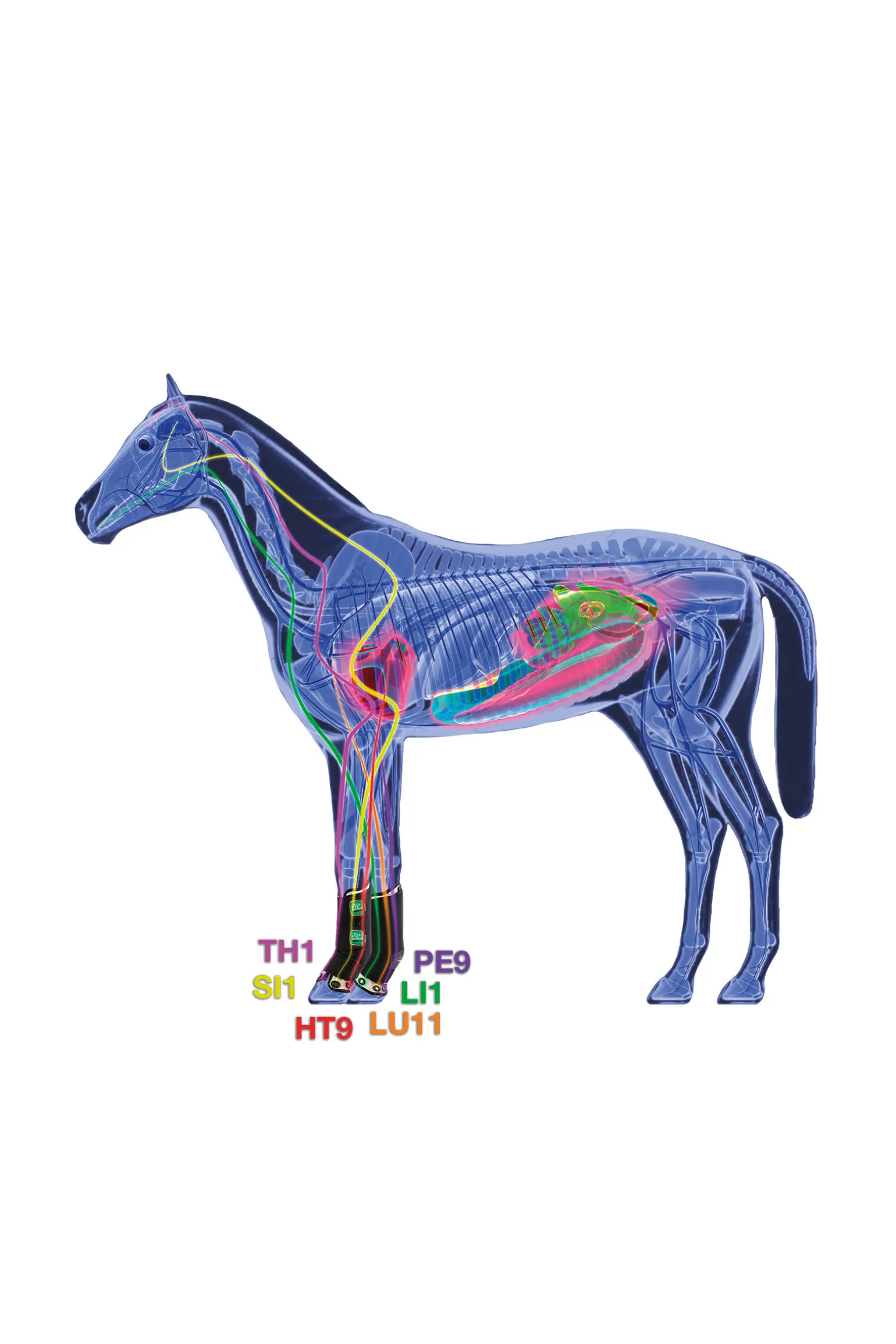 Det terapeutiske støttebelegget har 18 magnetiske enheter som bedrer cellulære funksjoner, de gir en naturlig terapeutisk støtte fra hoven til pipa og gir refleksologi til hele kroppen.Dette er et 2-i-1 produkt, ettersom det også er utviklet for å støtte leddbåndene og seneapparatet under transport, eller for å hindre hevelser etter trening. De er 100% italieske, med utskiftbar innside med COOLMAX (spesielle fibre som transporterer fuktighet mot den ytre overflaten av stoffet slik at huden holdes tørr). På utsiden, i nærheten av koden, er det en ekstra beskyttelse som reduserer slitasje på grunn av friksjon. Elastiske stropper med borrelås er tilpasset for å gi optimal støtte til senene, komfort og grep.Permanentmagneten som anvendes er sammensatt av et sterkt magnetisk legering av neodym, jern og bor med nikkelbelegg, og er i stand til å gi en magnetisk flukstetthet på 2600 Gauss hver.Plasseringen av magnetene, deres flukstetthet, intensitet og polarisering har blitt studert av veterinærer og proffe ryttere for å maksimere lokal økning av vaskulær blodstrøm og lymfatisk sirkulasjon, noe som gir flere fordelaktige effekter:Refleksologi effekter:Ved hjelp av refleksologiprinsipper, som er magnetisk stimulerende reflekspoeng (Ting) plassert på spesifikke meridianer hos hesten (de samme punktene som brukes for akupunktur), blir moderate rebalanseringseffekter oppnådd:Frambeinsbelegg:Magneten ved Yang meridian SI (tynntarmen – Ting SI1), virker på betennelsesreaksjoner og traumer, sirkulasjon i nakke og ryggrad, og mot hardhet i venstre side.Magneten ved Yang meridian TH (Triple Heather – Ting TH1), fungerer på forsiden av kodene og mot scapulohumeral-smerter.Magneten ved Yin meridian HT (Hjerte – Ting HT9), virker på sår, betent og overarbeidet muskulatur.Magneten ved Yang meridian LI (tykktarmen – Ting LI1), fungerer mot muskelkramper i skulder-nakke og mot hardhet i høyre side.Magneten ved Yin meridian PE (hjerteposen – Ting PE9), virker på hoven, frontalsener og leddbåndene, og mot forfangenhet (akutt og kronisk betennelse).Magneten ved Yin meridian LU (Lunge – Ting LU 11), virker mot dysfunksjoner i hovens senemuskel og mot scapulohumeral-smerter.
