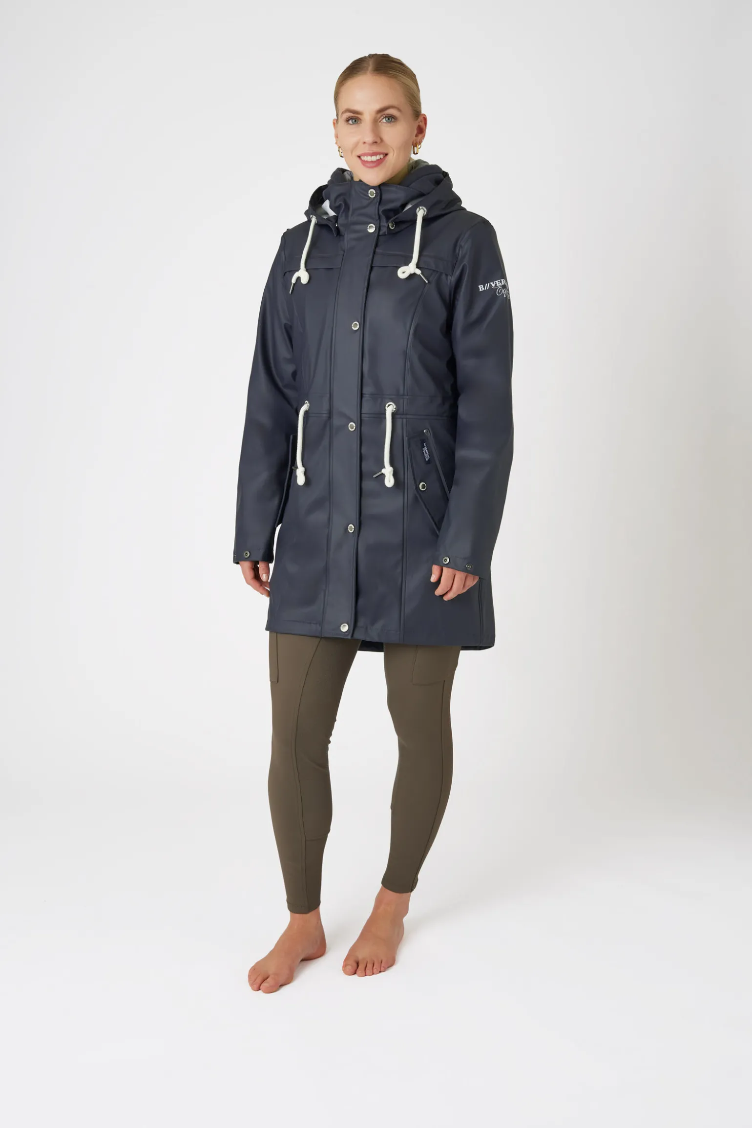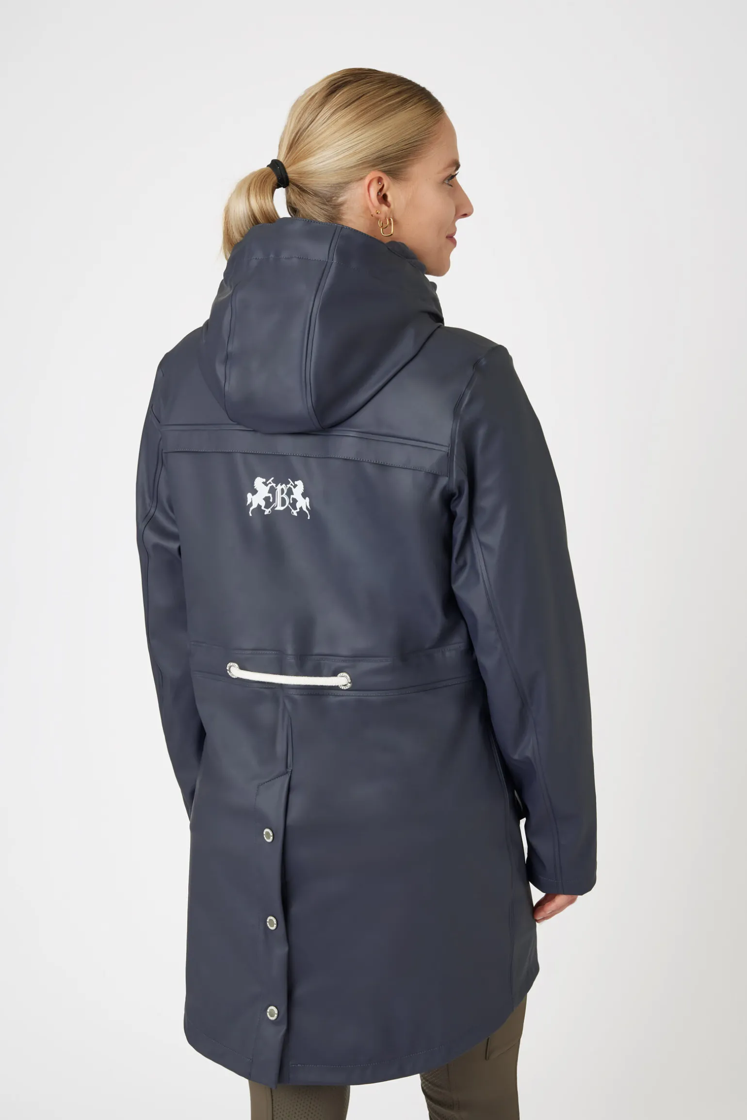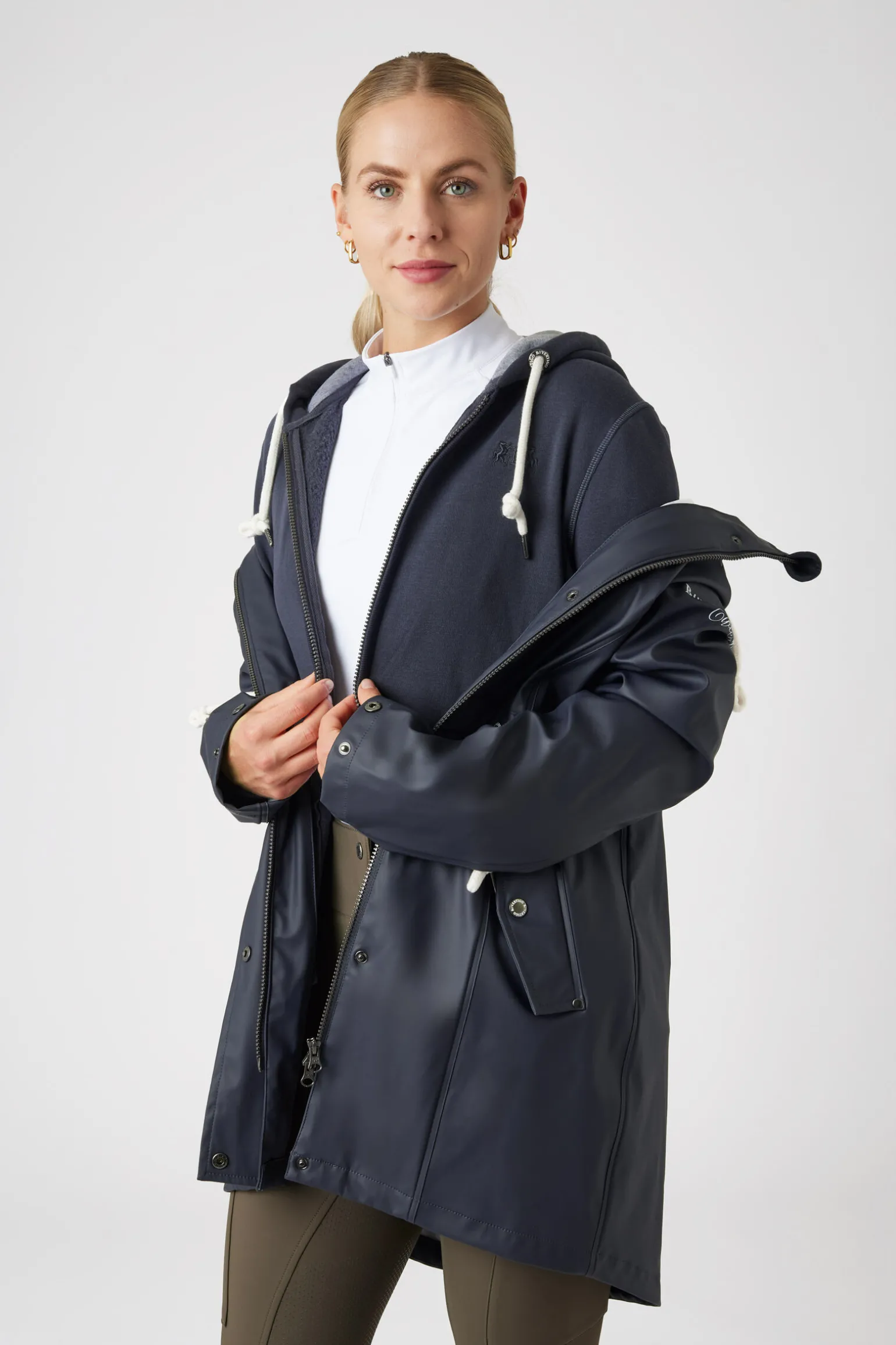 Denne regnjakken har en avtakbar sweatshirt med hette innvendig.Den utvendige jakken er laget av vanntett PU-materiale med teipede sømmer.Toveis glidelås er superpraktisk, og to lommer med trykknapper holder eiendelene dine trygge.Knapper bak gjør den praktisk å bruke når du sitter i salen.Justerbare snorer til hetten og i livet sikrer den perfekte passform.Sweatshirten er laget av mykt materiale med børstet innside og kommer med glidelås og to lommer.Begge plaggene har logodetaljer.