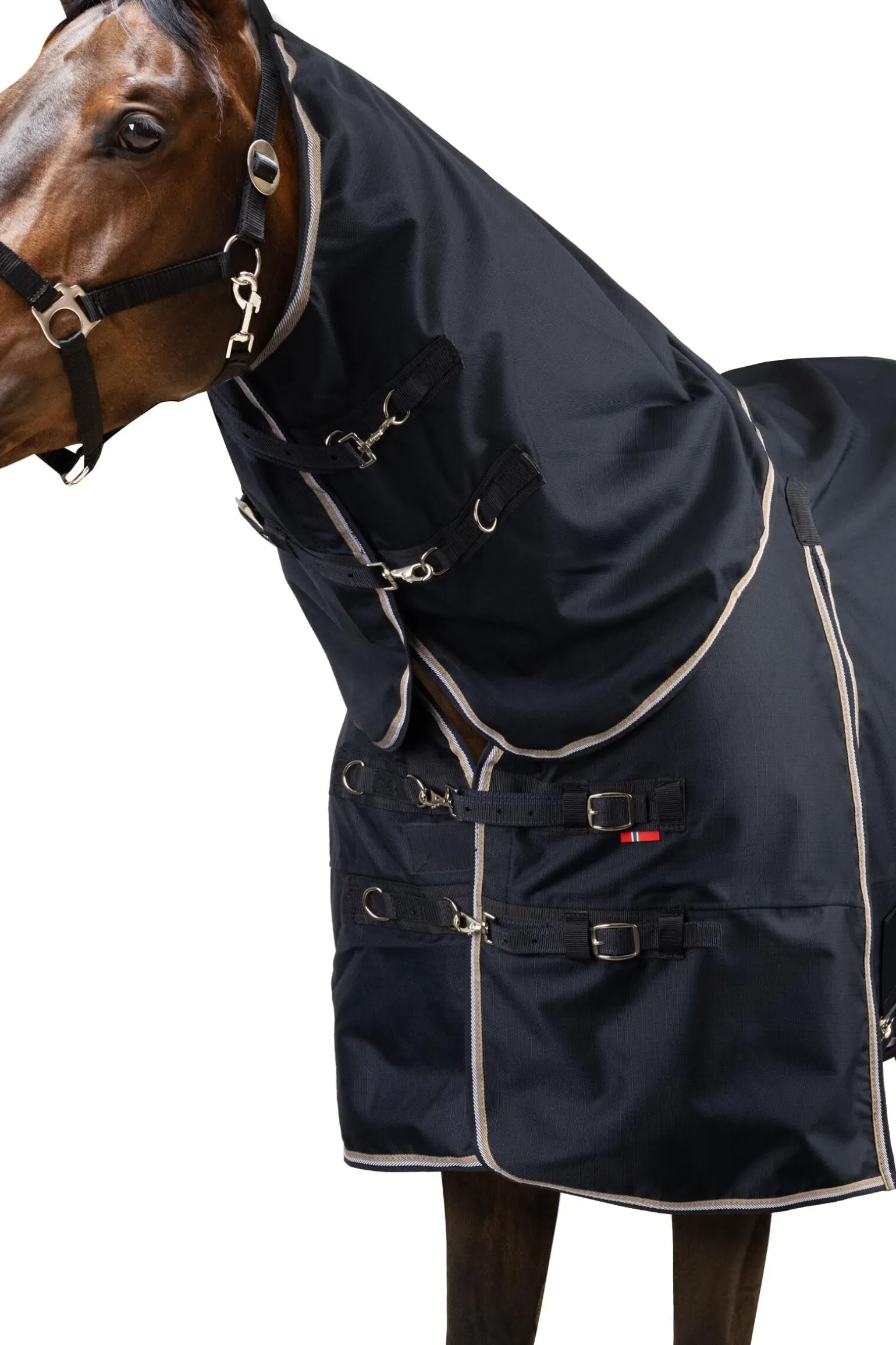 Dette holdbare kvalitetsdekkenet med stor haleflapp og valgfri bruk av hals gir full beskyttelse mot all slags vær. Den store bogsplitten gir god bevegelsesfrihet slik at hesten kan bevege seg rundt i luftegården.