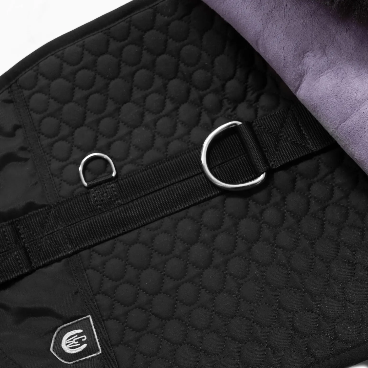 Setet består av ekte saueskinn med en ullhøyde på ca. 30 mm, mens undersiden har saueskinn kun i midtre del, over ryggen. I setet er det lagt inn uttrekkbare polstringer av komposittskum på begge sider av ryggraden. Det øker først og fremt sittekomforten for rytteren, og dernest er det en god beskyttelse for hestens rygg. For å forbedre likevekten, er det mulig å feste stigbøyleremmer i D-ringer, under saueskinnsfellen under setet. Kan vaskes i maskin med spesielt vaskemiddel for sauefell. Tåler også tromling. Vi anbefaler vårt vaskemiddel «C7». Vennligst respekter våre vaskeanvisninger.