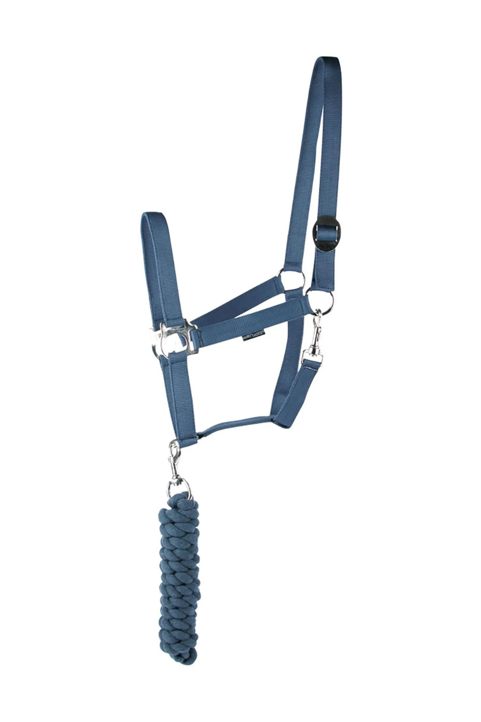 Grime med forniklede spenner. Grimen kan justeres i nakkeremmen med en spenne. Lengde på leietauet er 180 cm.