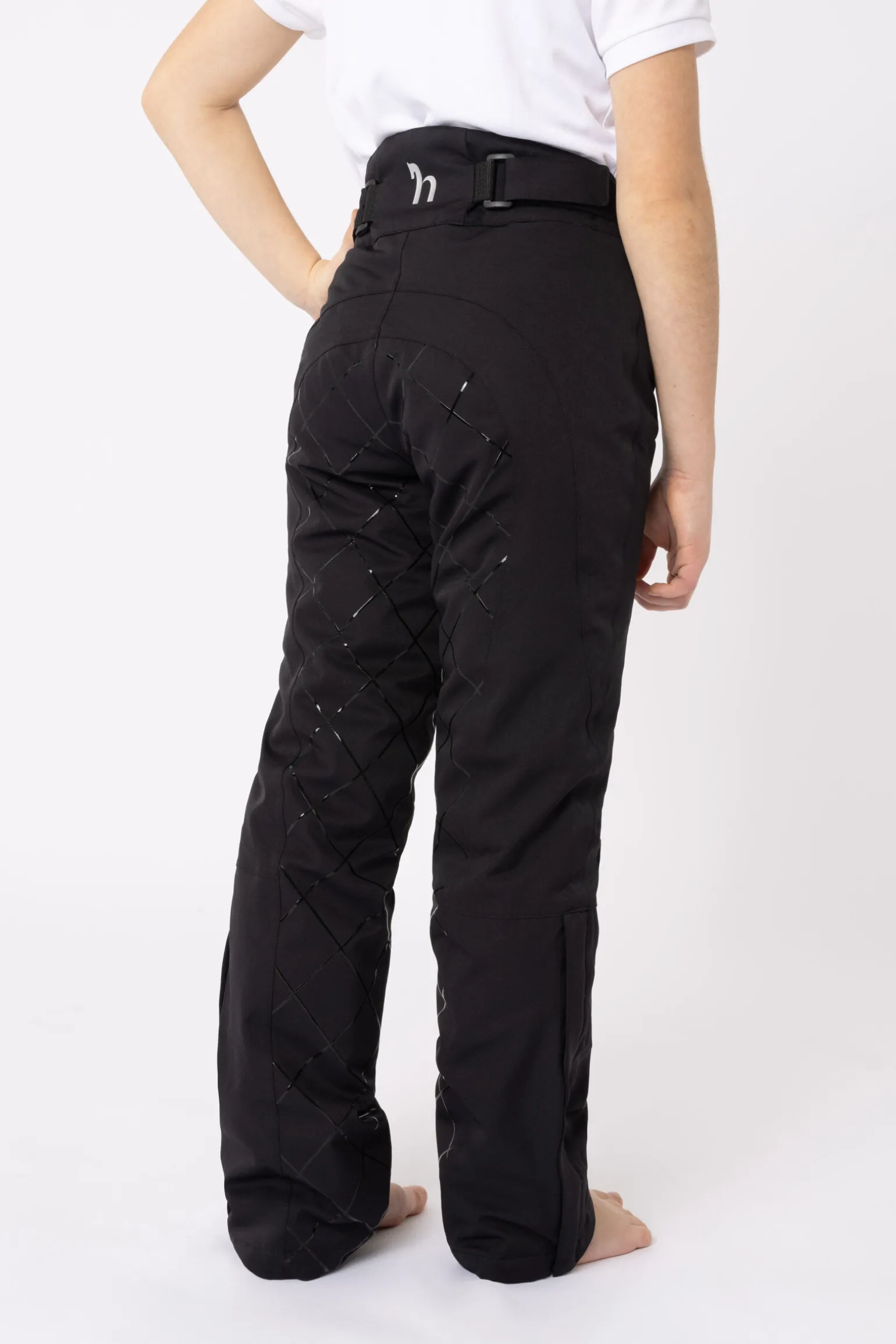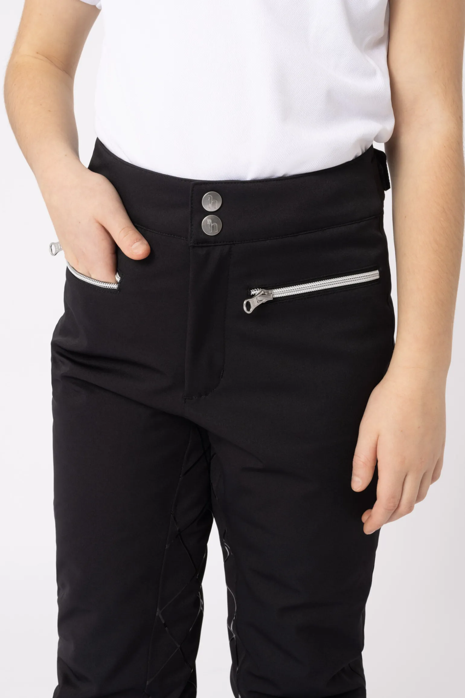Få ekstra varme med disse stilige, komfortabelt fôrede ridebuksene til jenter, i vanntett stoff. Teknisk silikontrykk i setet gir ekstra grep i salen. Ridebuksen med høyt liv bak på ryggen gir både en god passform og perfekt form. Glidelåslommer foran er utmerket for å oppbevare nøkler eller gulrøtter.