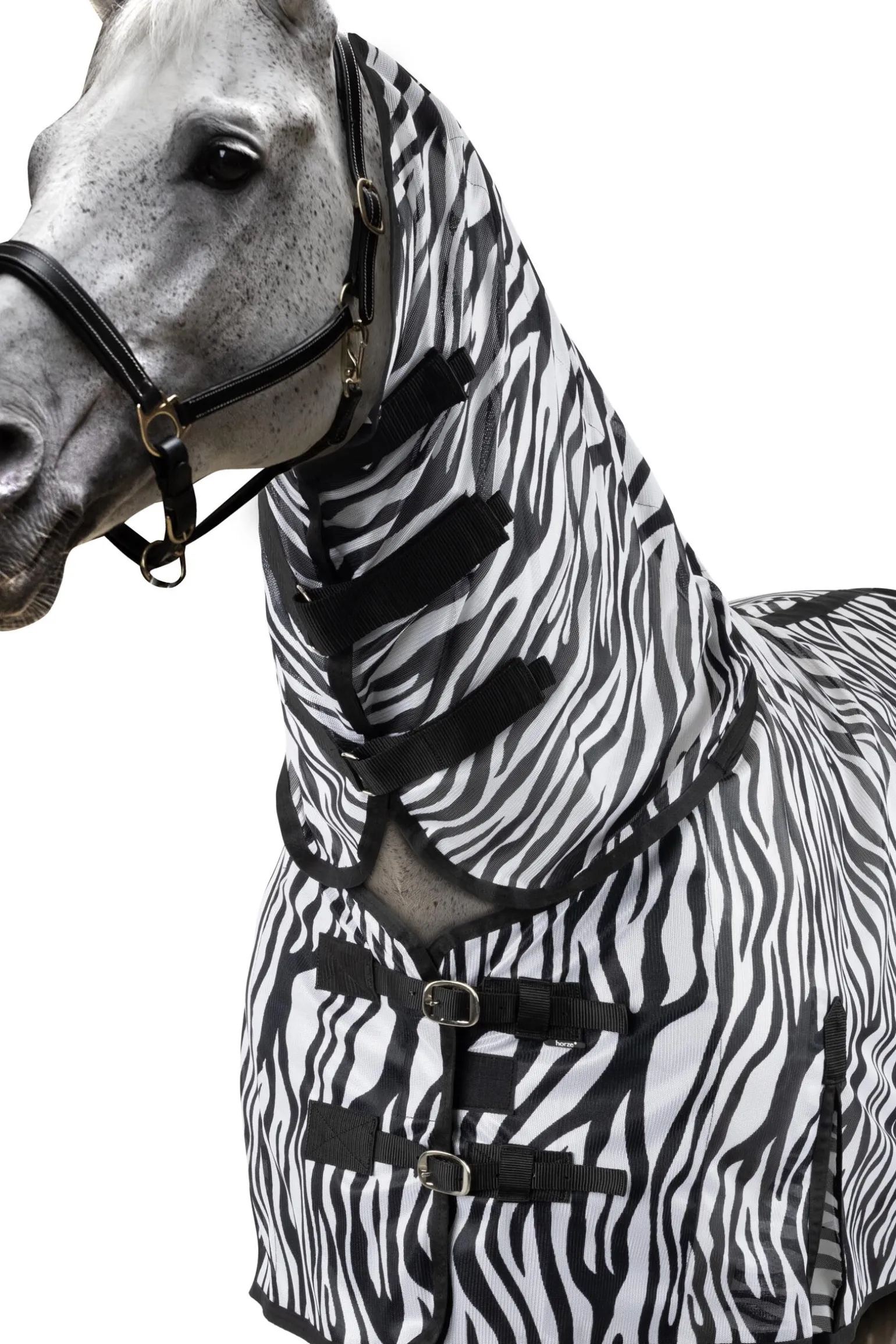 Expertly designed to give your horse day-long summer turnout protection, the Horze Defender fly rug is UV-protective and features a superb zebra print design which offers head to tail protection from annoying and biting insects. Zebra stripes are a highly effective deterrent against flies as the contrasting stripes have been shown to confuse and deter insects, helping to reduce bites and irritation.Made from a fully breathable fabric to ensure your horse stays cool and comfortable, it is also quick to dry, should your horse get caught in a shower. With a Elastan insert at the base of the neck for added stretch and comfort, the Defender fly rug also features a smooth lining along the extra-long neck and shoulder areas, to help prevent friction and ensure your horse is comfortable and protected, all summer long.