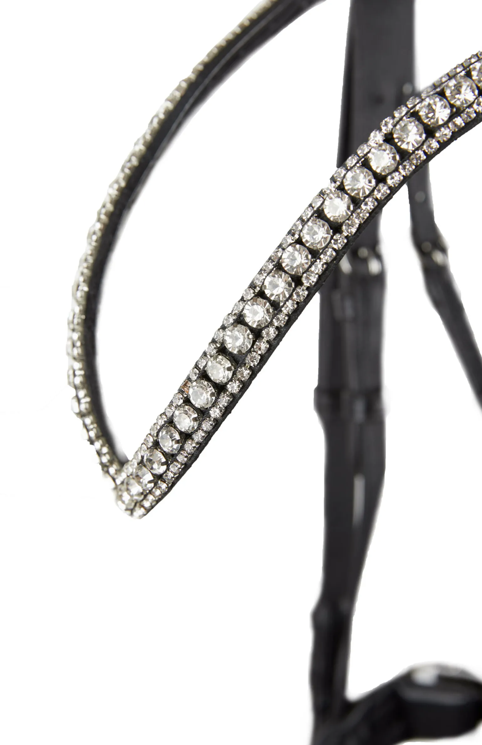 Et klassisk dressur-hodelag fôret med som ser nydelig ut, og passer helt utmerket. Den myke polstringen kombinert med det anatomisk utformede nakkestykke med ekstra plass for ørene vil gi komfort og være lett å tilpasse. Den polstrede pullback nesereimen festes enkelt og har en god passform. Nydelig, V-formet pannebånd med en smakfull rad av pyntesteiner som gir deg et snev av bling.