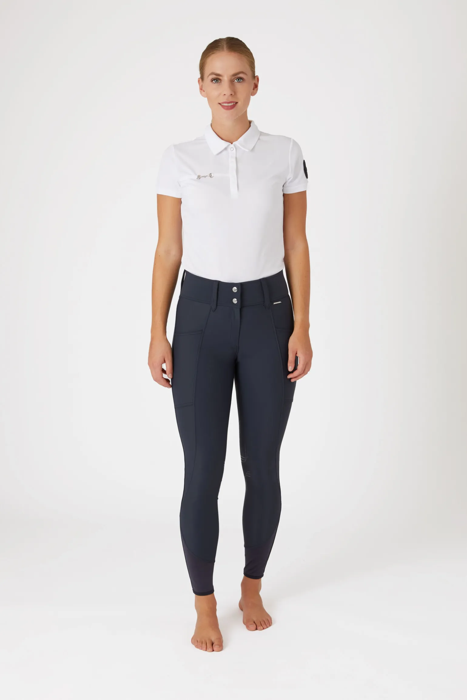 Horze Indira ridebukser er elastiske og har et høyt liv.Lommene på lårene er perfekt til telefonen.Kneforsterkingen med silikon gir fleksibilitet i salen.Strategisk plasserte sømmer gir et flott utseende.Denne er også tilgjengelig som helforsterket ridebukse (#36758).