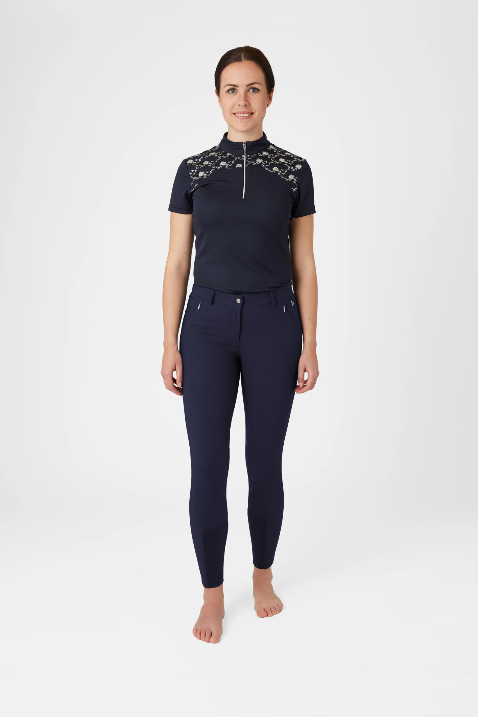 Horze Kaitlin ridebukser er laget av mykt, elastisk materiale.Glidelåslommer foran holder telefonen din trygg.Baklommene er brodert med sølvblader, noe som matcher det kneforsterkede, blomsterlige mønsteret i silikon.Diskrete farger vil matche din ridegarderobe.