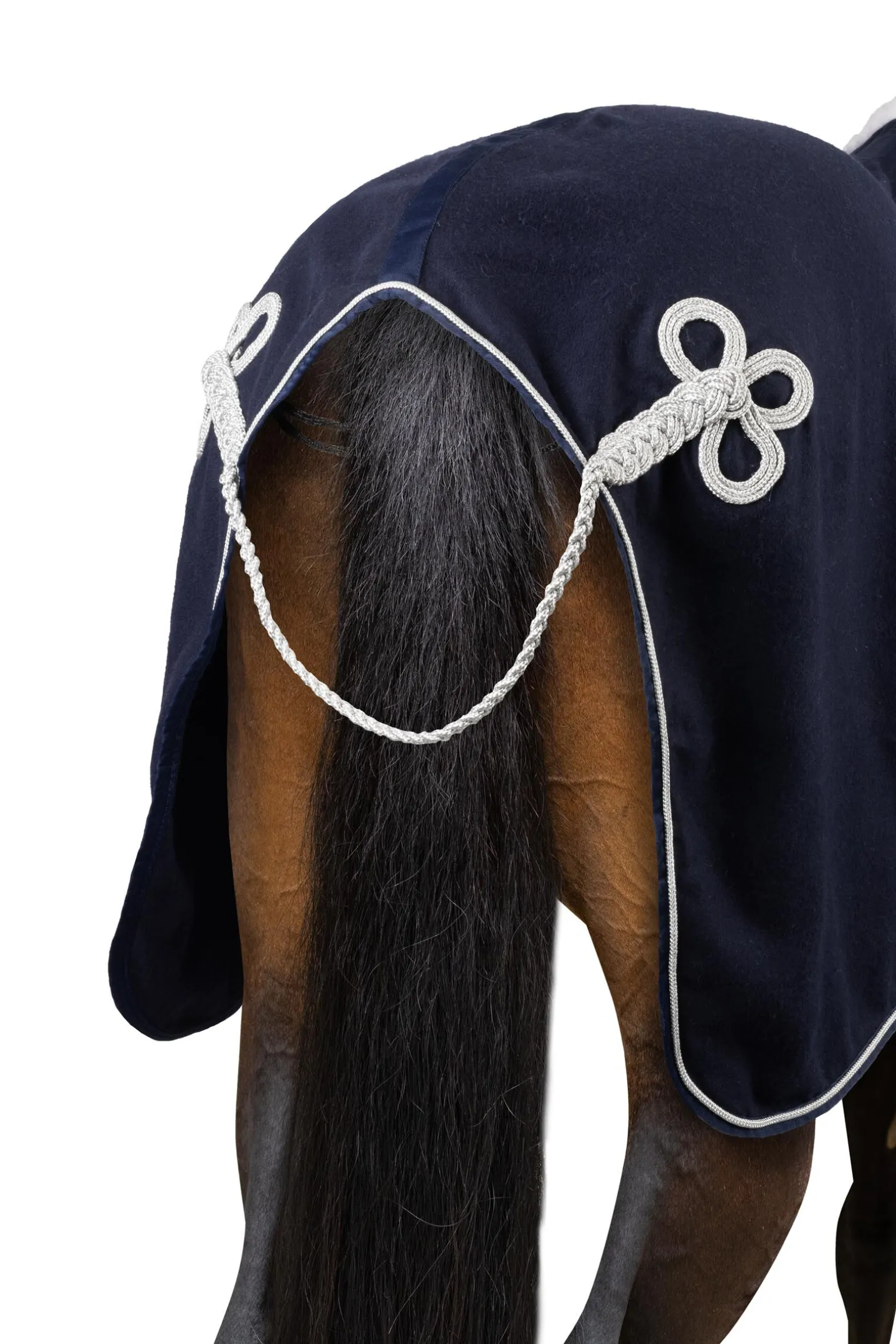Tykk, rik ull med mye sølvdetaljer gjør dette dekkenet til et perfekt valg å bruke når du skal ut blant andre. Den markante utsmykningen på hoften er et klassisk design og komplimenterer det nydelige kantbåndet i sølv, og Z-logoen. Dette pene dekkenet vil bli ditt favorittvalg når du er ute og reiser, ettersom hesten vil komme fram frisk og pen når den lastes av for ditt neste stevne. Pustende ull betyr at hesten vil holde varmen, samtidig som den ikke blir for varm. Det holdbare designet ser deilikat ut, men er solid, og holder i vask slik at dekkenet kan brukes sesong etter sesong.