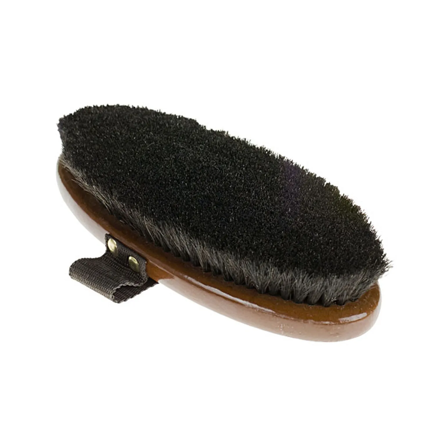 Naturlig hestehårkardask. Halvstiv, tett, sort bust. Elegant lakkert trehåndtak. Løkkestropp.