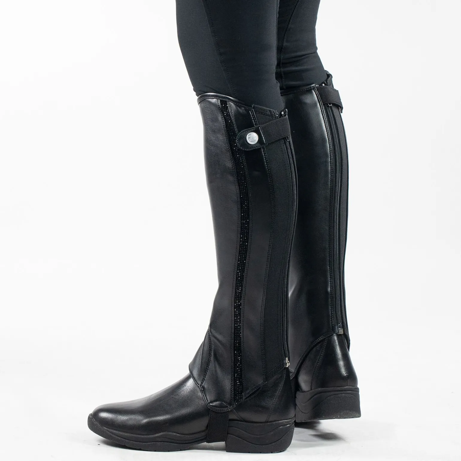 Laget av robust PU-lær, med detaljer av svarte krystaller – disse leggchapsene er et klassisk valg. Det elastiske ribbepanelet gir deg en tett og god passform. Med glidelåslukking og en enkel trykknapp på toppen får du dem svært enkelt av og på. Beskytt beina og ri med stil i disse fine knechapsene.