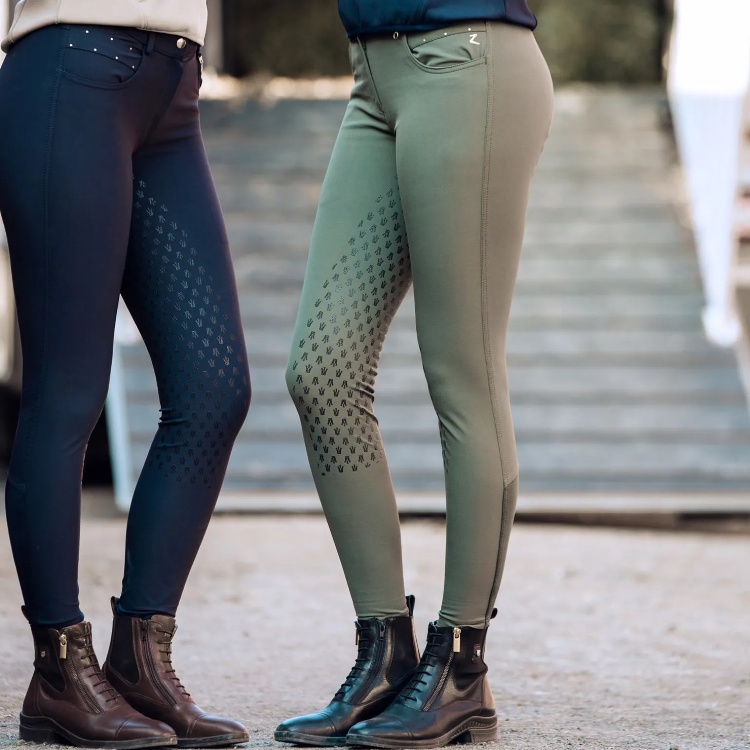 Horze Sienna helforsterket ridebukse med silikon til dame er nydelig og har masse trendy design, som bronseglitter på lommene og livet, og kronemotiv på silikontrykket, noe som hjelper med å holde deg i balanse og kontroll i salen. Frontlommene er ideelle for å ha med deg telefonen. Det fireveis stretch-stoffet er støttende og eksepsjonelt komfortabelt å bruke – perfekt for lange dager i stallen.