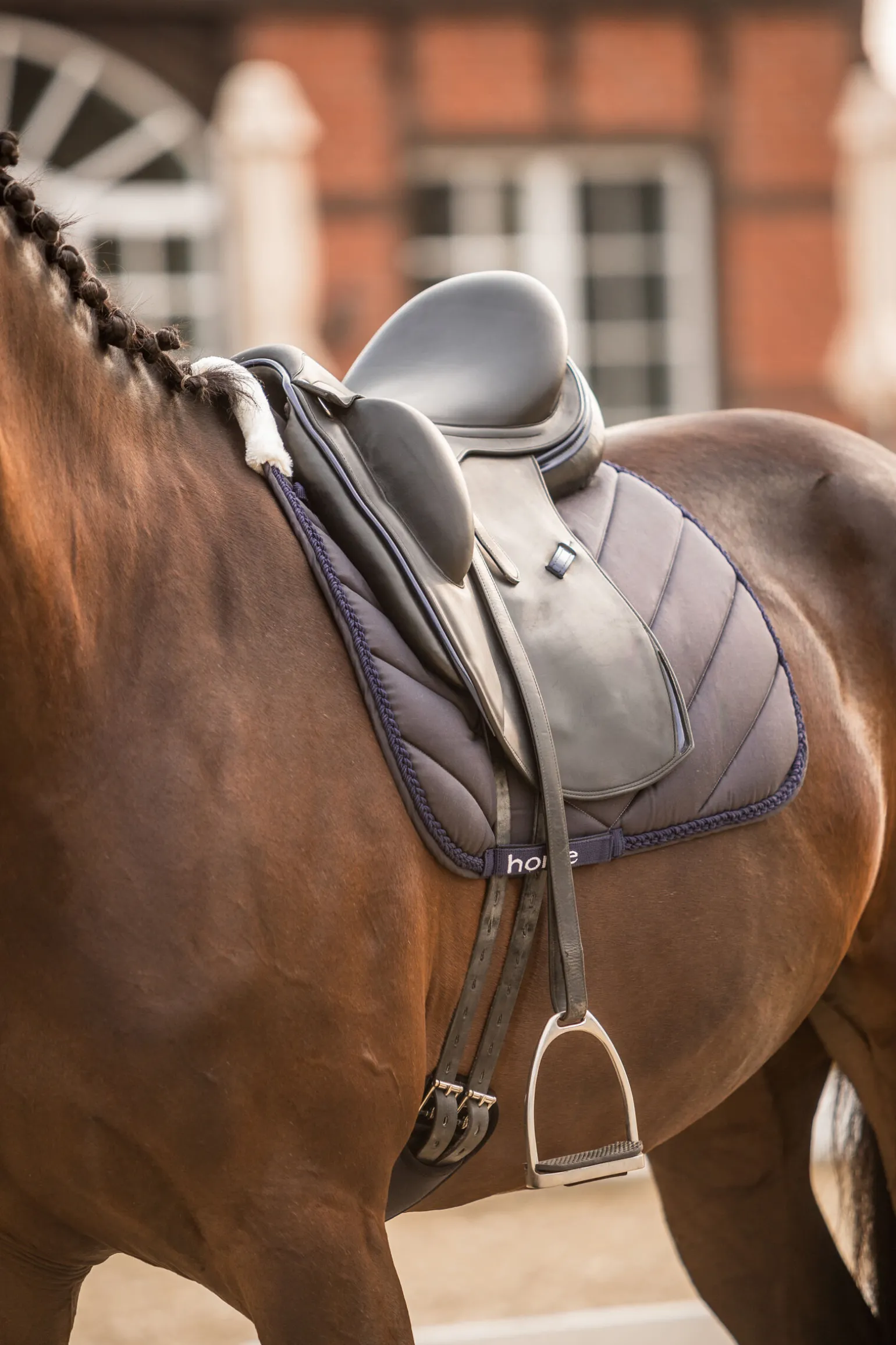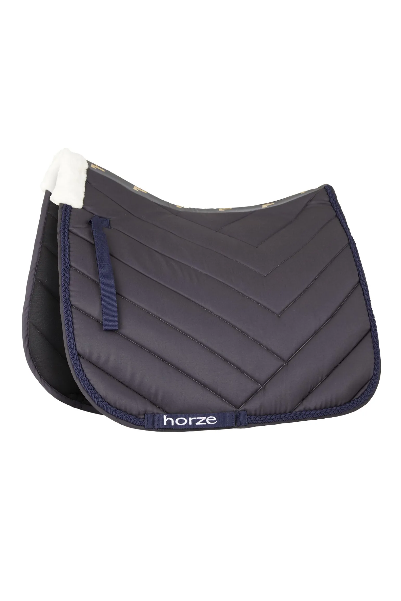 Vår Horze Victoria dressursjabrak er laget av mykt materiale med hurtigtørkende innside som trekker vekk fukt.Vattering i pilform gir et dynamisk preg.Behagelig fuskepels på manken gir komfort.Flott fletting rundt kantene gir et flott utseende, og logobåndet langs ryggraden gir et sporty utseende.Denne sjabraken er også tilgjengelig som allroundsjabrak.Bruk den med vår Horze Victoria ørehette (#22940) for et helhetlig utseende!