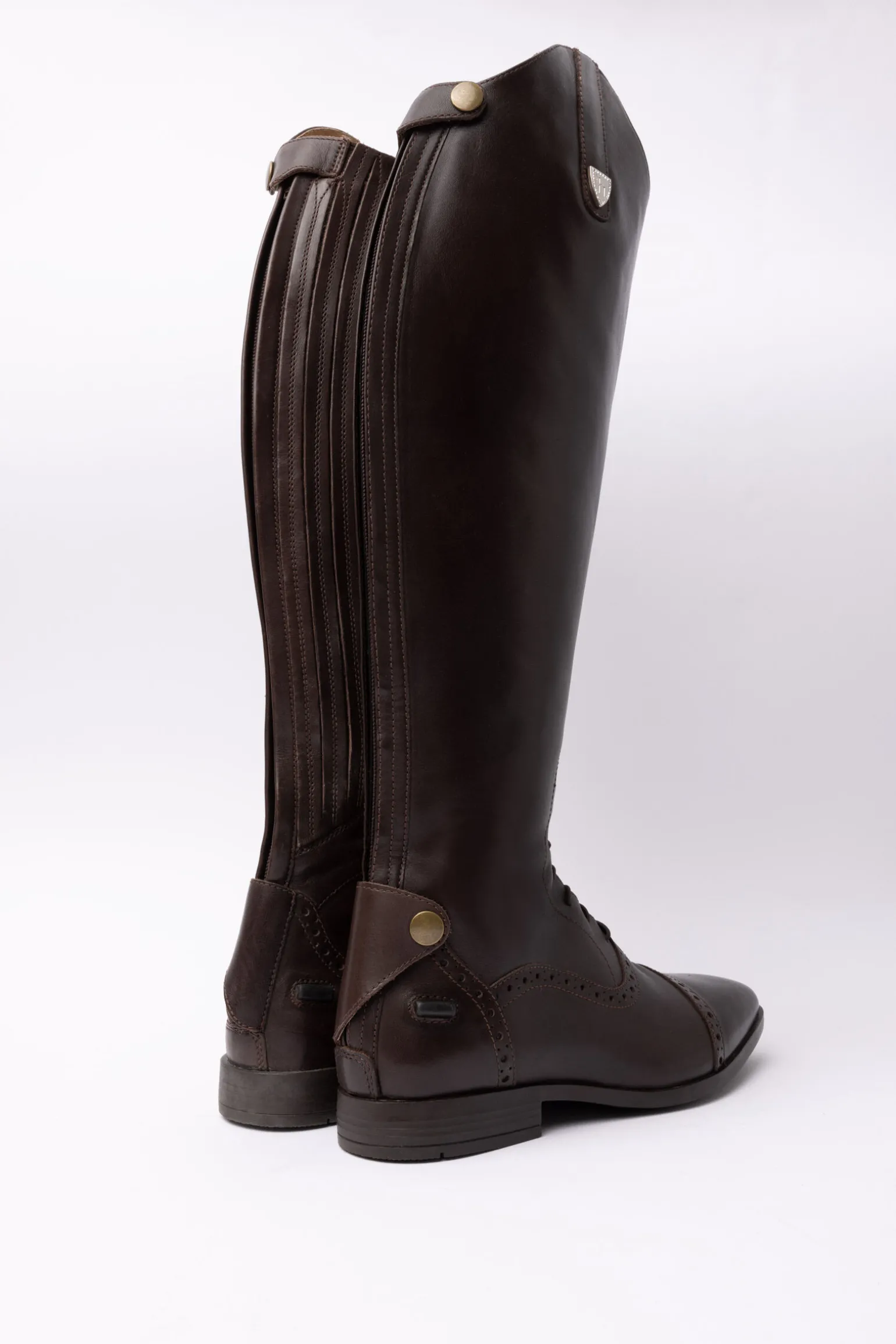 Høye støvler som er en nødvendighet for konkurranser når chaps og jodhpurs ikke fungerer. Disse nydelige støvlene laget i brasiliansk lær har glidelås bak, og en elastisk flapp for å se smale og elegante ut. En gummisåle og flere fotstørrelser og bredder gir god komfort. Foten har stemplede detaljer, fikserte elastiske lisser og fine støtter til sporene. Fôret er i myk, semsket for komfort. Z-emblem på toppen av leggen, som inkluderer en liten metallknapp med krystalldekt logo. En lærstropp med trykknapp på toppen og bunnen av glidelåsen sikrer at den ikke åpner seg.