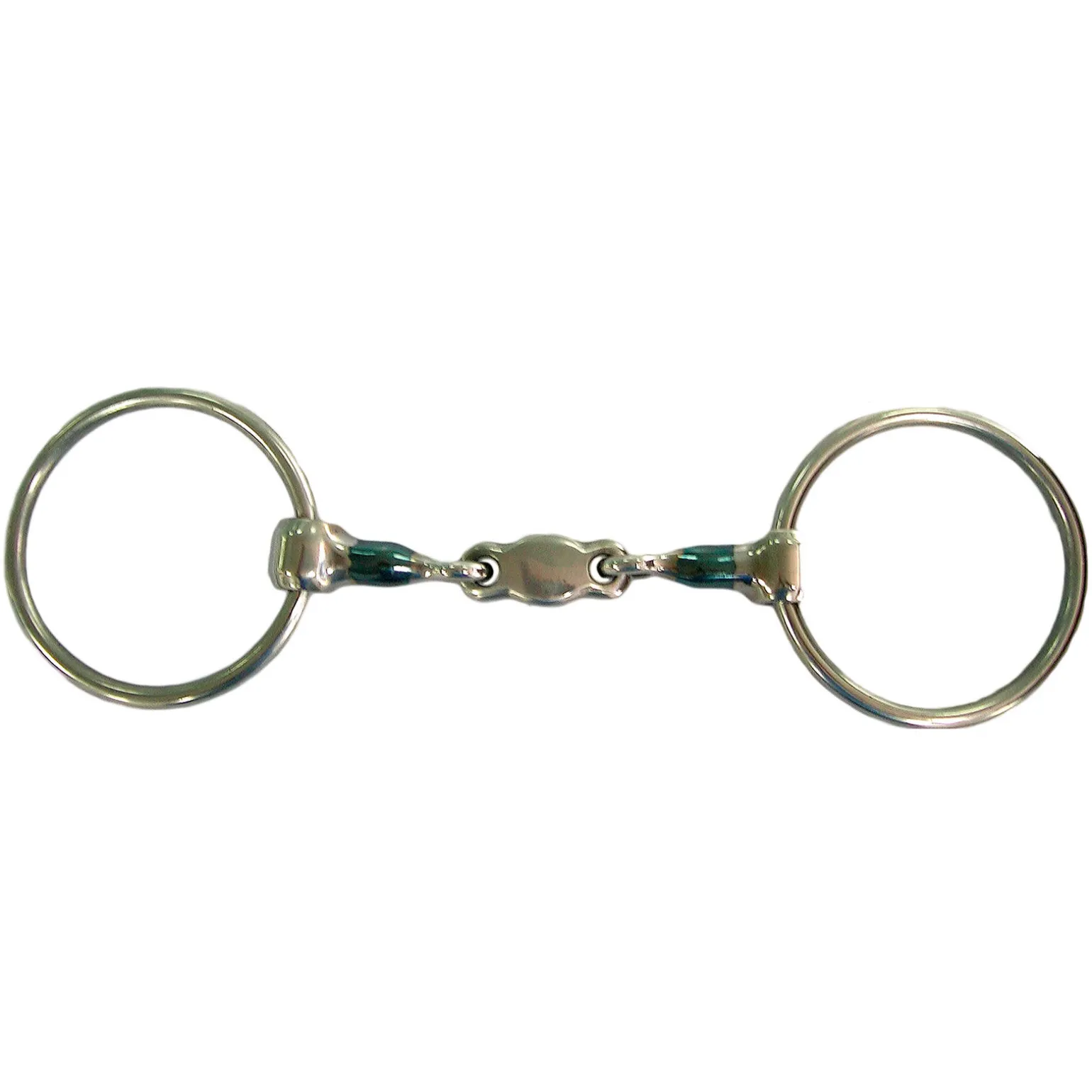 Enkelt og komfortabelt to-delt bitt i rustfritt stål med blått sweet iron, med et måneformet midtledd.