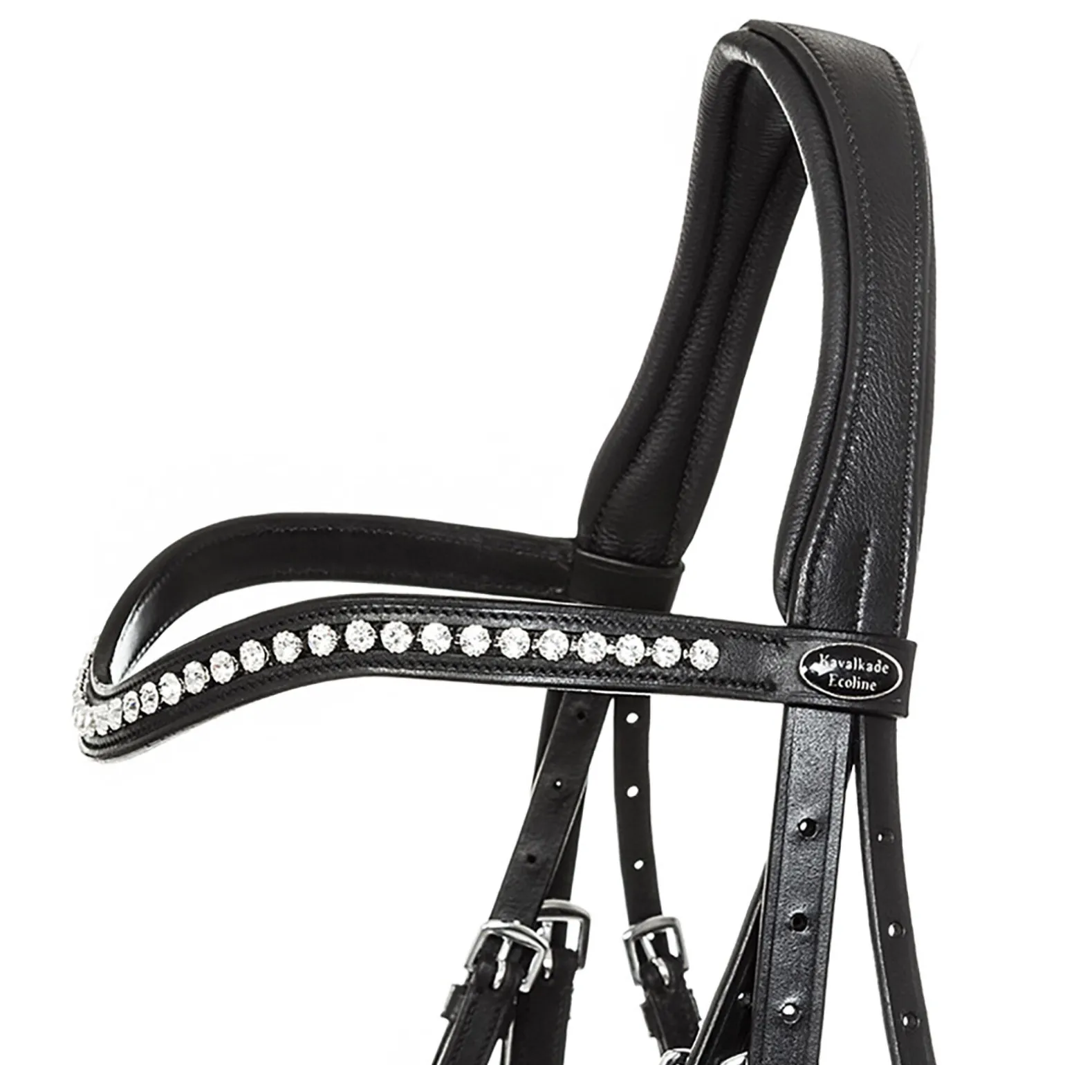 Engelsk nesereim, fast sydd. Polstret nakkestykke og nesereim. Spesiell nedre nesereim som festes på siden av neseborene og sikrer frihet til luftveiene. Ekstra bredt, buet nakkereim med frihet til ørene. Buet pannebånd med strass. Tøyler med gummi og stoppere.