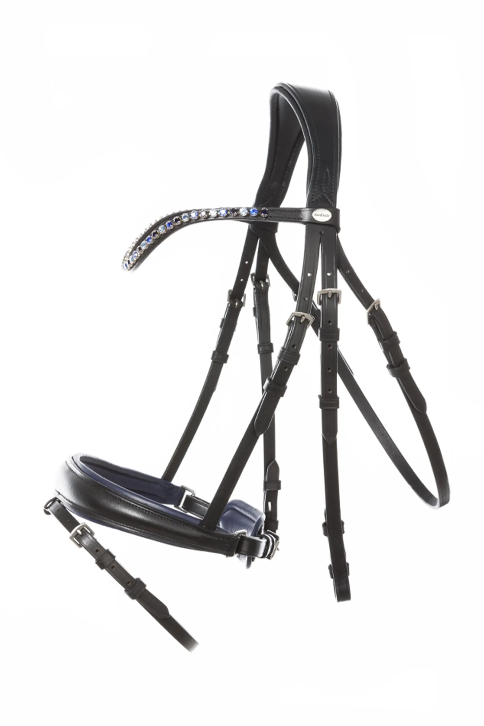 Det moteriktige hodelaget «Ocean» KavalSH4 med sin mørkeblå kantede nesereim og glitrende blå rhinestener på pannereimen er laget av høykvalitets lær og kan justeres på begge sider for optimal passform. Nakkestykket er anatomisk formet og ekstra bredt for å gi mer ørefrihet. Nesereimen er mykt polstret og anatomisk skåret. Gummibelagte tøyler med stoppere (16 mm). Matchende sporeremmer. KavalSH4 窶»KavalSH4″ er hodelag der nesereimen kan fjernes. Det spesielle med dette er at festet for nesereimen ikke er synlig, i motsetning til konvensjonelle hodelag med avtagbar nesereim.