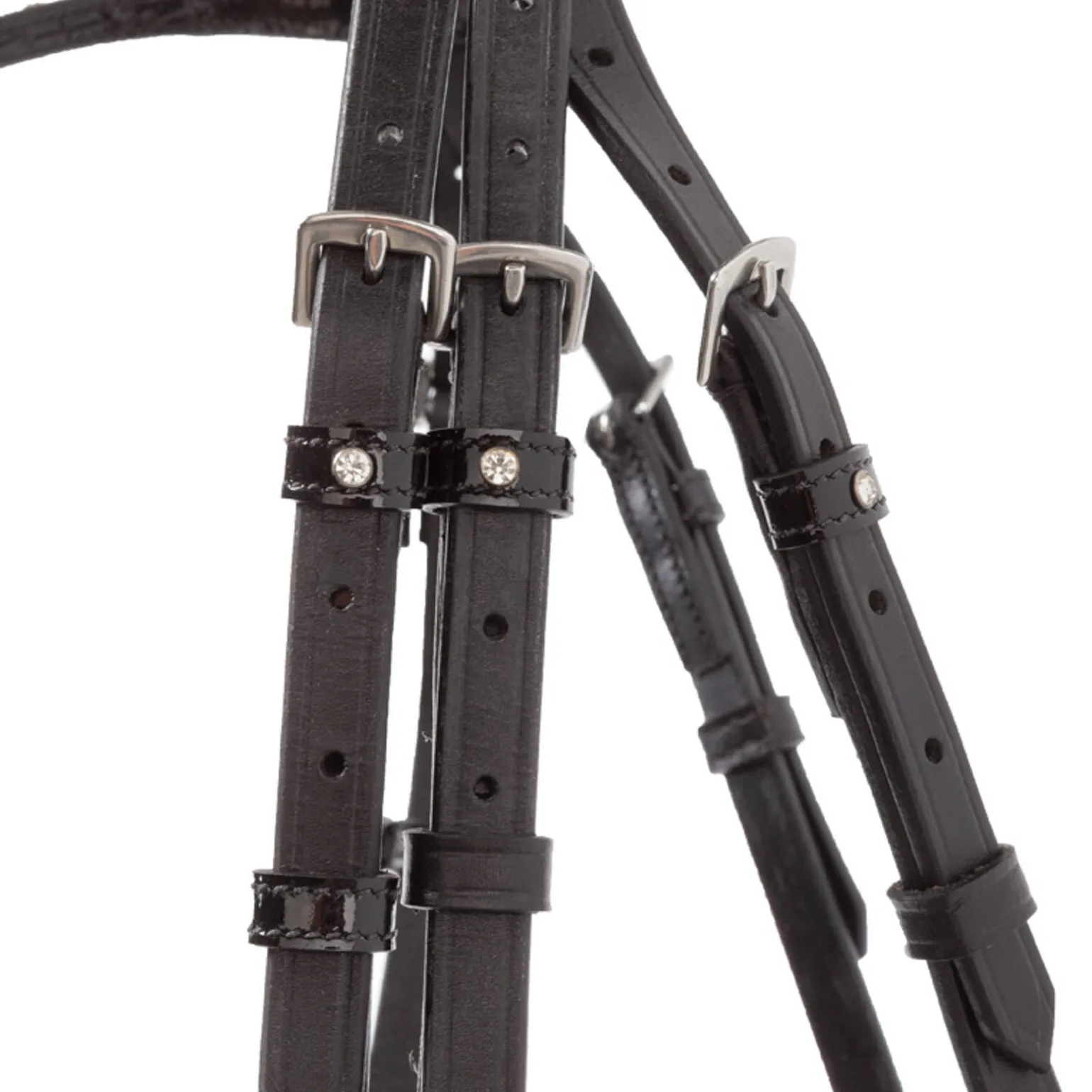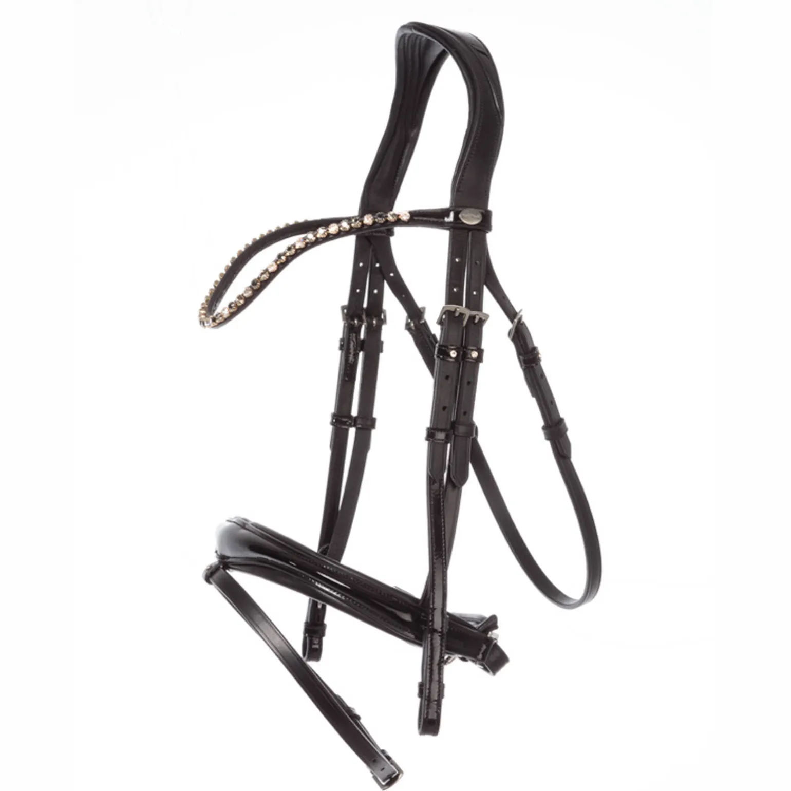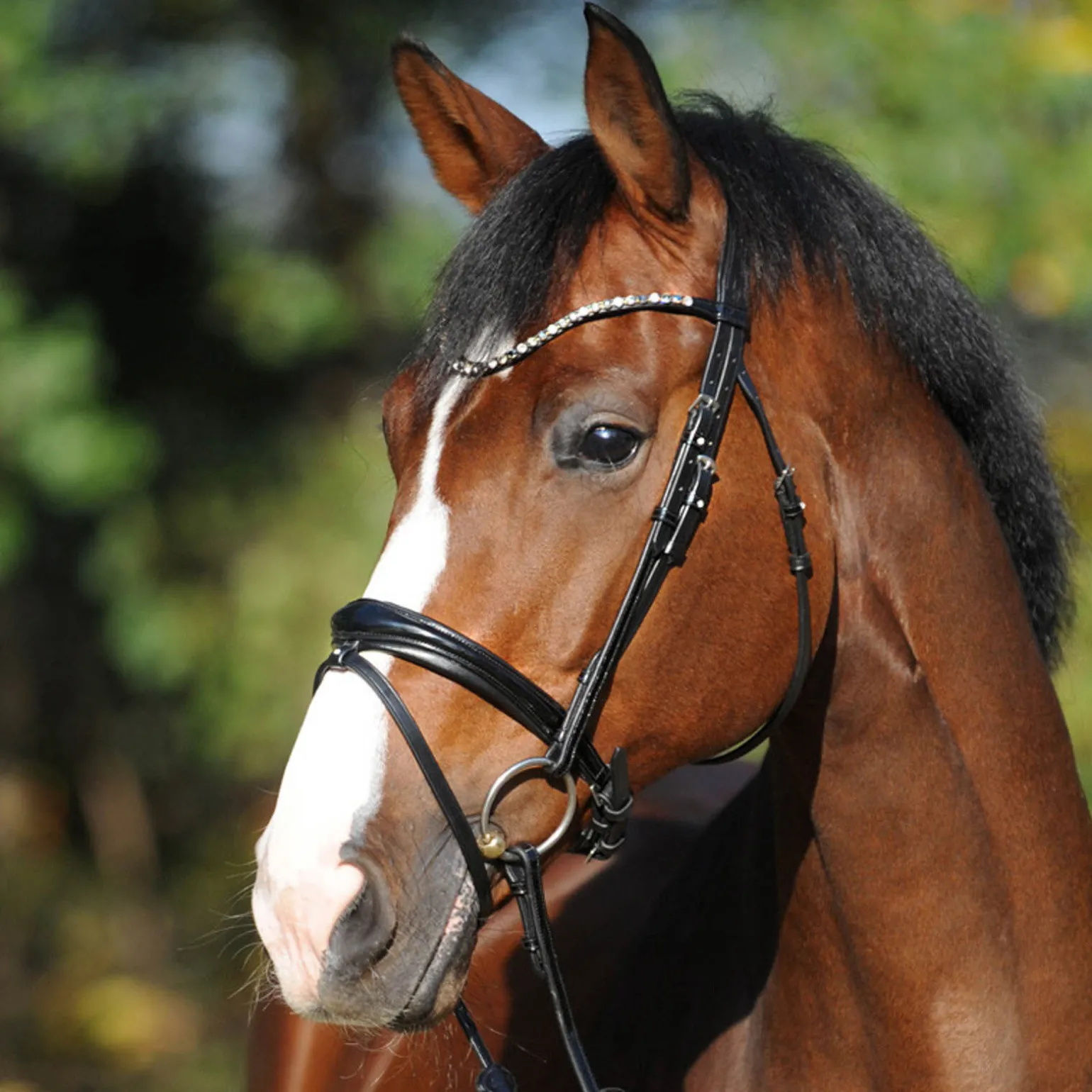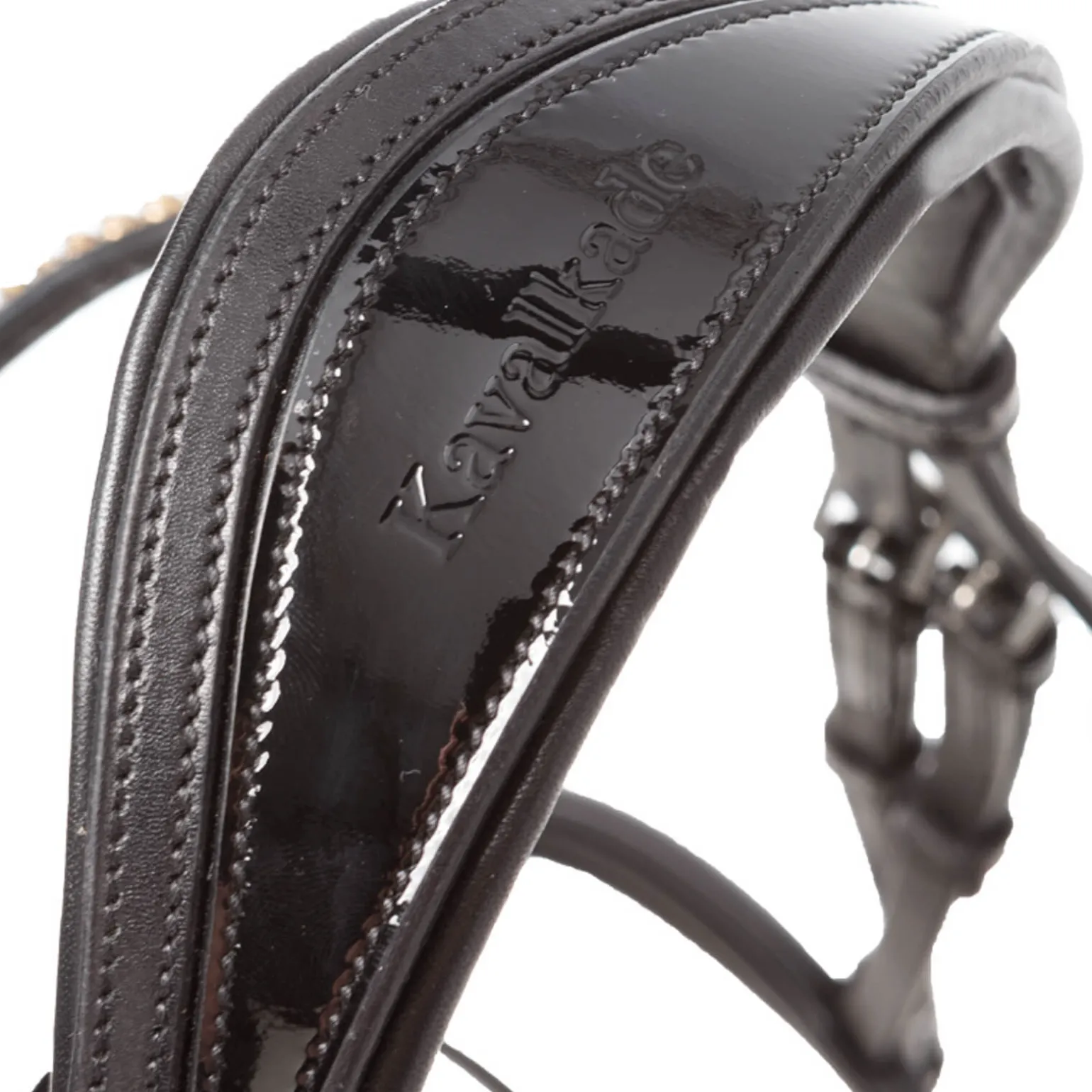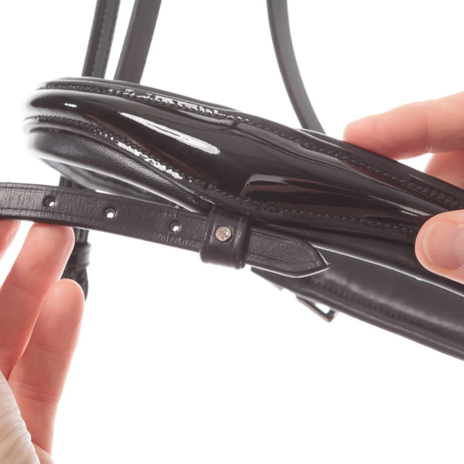 - Nakkestykket og kinnstykkene, nesereima, pannebåndet og lærløkkene er laget av lakkert lær