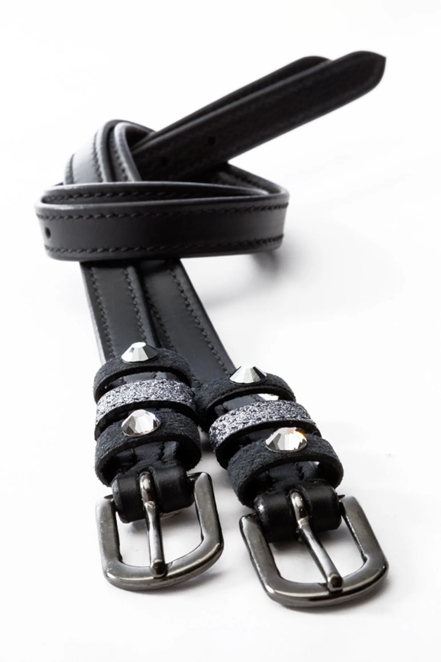 Sporeremmer «Grey» laget av mykt, slitesterkt kvalitetslær med grå rhinestones, spenner og glitterstriper på lærsløyfene. Selges i par.