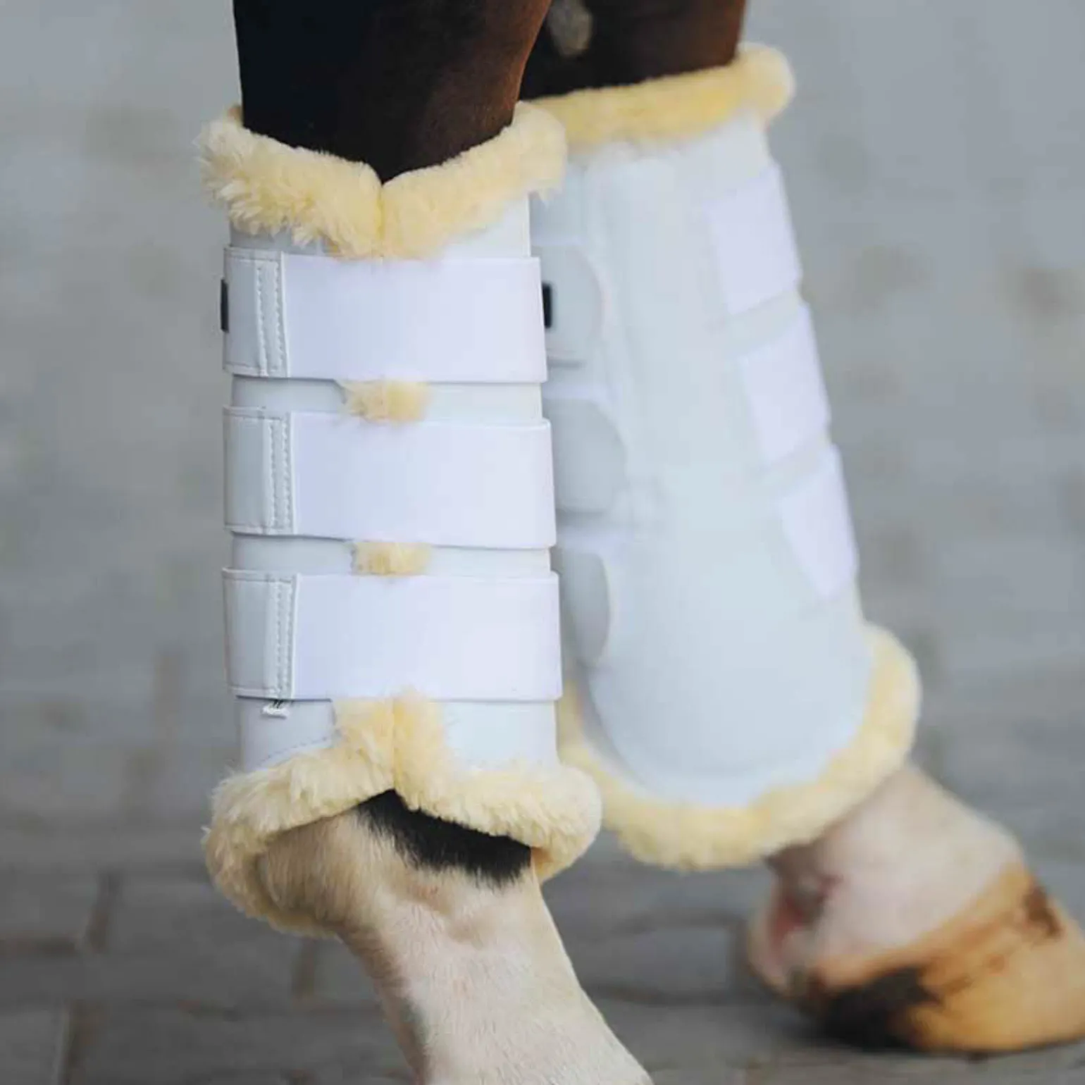 Robust belegg med behagelig teddypels på innsiden og syntetisk lær på utsiden.Tre borrelåslukkinger med strikk sikrer at de holder seg trygt på.Samme modell for fram- og bakbein, men ta en størrelse større for bakbeina.