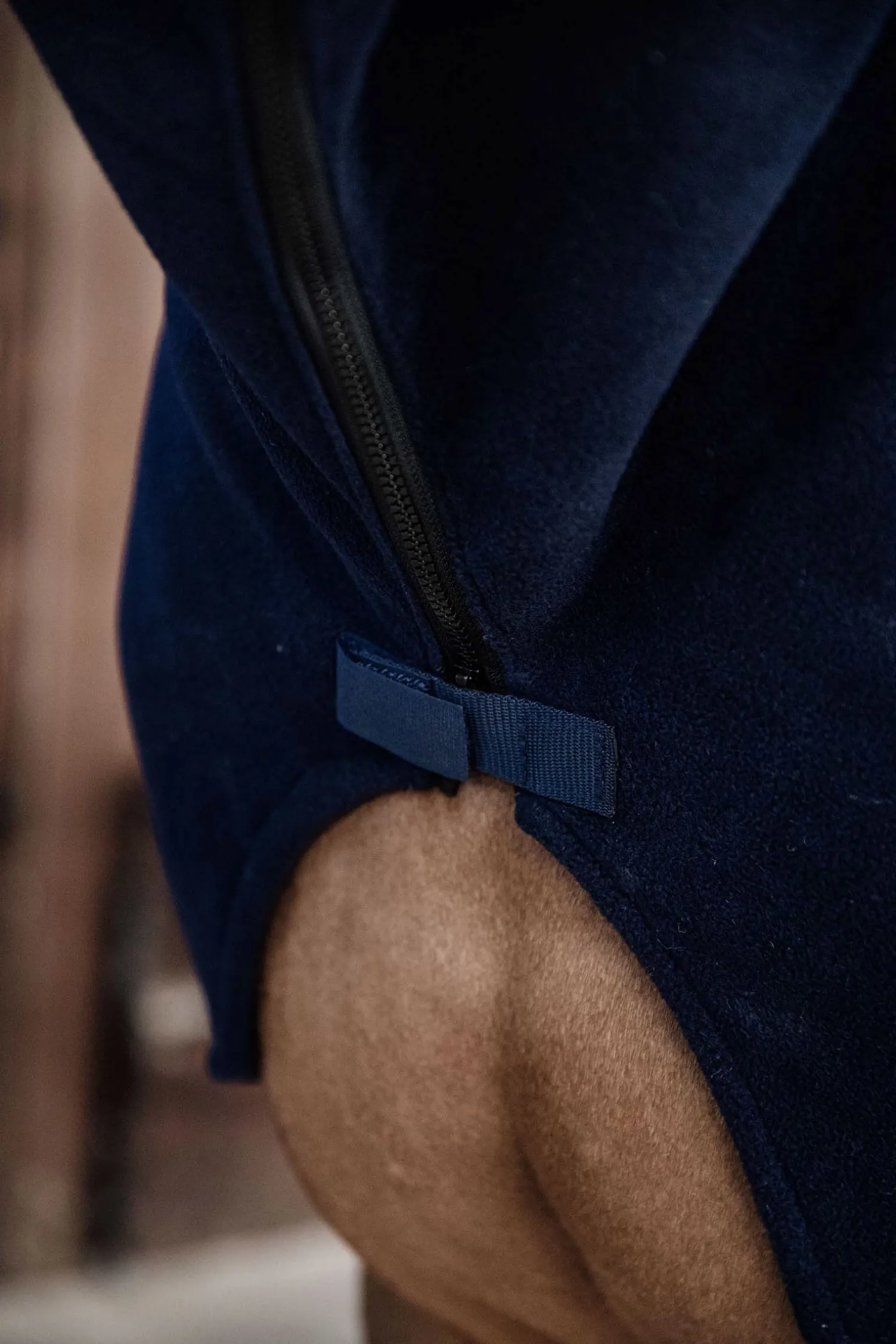 Denne Cooler Fleece Horse Scarf gir alle fordelene med et Kentucky-dekken til hestens hals. For dette skjerfet bruker vi det samme stoffet som vårt populære Cooler Fleece-dekken, så det er ideelt for å tørke hesten etter ridning eller bading eller for bruk på kaldere dager i stallen. Det er også svært pustende og derfor egnet under transport. Dette skjerfet kan enkelt kombineres med ethvert dekken. Det er veldig enkelt å ta på eller av takket være glidelåsen under halsen. En liten krok- og løkkelukking ved nakken kan festes til grime for å holde skjerfet på plass. Halsbåndet er elastisk og gir en bedre passform samtidig som det respekterer hestens komfort. Halsen kan vaskes på 30 grader, for å beskytte skjerfet under vask anbefaler vi å lukke glidelåsen.
