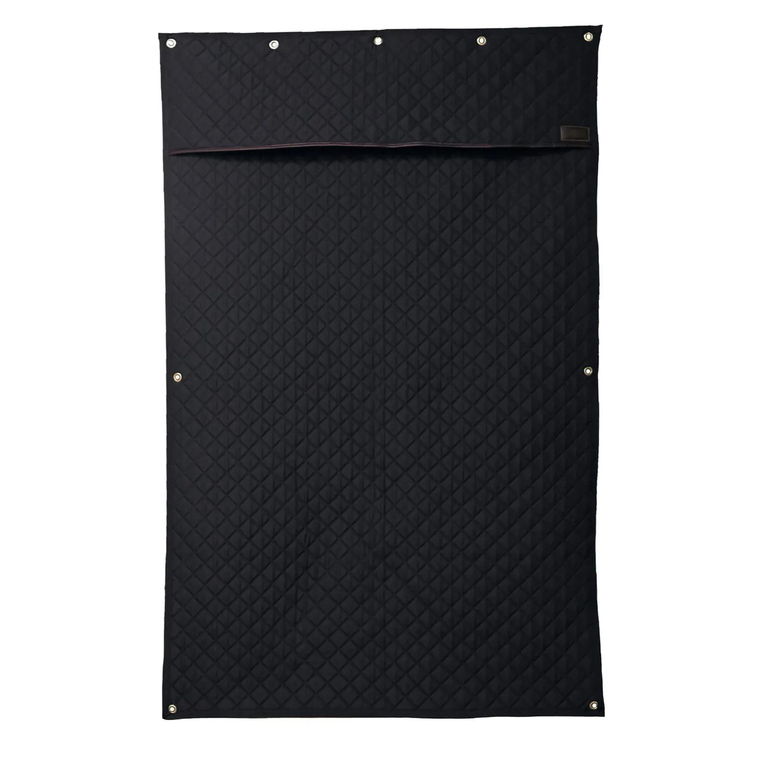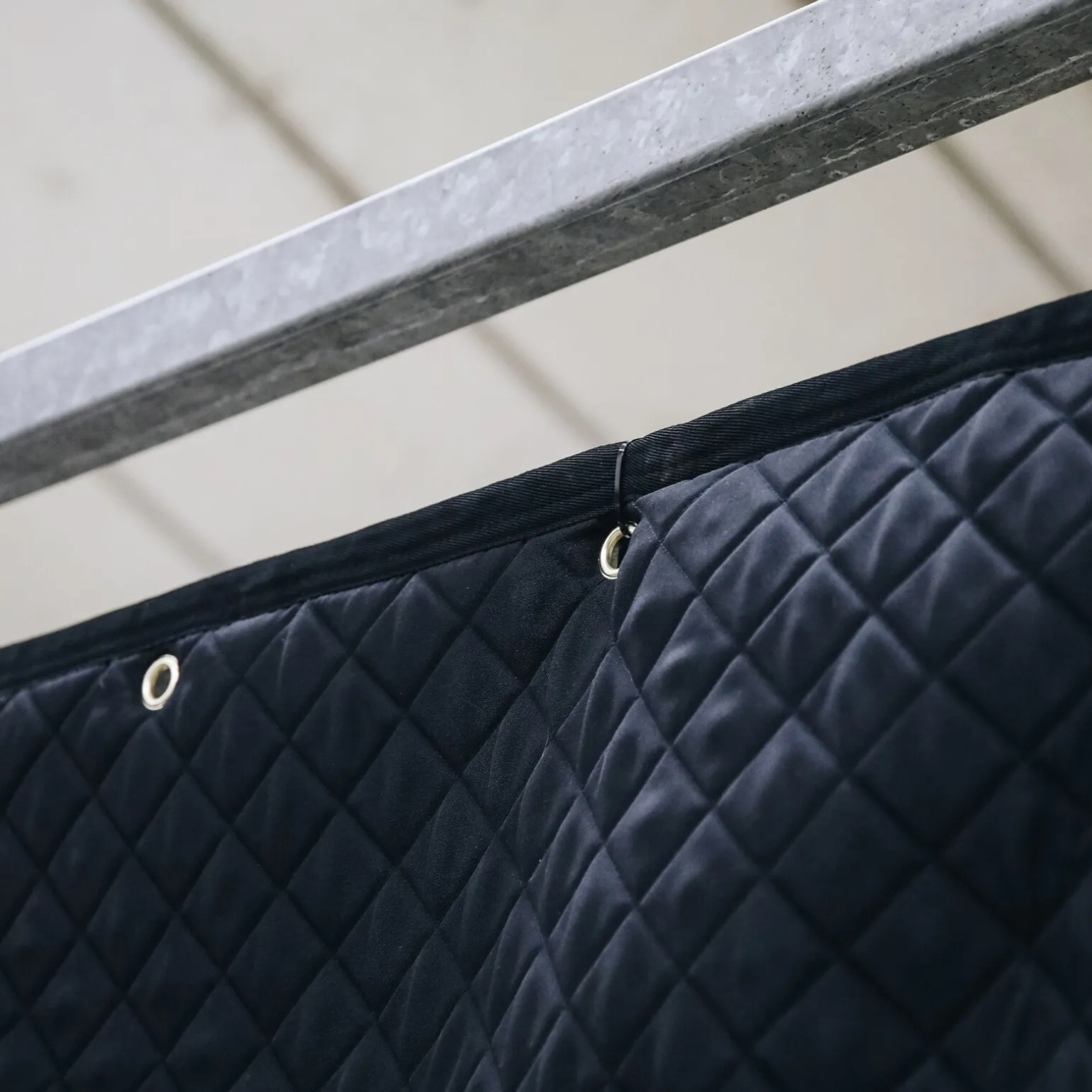 The Kentucky Stable Curtain offers your horse the well deserved rest on the show or at home. This Stable Curtain features five gold coloured, reinforced rings to attach to the stall. Under the flap are five snap hooks to attach accessories to such as bridles, rack for rugs, grooming hook,… The snap hooks are carefully put away behind the flap with artificial leather Kentucky logo so you don窶冲 see them. The Diamond Quilting Pattern, the artificial leather piping on the flap and the fancy artificial leather Kentucky logo all contribute to this fancy look. The Stable Curtain is a perfect match to our Head Protector and Stable Guard. It is made out of 600D High Tenacity Polyester and is machine washable at 30°, no dryer.