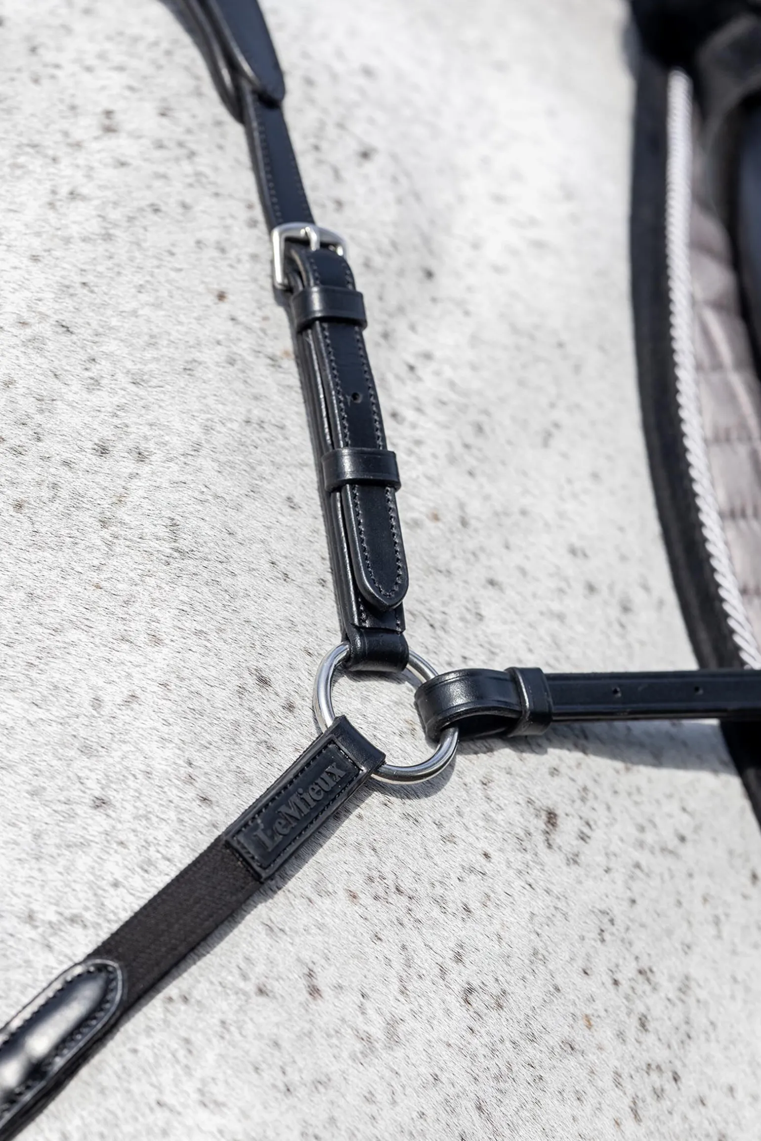 LeMieux fortøy med avtakbar martingal er en ideell løsning, med et smart utseende og praktisk funksjonalitet.Et justerbart toppstykke med myk lærpolstring ved manken festes til de elastiske festestroppene.Den polstrede delen bak festet på brystet gir komfort til hesten. Fortøyet kommer med en avtakbar, løpende martingal som festes med praktiske klips. Robuste metallspenner som er enkle å bruke.De spesialdesignede martingal-ringene klipses enkelt på og av tøylene uten at du trenger å ta dem av.Lærprodukter fra LeMieux er laget i nydelig, europeisk lær, og er designet for å fordele trykk og maksimere komfort.