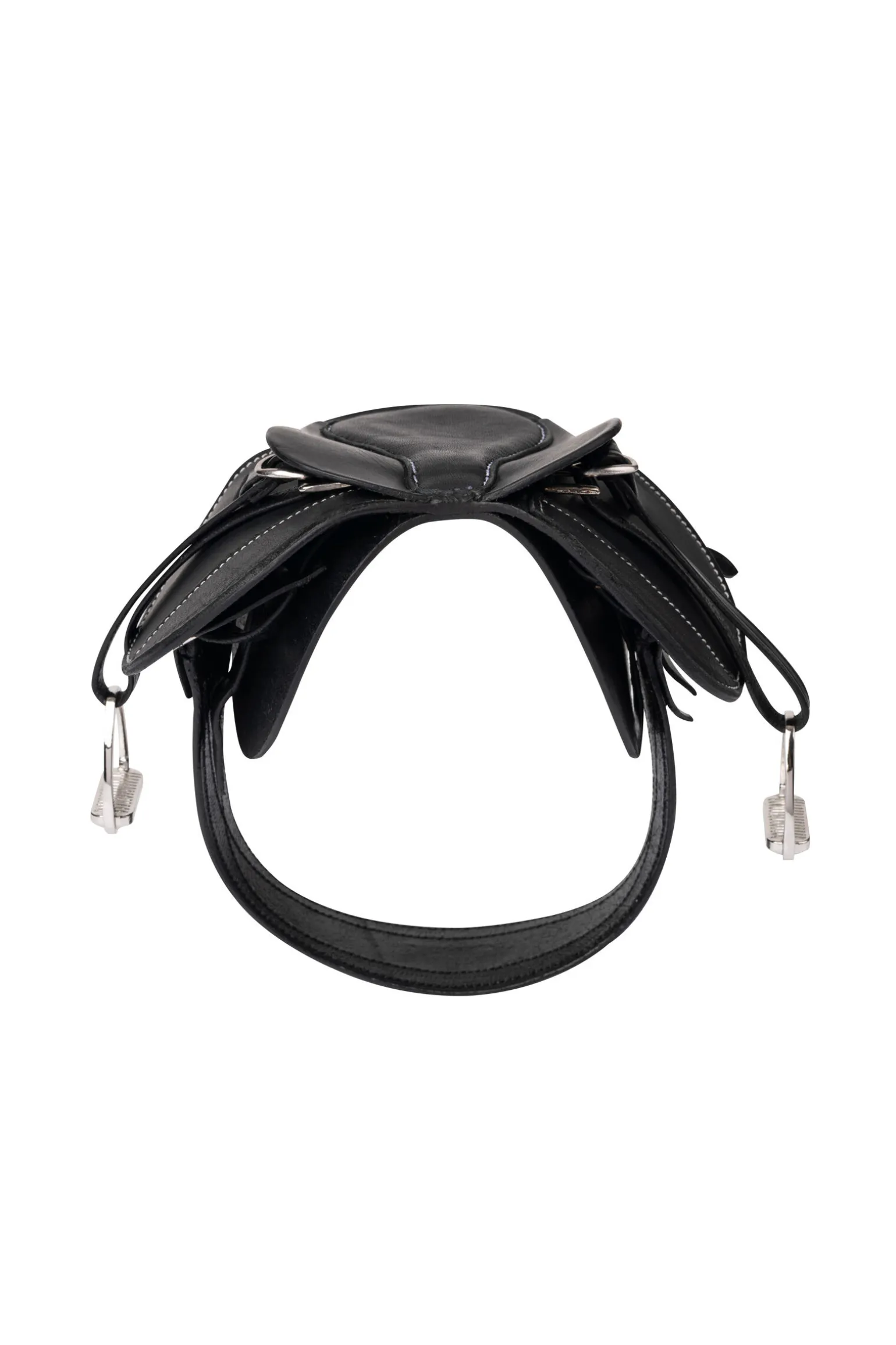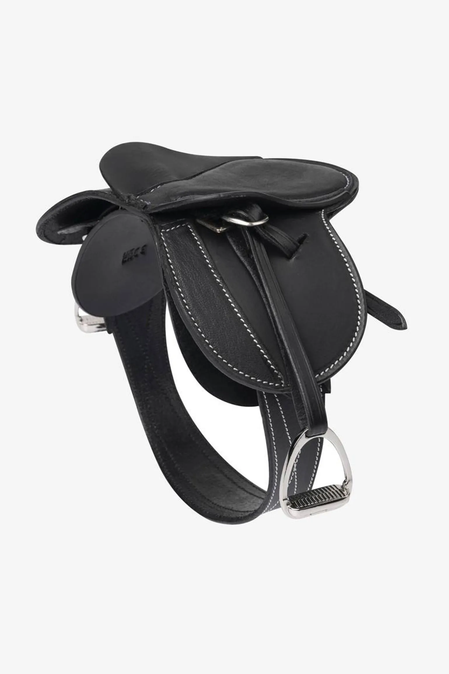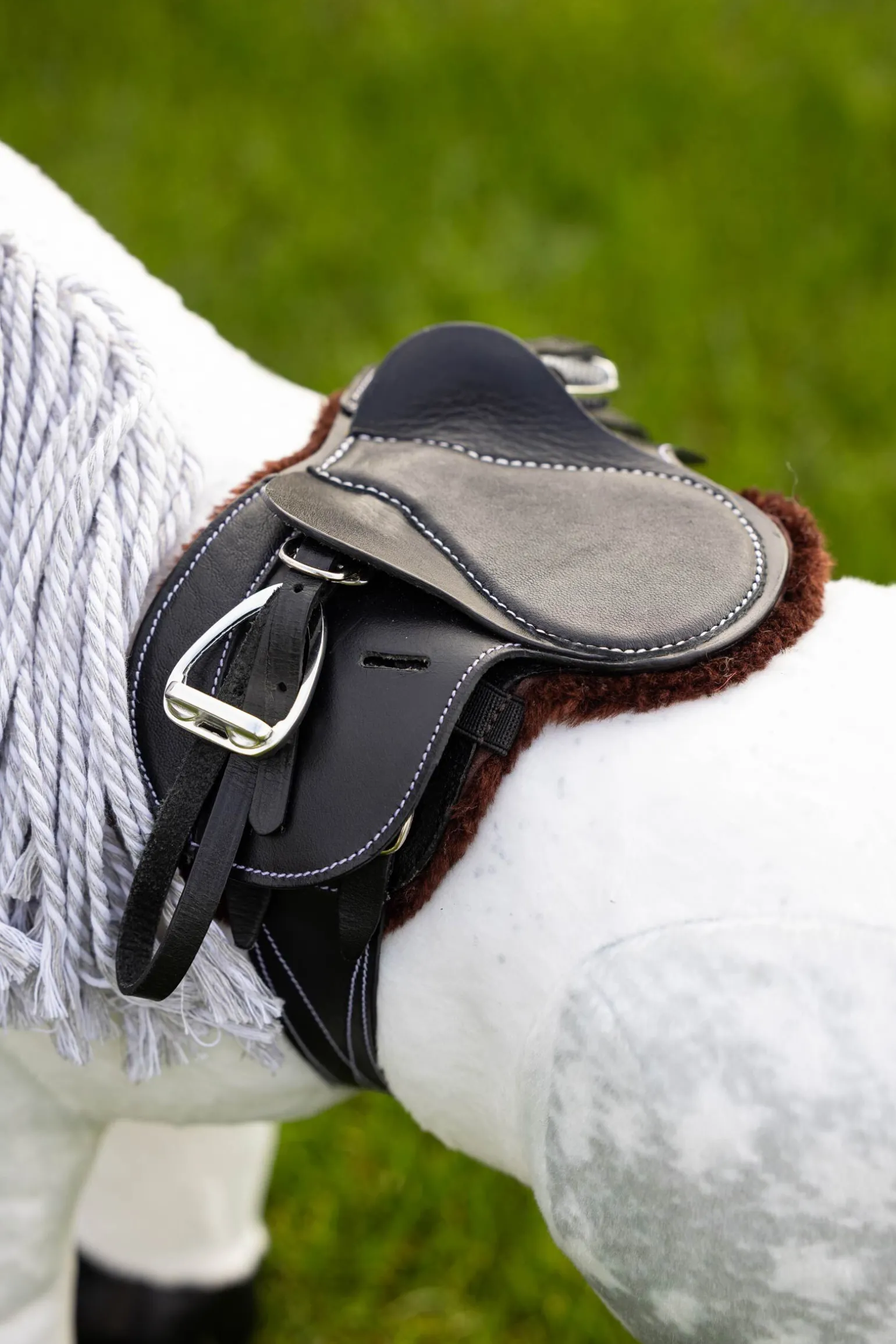 Utsøkt utformet miniatyrsal i vakkert, finnarvet lær.Ordentlig design, med dobbel salkappe, tre gjordstropper og spennebeskyttere.Kommer komplett med avtakbar gjord og metallstigbøyler, noe som gjør denne ideell for å lære om deler av salen, øve på oppsaling og pussing av utstyr.